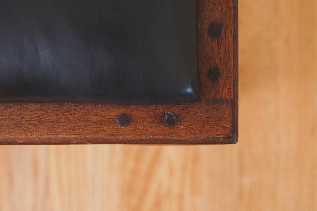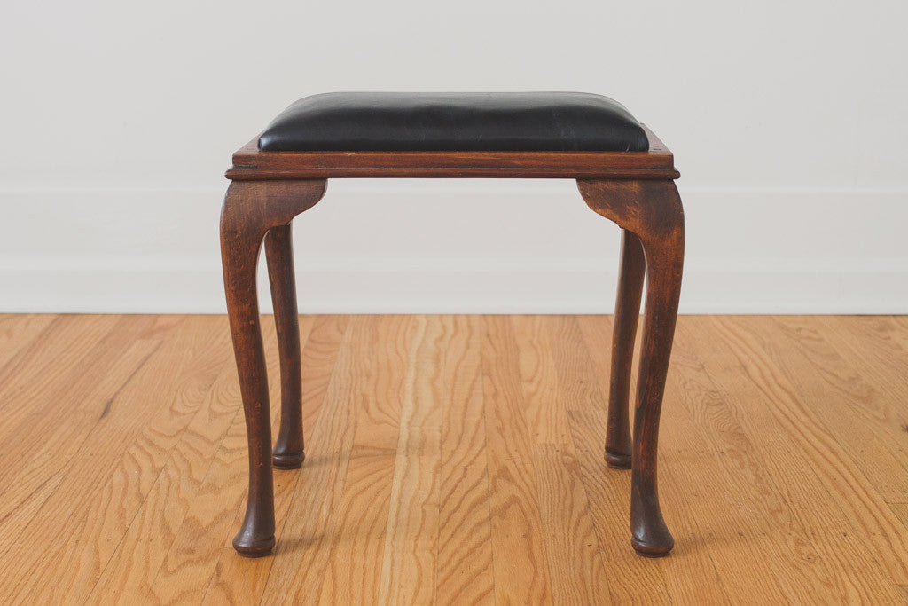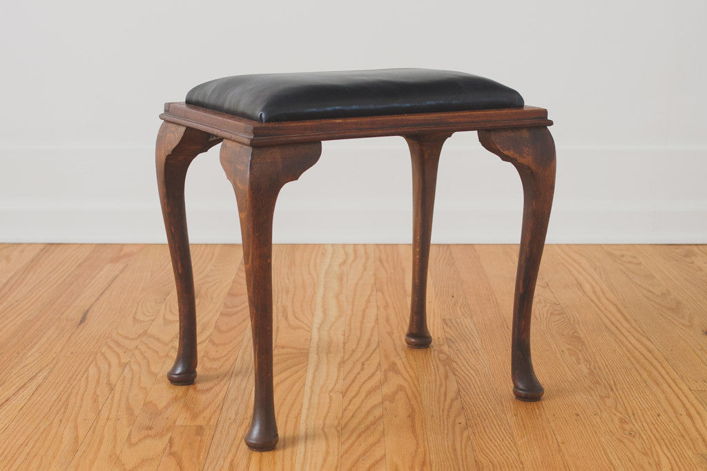 This vintage vanity stool has black leather upholstery and a dark oak frame. It's sturdy and in good shape with age related wear. See pictures for detailed condition.