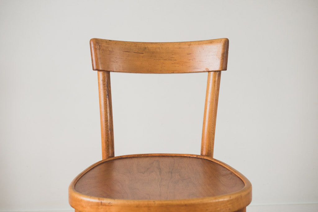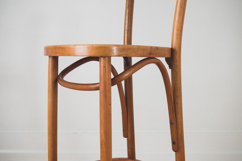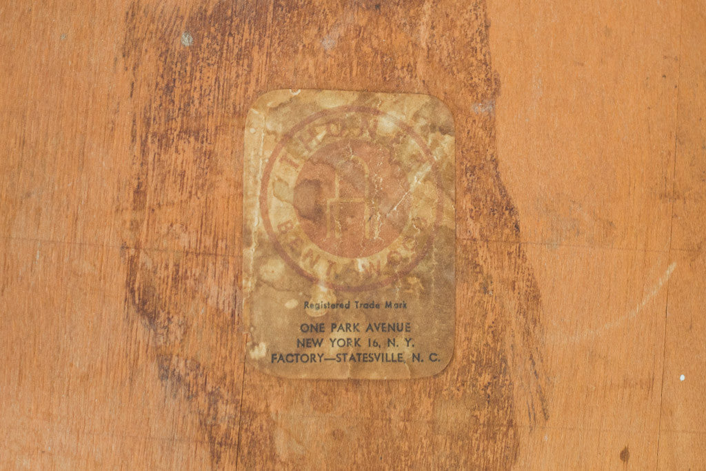 This set of three bar stools were manufactured in North Carolina by Thonet. They have wood frames with footrests, backrests and original labels. They're sturdy and in good shape with age related wear. See pictures for detailed condition.