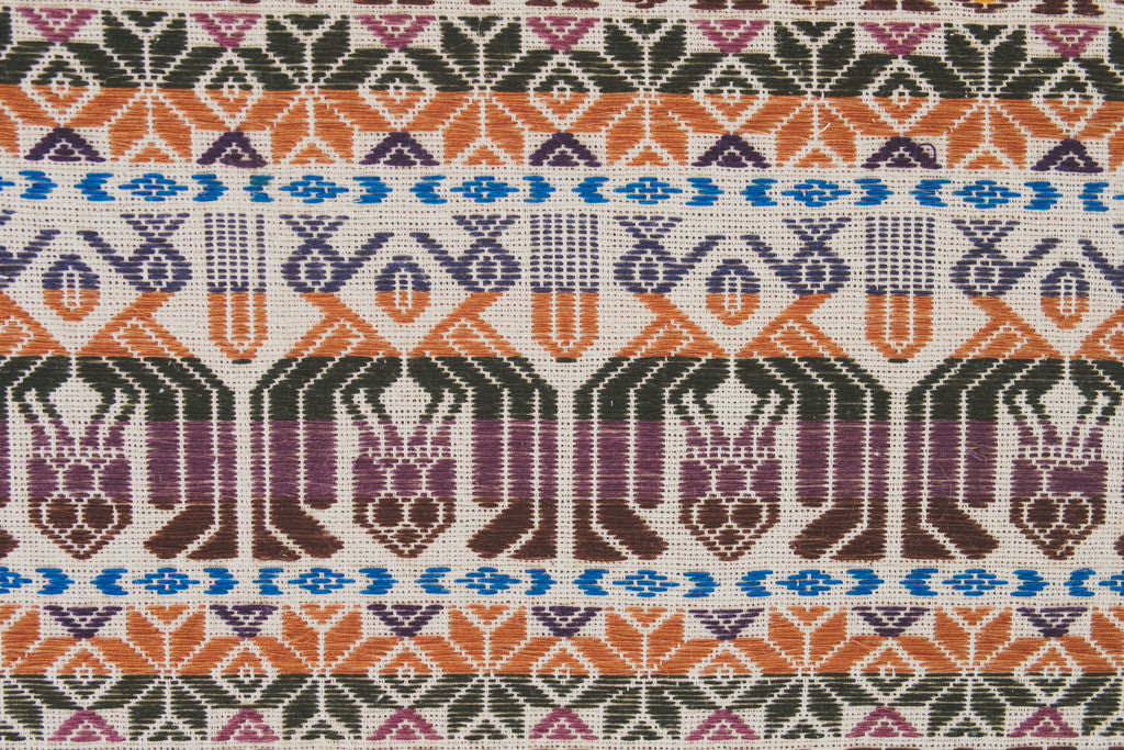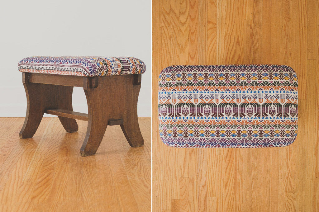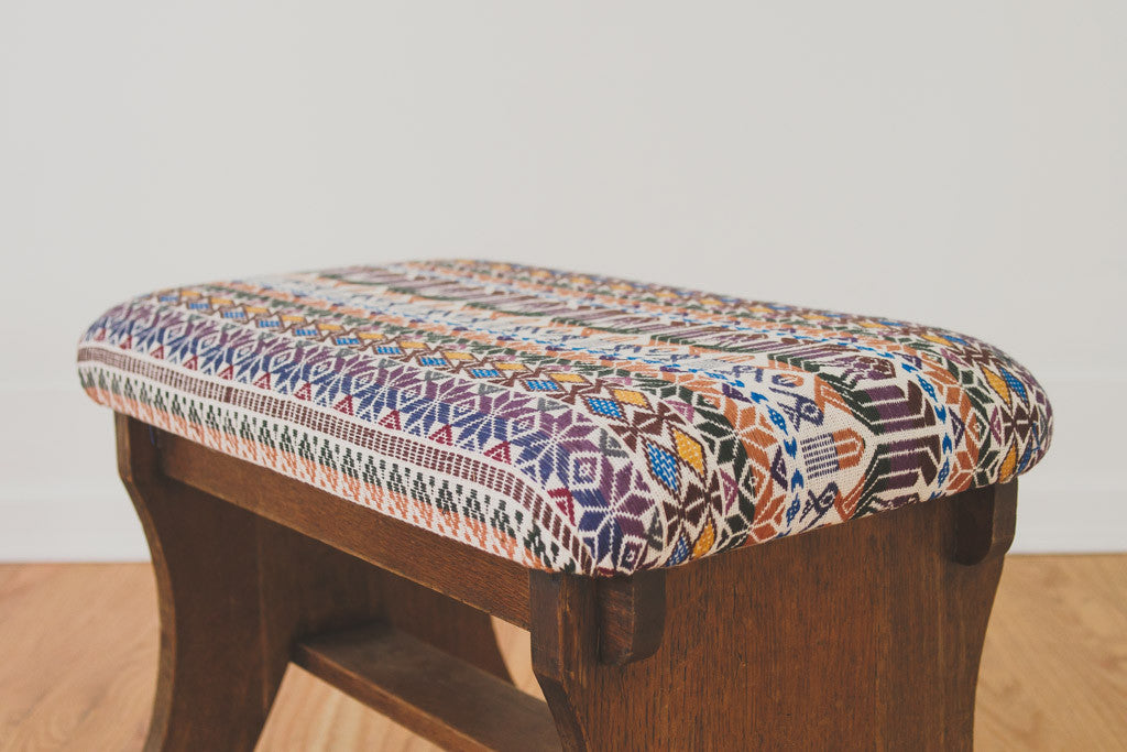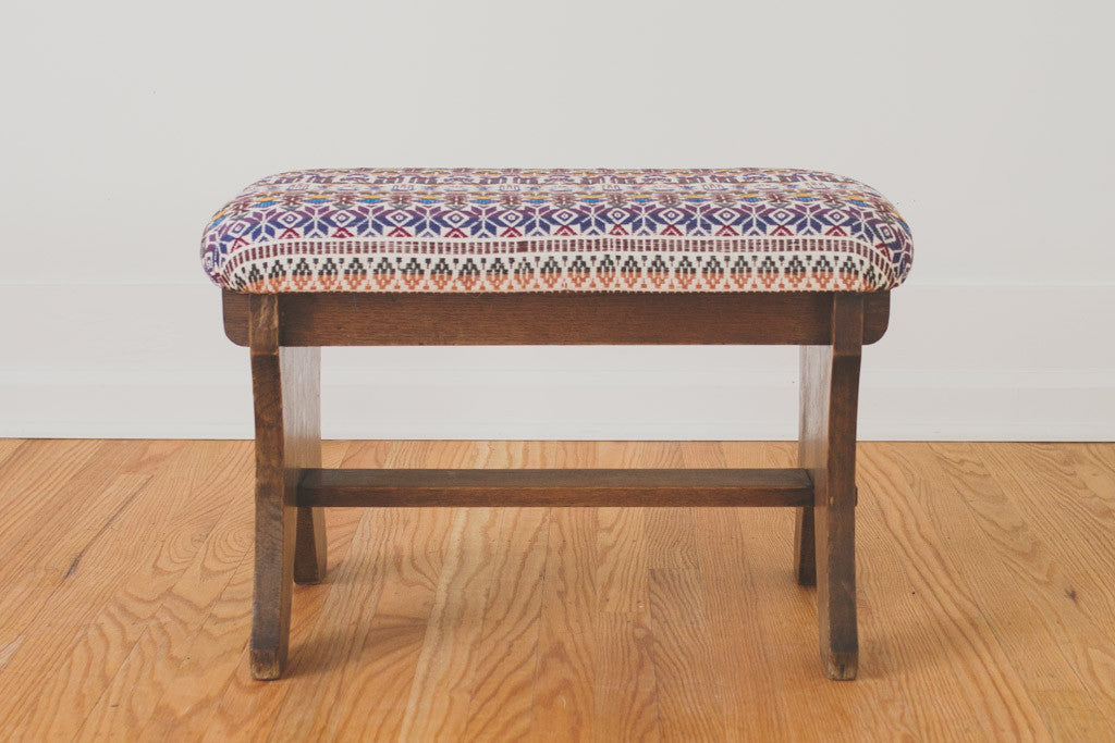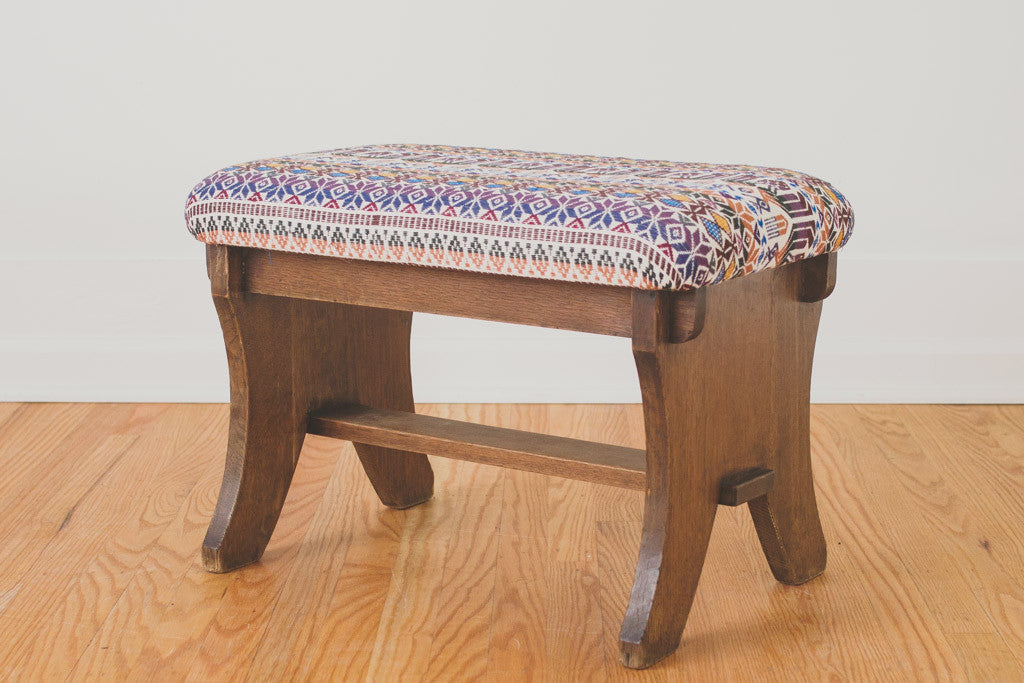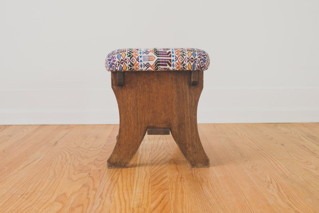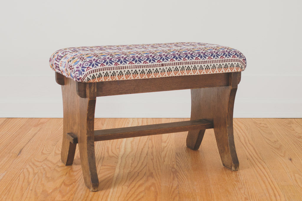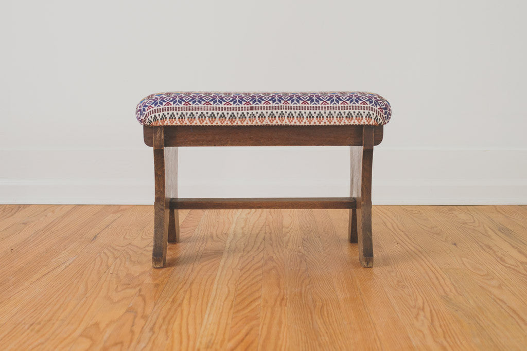 This vintage bench is part of our HS Collection. It has an oak frame topped with new foam and upholstered in a colorful South American fabric. Perfect for extra seating or used as an ottoman. It's sturdy and in great shape with age related wear. Please see pictures for detailed condition.
