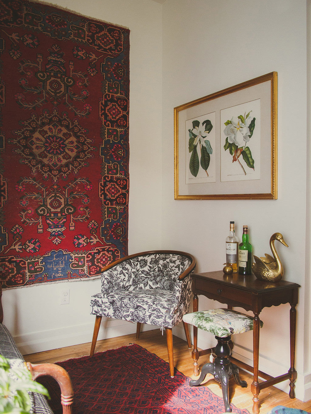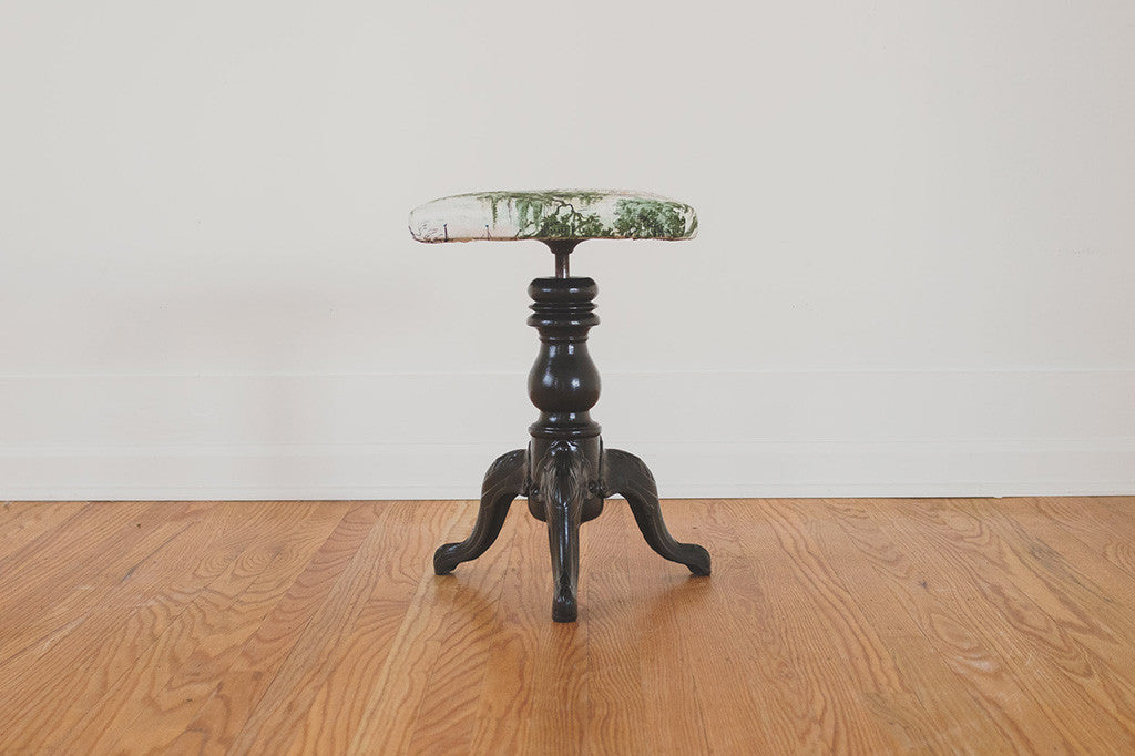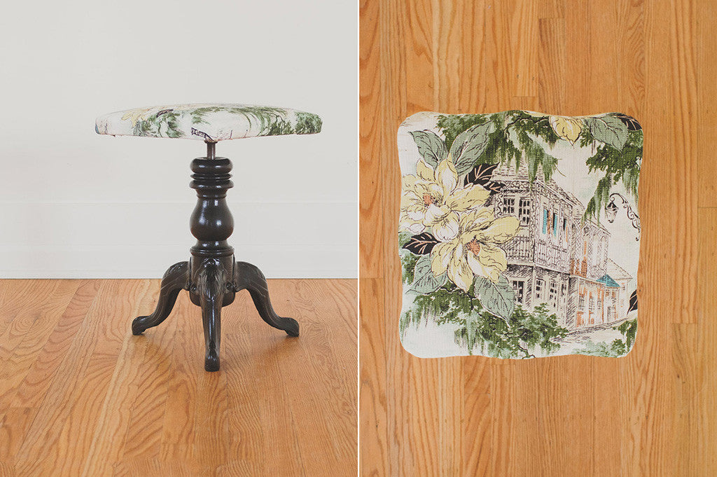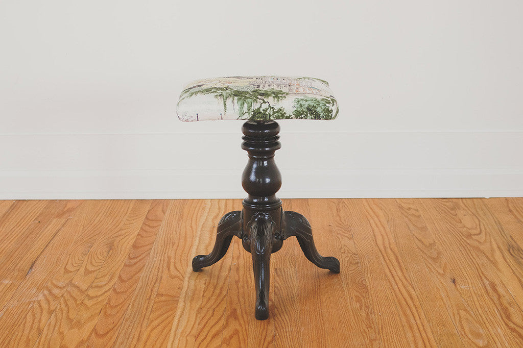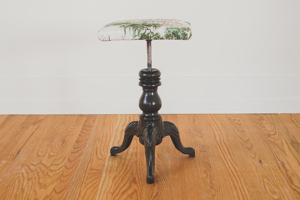 This vintage adjustable height piano stool is part of our HS Collection. It has a black painted wood and cast iron base with magnolia toile upholstery. It's in excellent shape with age related wear to the frame. Please see pictures for detailed condition.