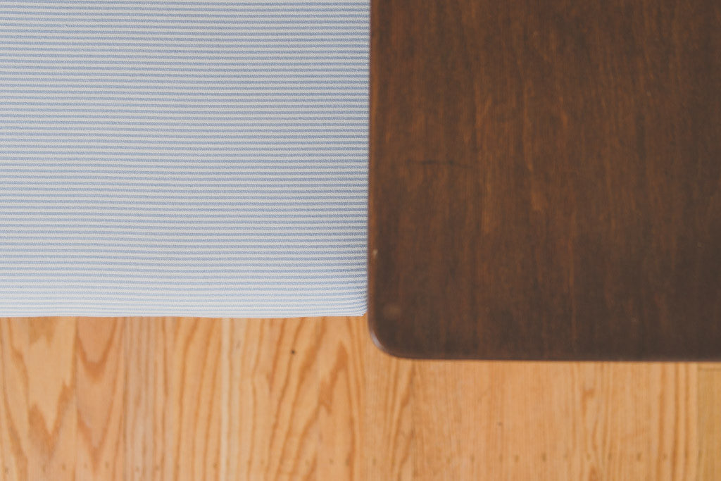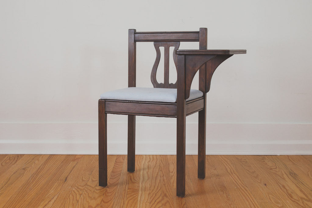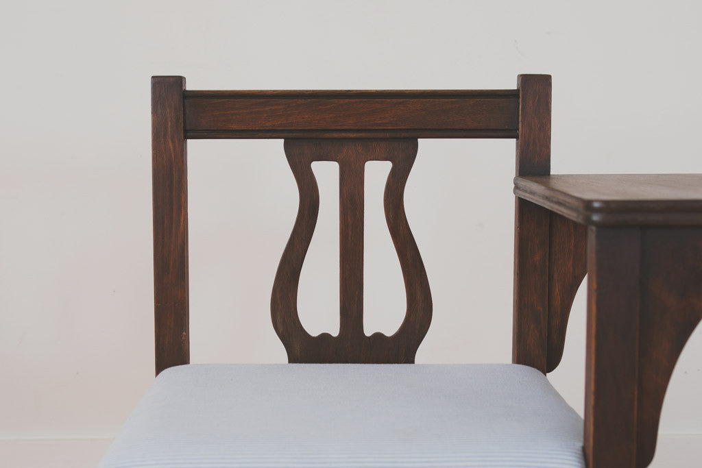 This vintage telephone table has a walnut frame with shelf, under seat storage, blue ticking stripe upholstery and a carved wood frame. It's in good shape with some age related wear. Please see pictures for detailed condition.