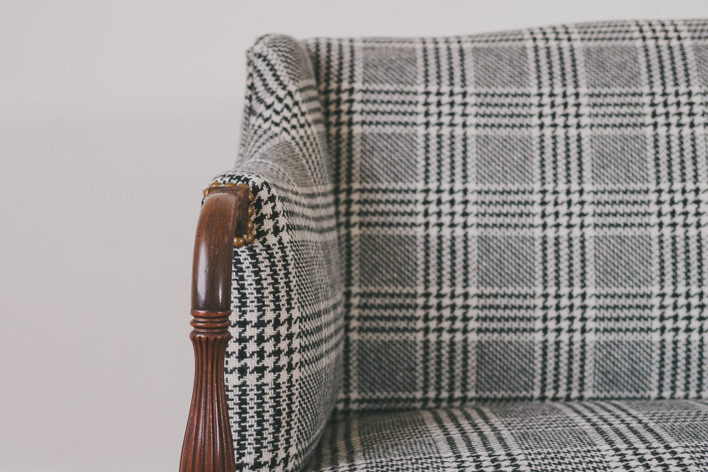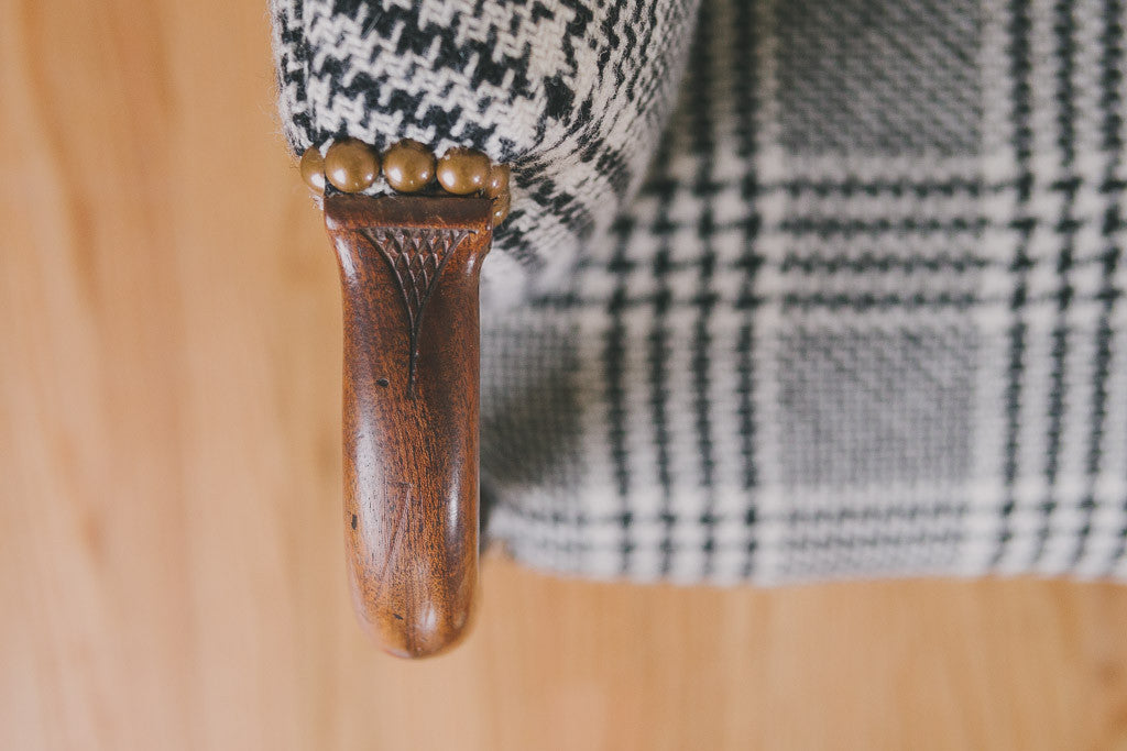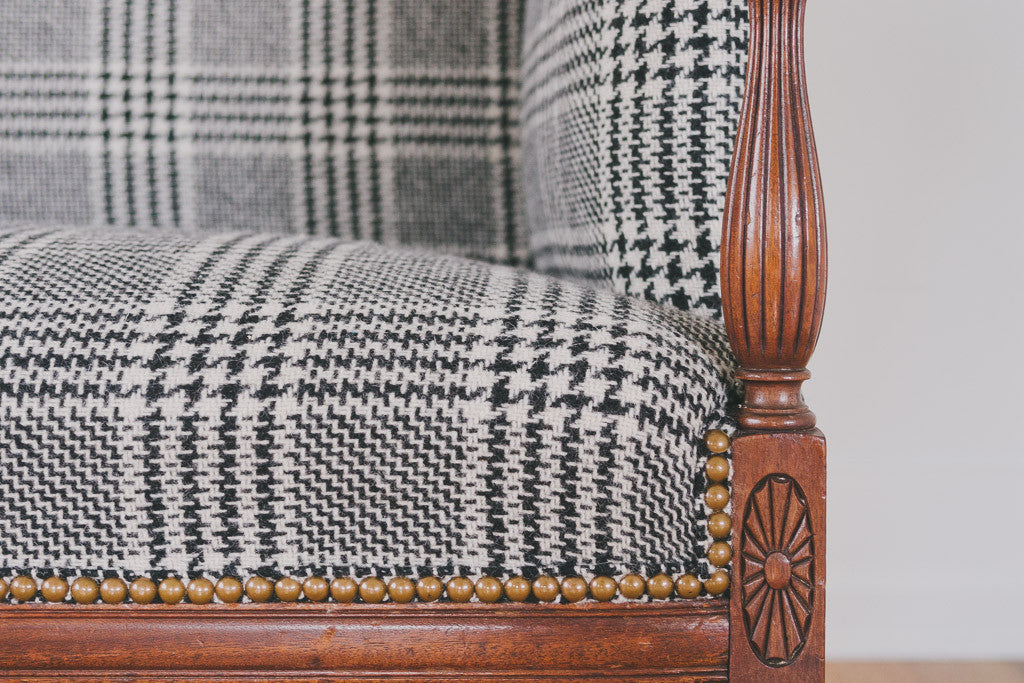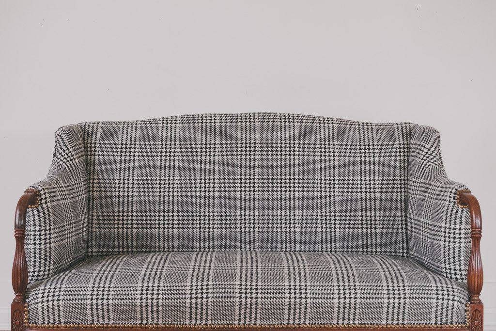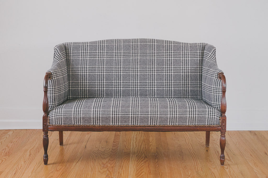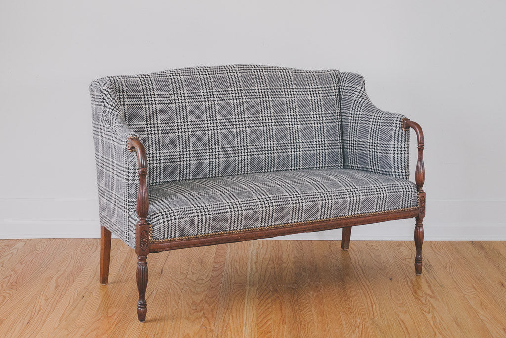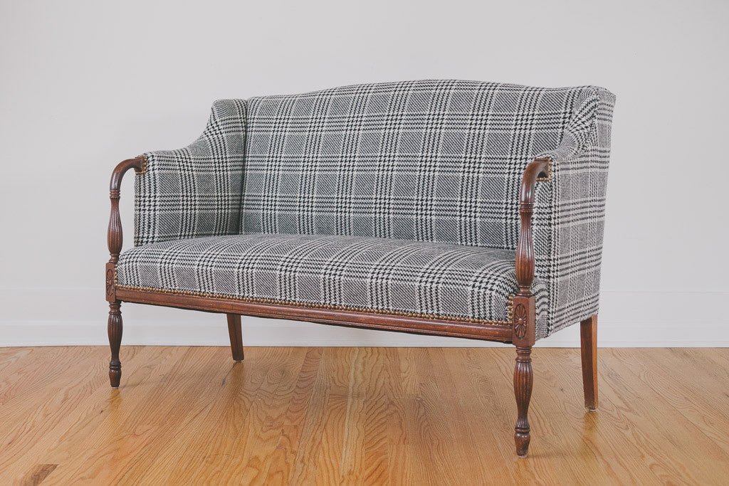 This antique settee is part of our HS Collection. It's upholstered in black and white houndstooth plaid tweed wool with brass nailhead trim. The dark wood frame has carved accents and is in excellent shape. It's very comfortable with a smaller footprint. Please see pictures for detailed condition.