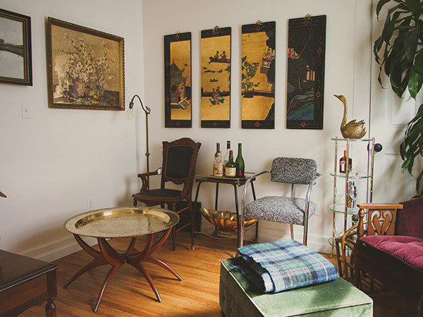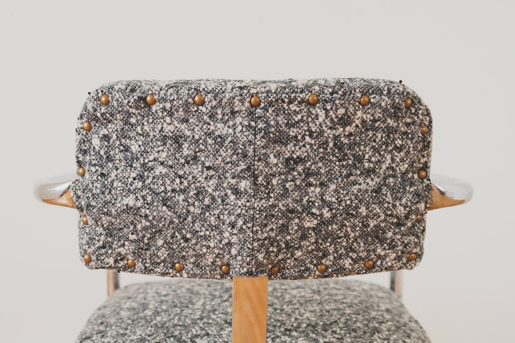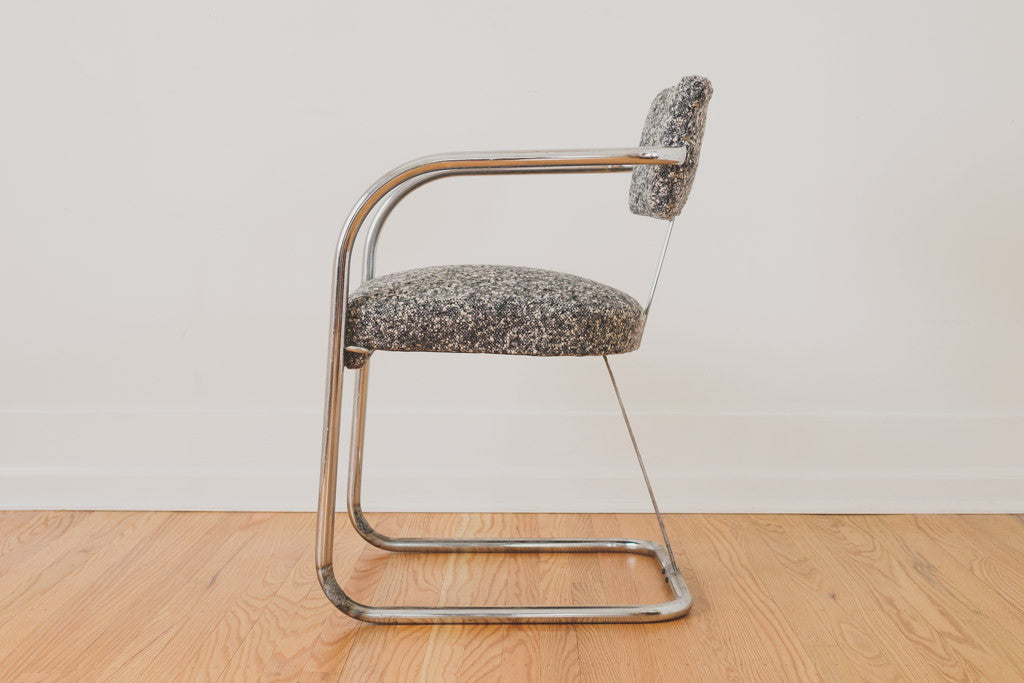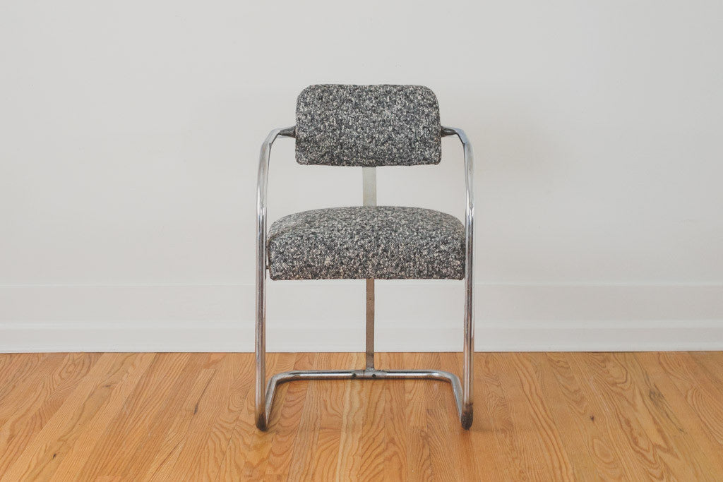 This vintage Art Deco chrome chair is part of our HS Collection. It has a chrome frame with black and white nubby wool upholstery and brass nailhead trim. It's in great shape with some wear to the frame. Please see pictures for detailed condition.