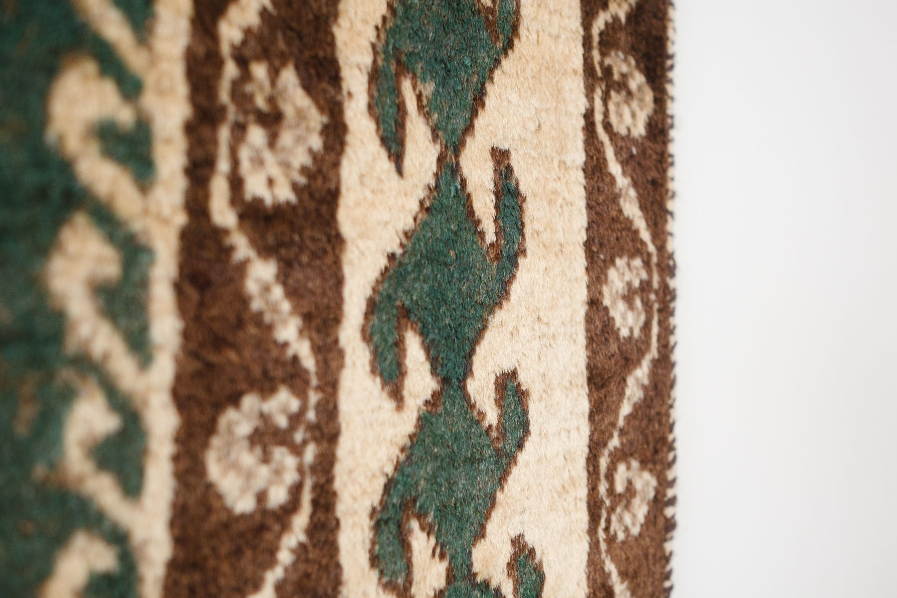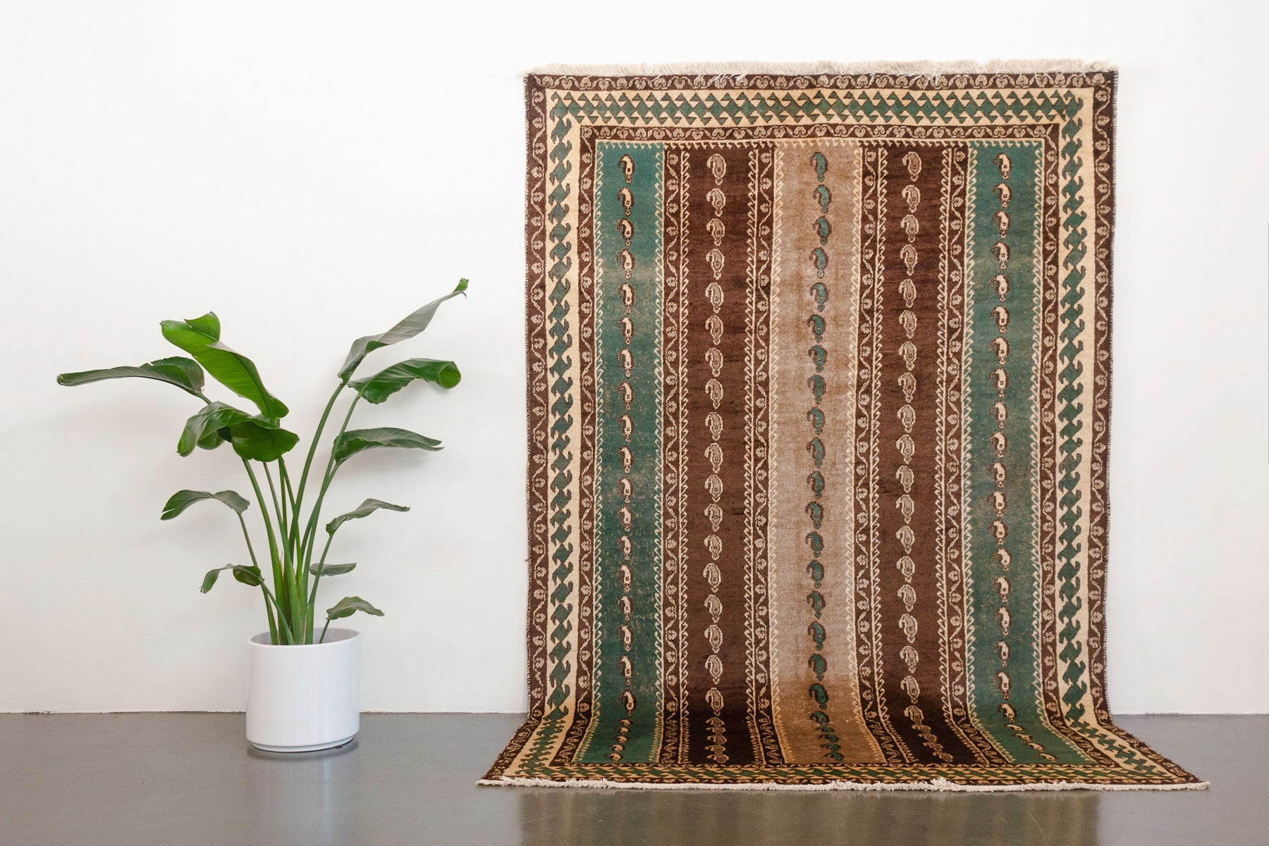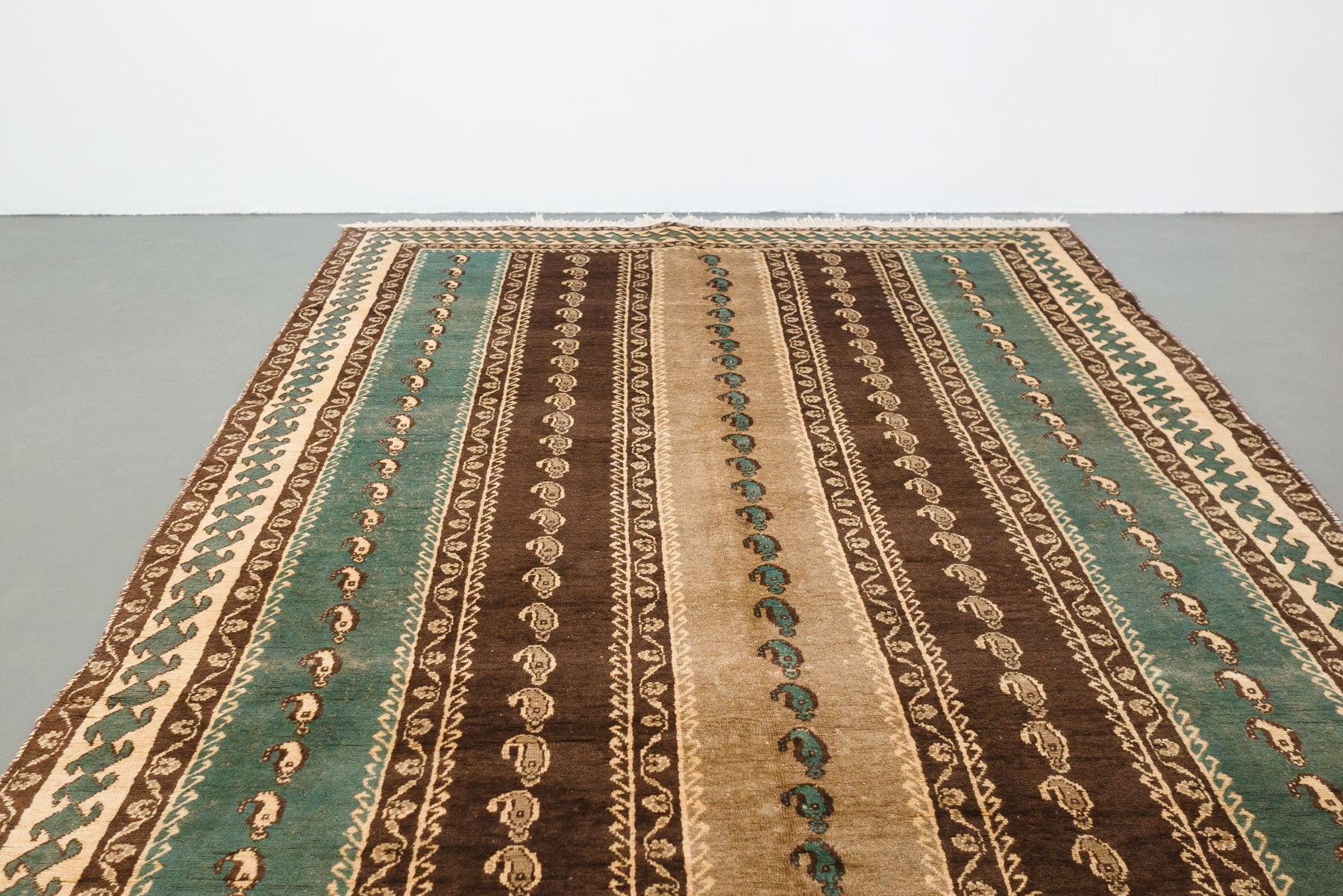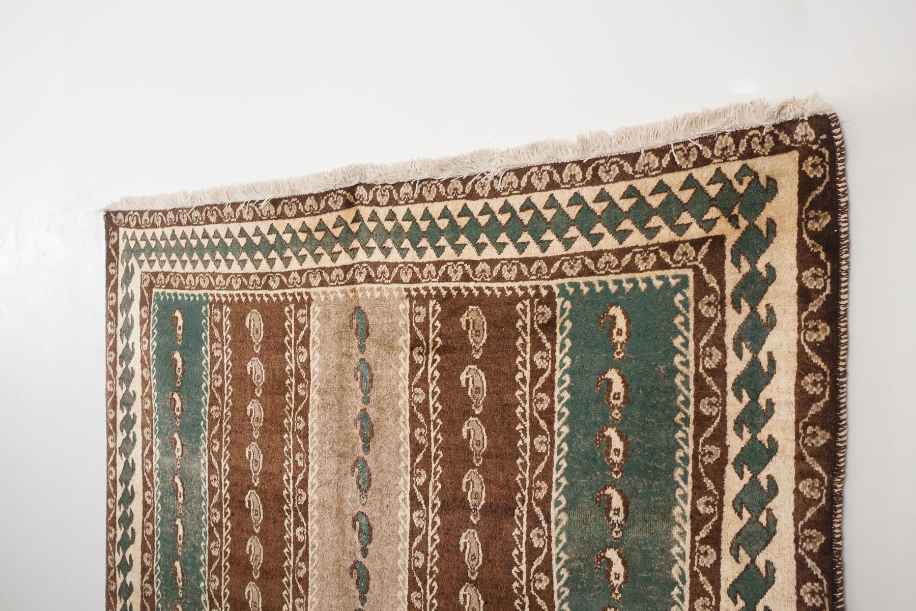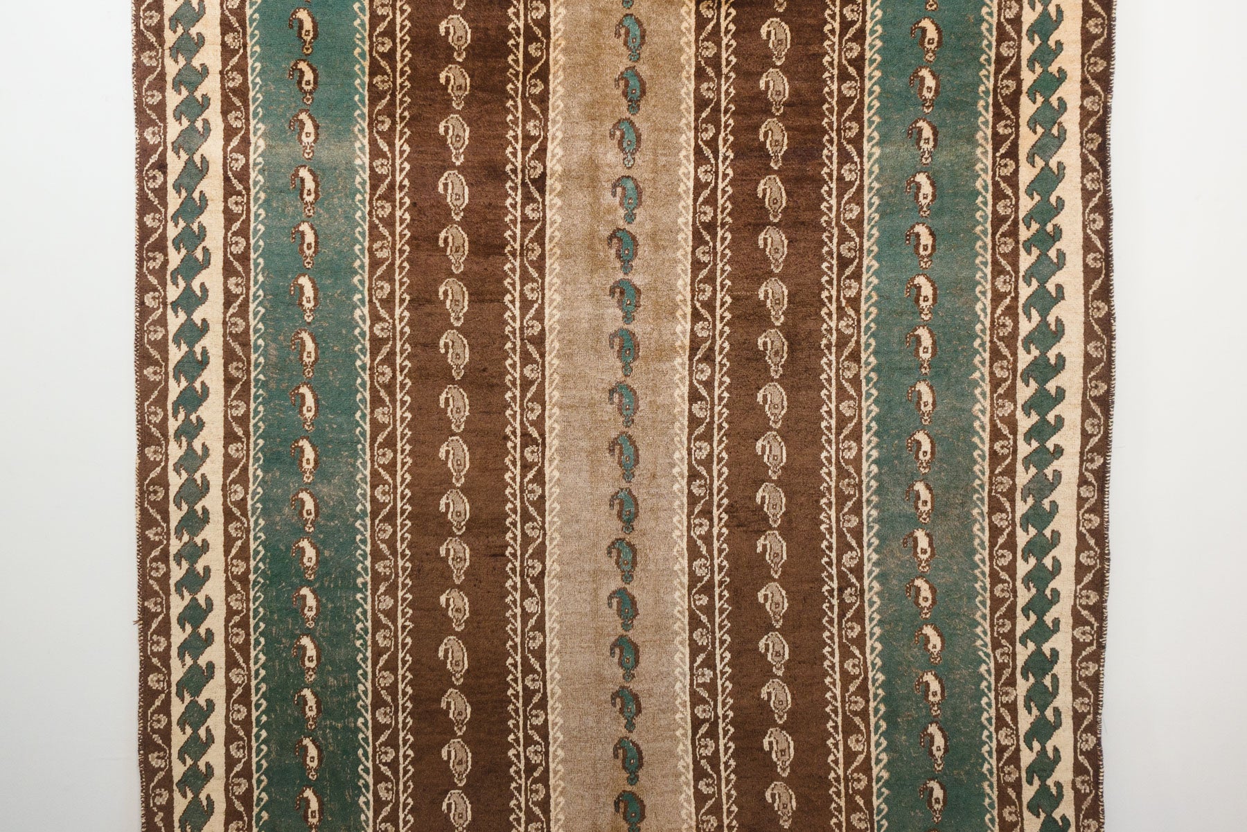 name: Voryaorigin: Iran (Persian), Moharramatstyle: rug, carpetmaterial: hand knotted woolcolors: green, browns, creamage: vintage, 1980-1990condition: good, age related wear - see picturesappraised value: $3,000sku: p-931