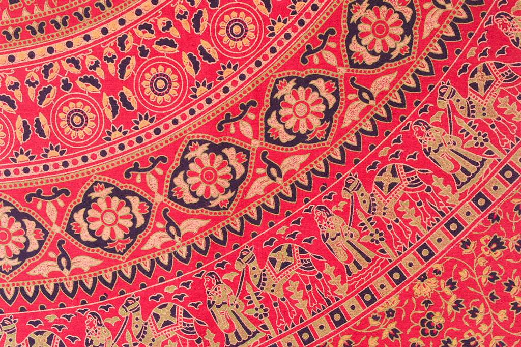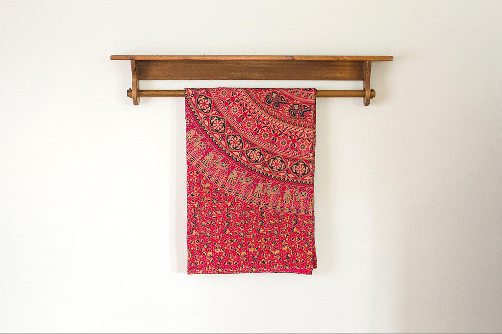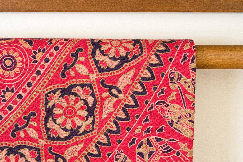 This light-weight vintage blanket is a red, yellow, green and black elephant, camel and floral print on cotton. It's in excellent shape and is machine washable. Perfect for picnics, the beach or as a bedspread. Please see pictures for detailed condition of this piece.