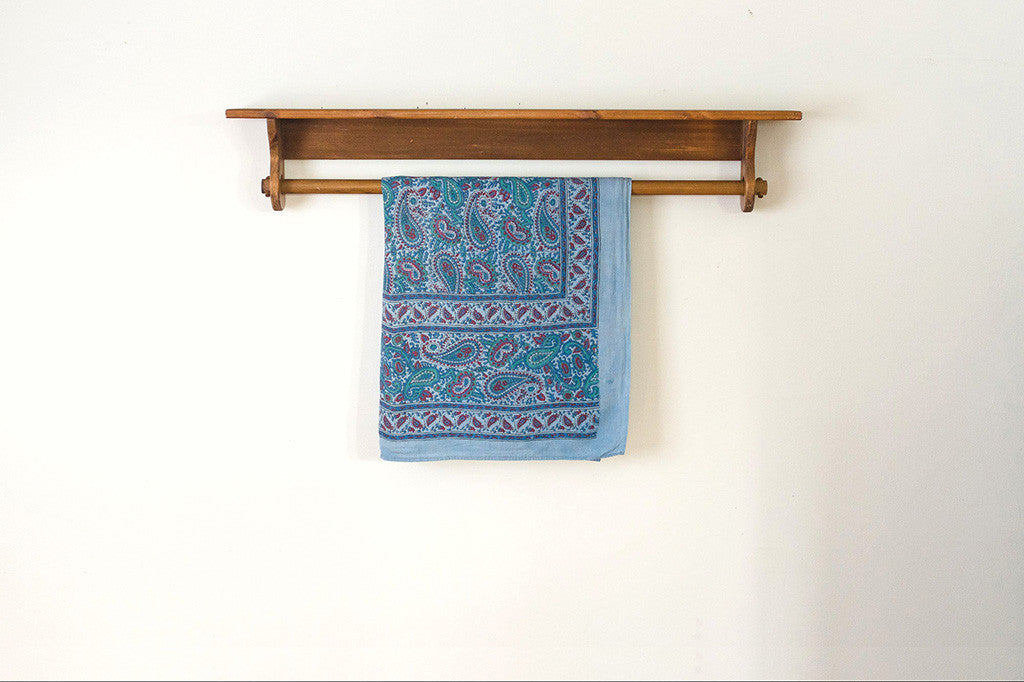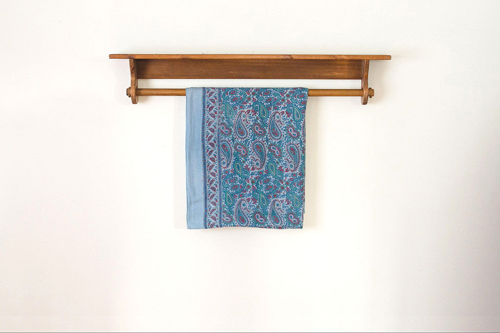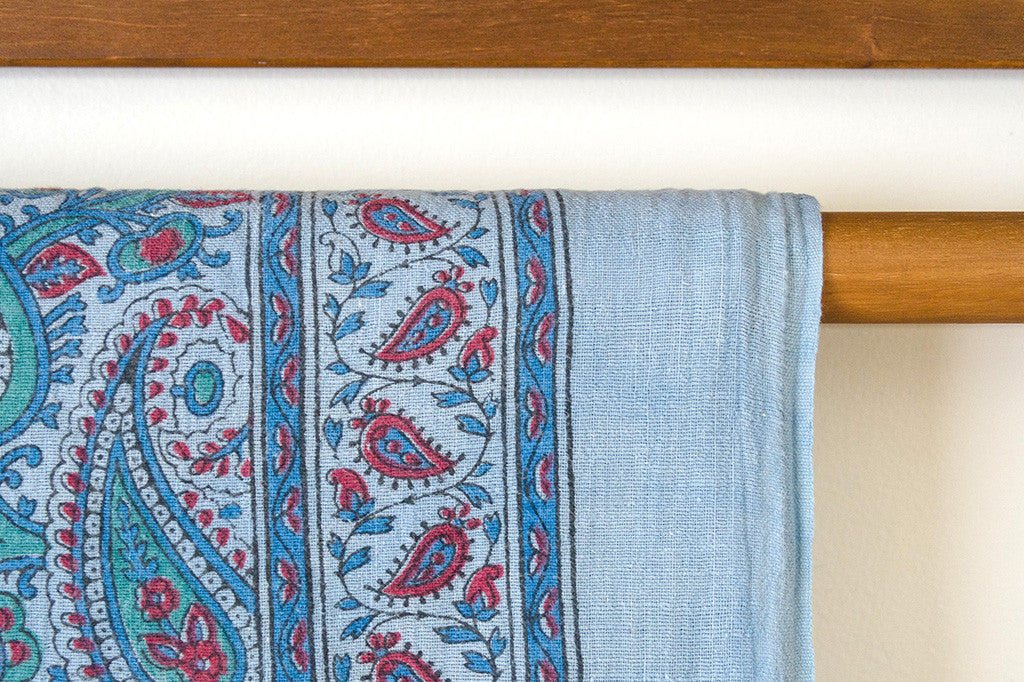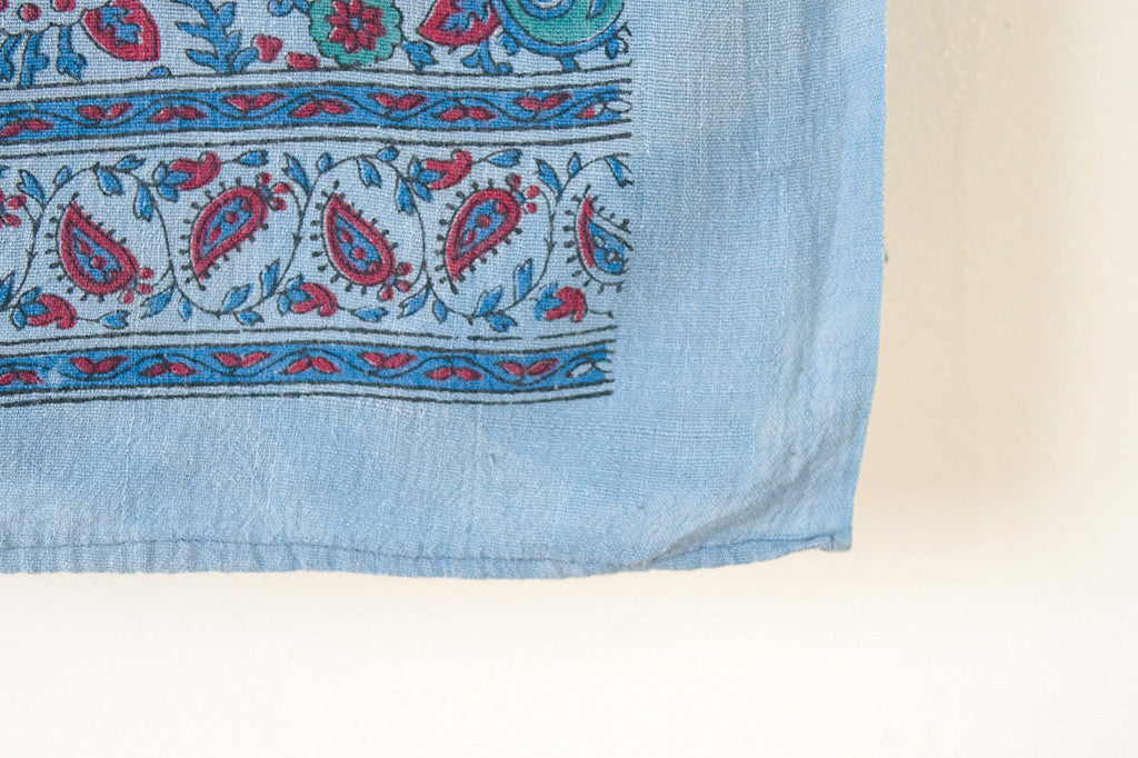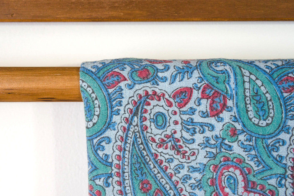 This light-weight vintage blanket is a blue, green and raspberry paisley print on cotton. It's in excellent shape and is machine washable. Perfect for picnics, the beach or as a bedspread. Please see pictures for detailed condition of this piece.