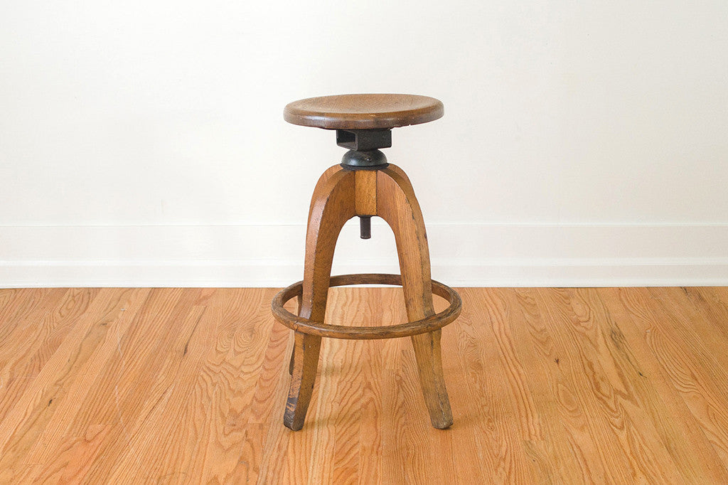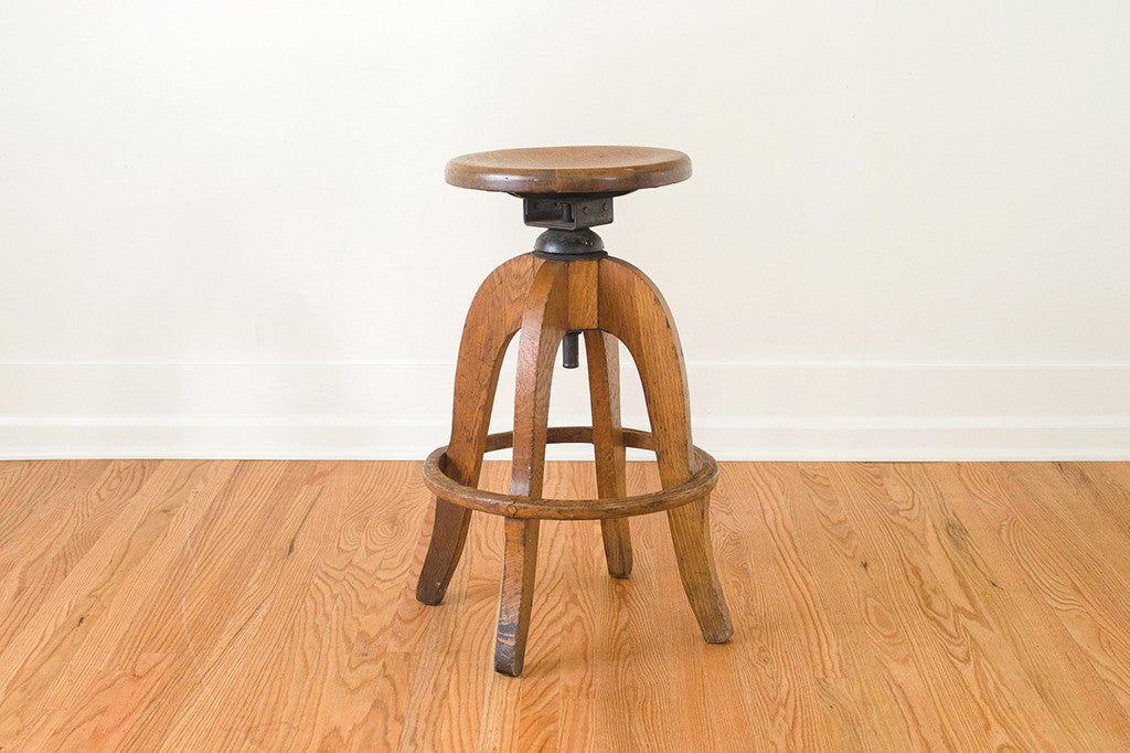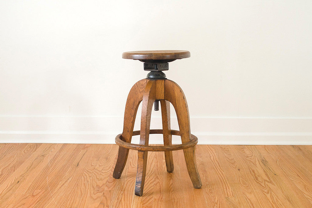 This antique wooden bank stool could also be used as a plant stand or side table. It swivels, has a stationary height and comfortable foot rest. It was made with a nice distressed oak and cast iron accents. There are some cool old markings under the seat. Please see pictures for detailed condition of this piece.
