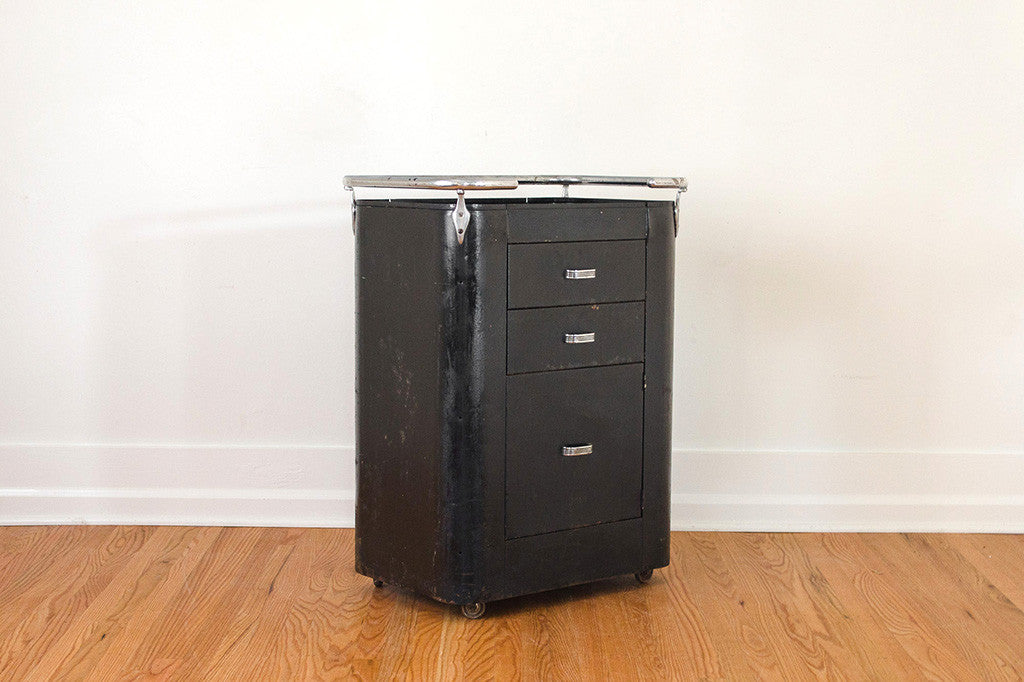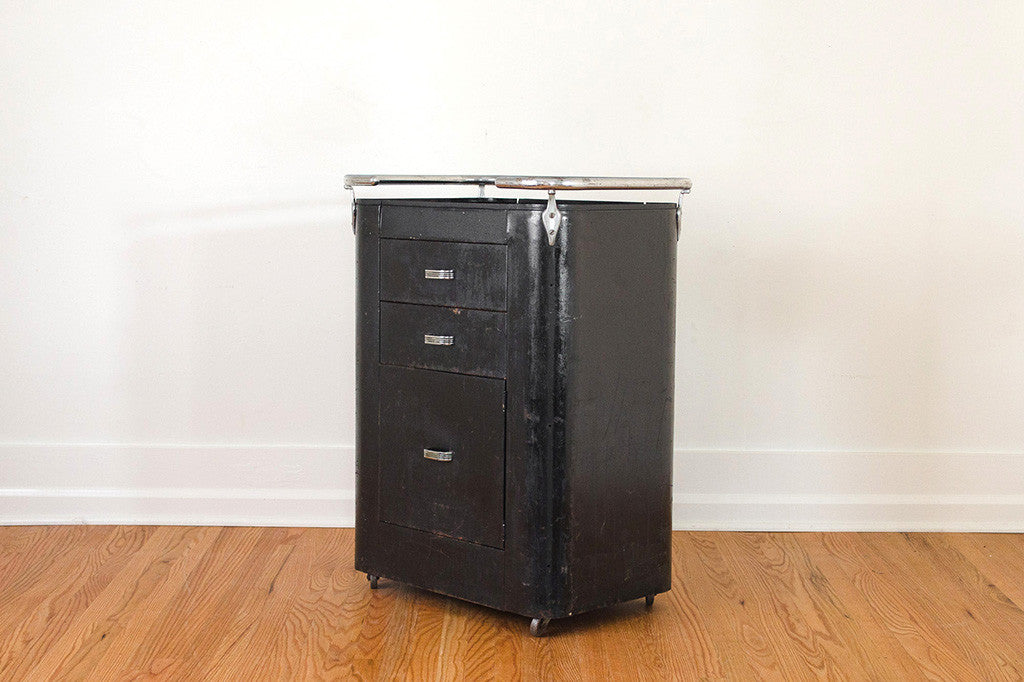 This industrial shop cabinet has a perfectly distressed and rusty patina. It has a recessed top making this a great option for a bar, buffet or credenza. This cabinet would also work well in a bathroom, kitchen or bedroom. It's on casters and it has two drawers and one larger door for storage. Please see pictures for detailed condition of this piece.