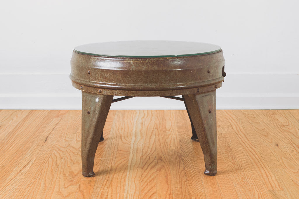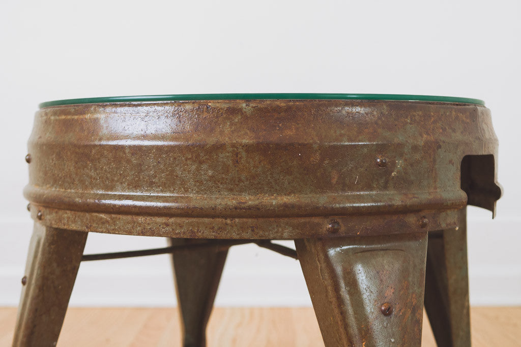 This vintage industrial table has a coated metal frame and 1/4" thick custom glass top. It's in good shape with age related patina and wear. See pictures for detailed condition.