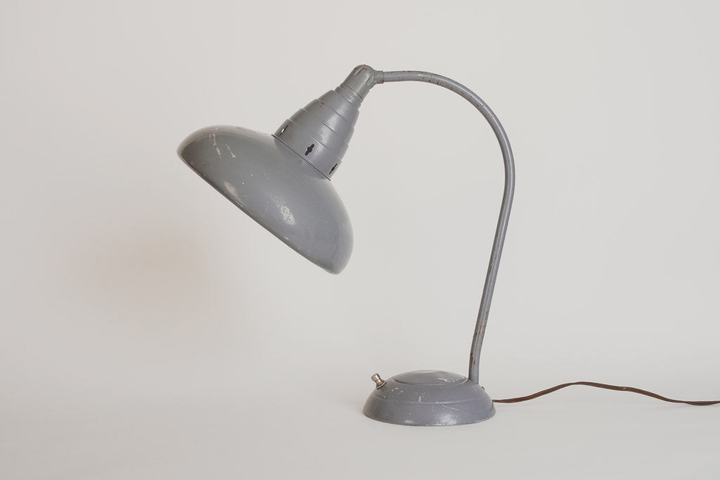 This industrial gooseneck desk lamp is steel with distressed grey paint. It's in good working condition and the head is adjustable in direction. Please see pictures for detailed condition.