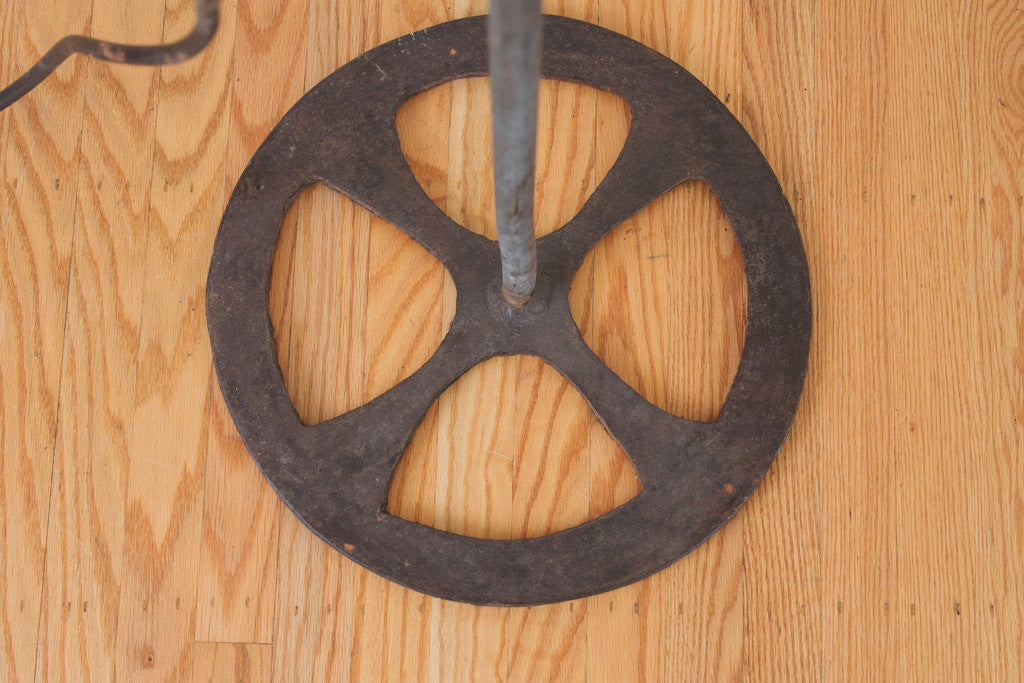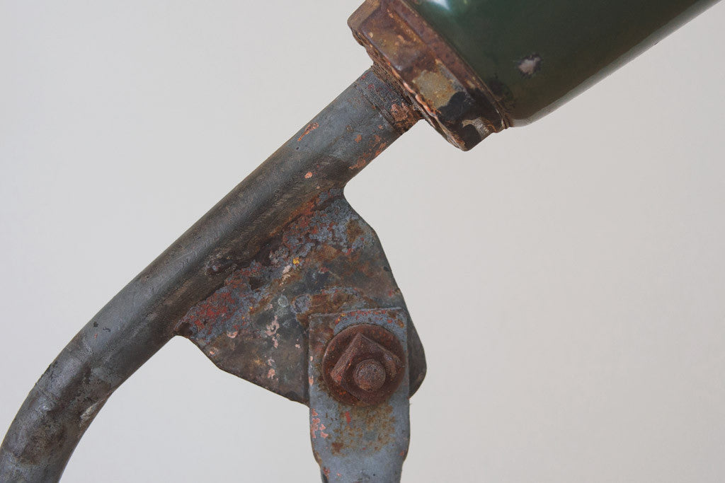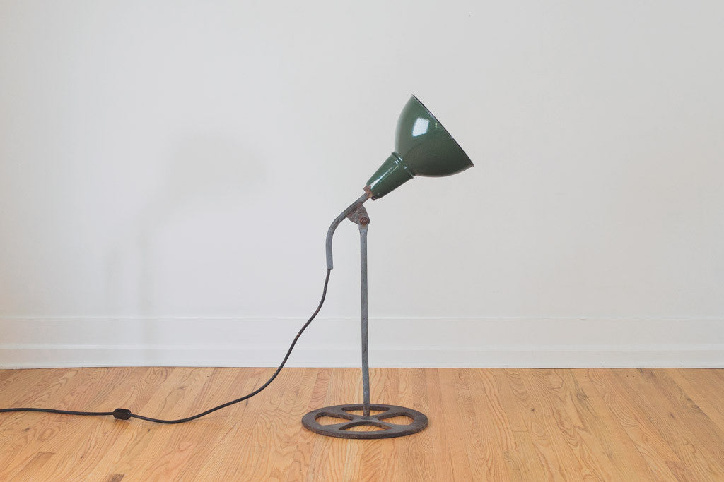 This industrial steel lamp has a heavy circular base, grey body and green shade. It's in good working shape and the head is adjustable in direction. Please see pictures for detailed condition.