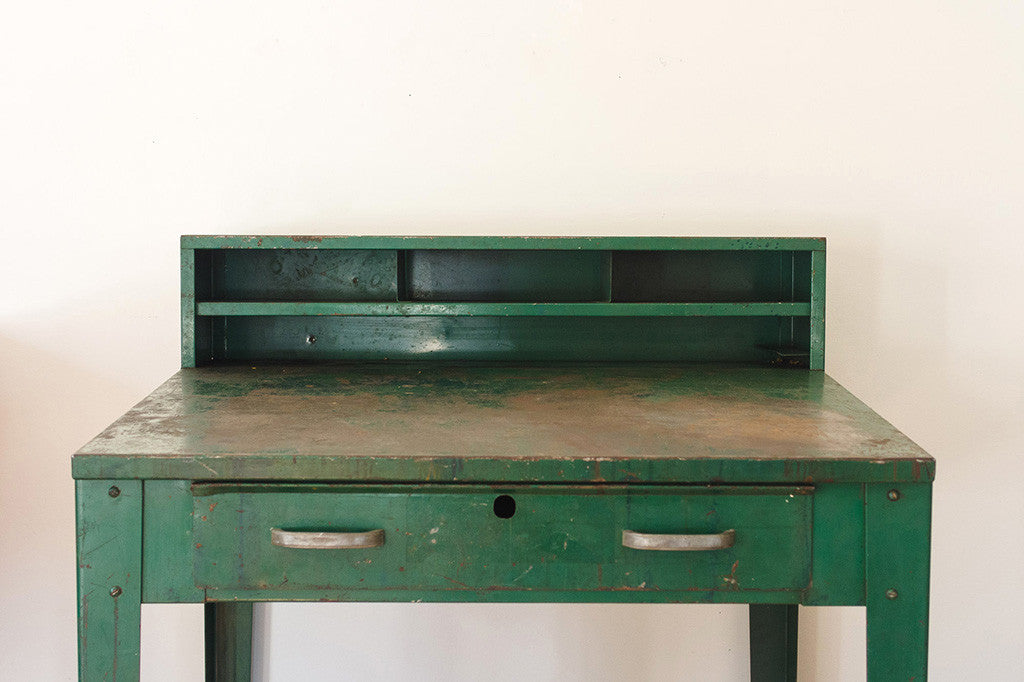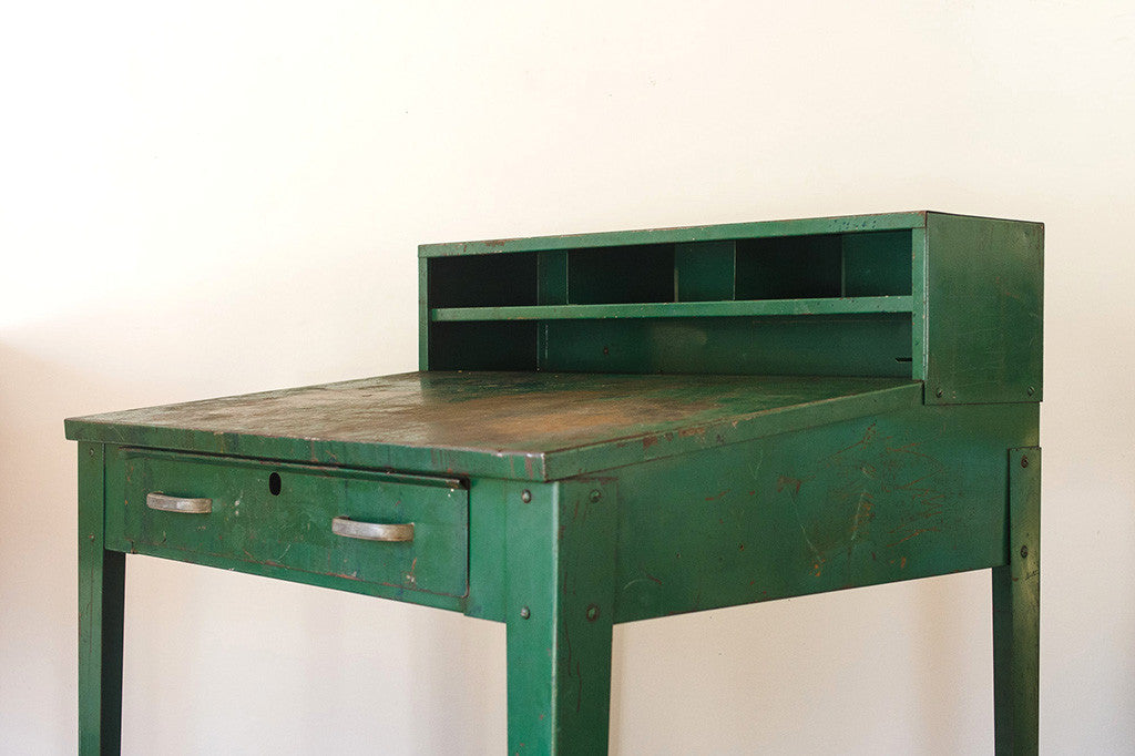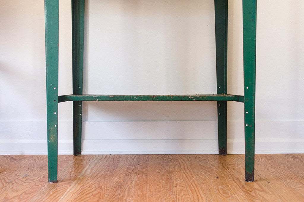 This industrial standing desk was once used by the US post office. It's solid steel with a green painted finish, one large drawer and an adjustable lower shelf. It has a nicely aged patina from years of use. This table is extremely heavy and sturdy. It's in overall great shape besides the age-related wear.