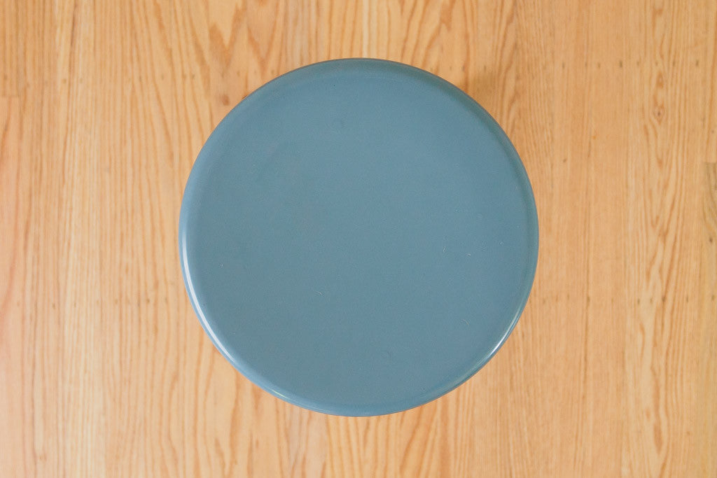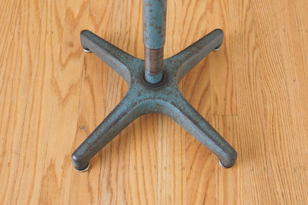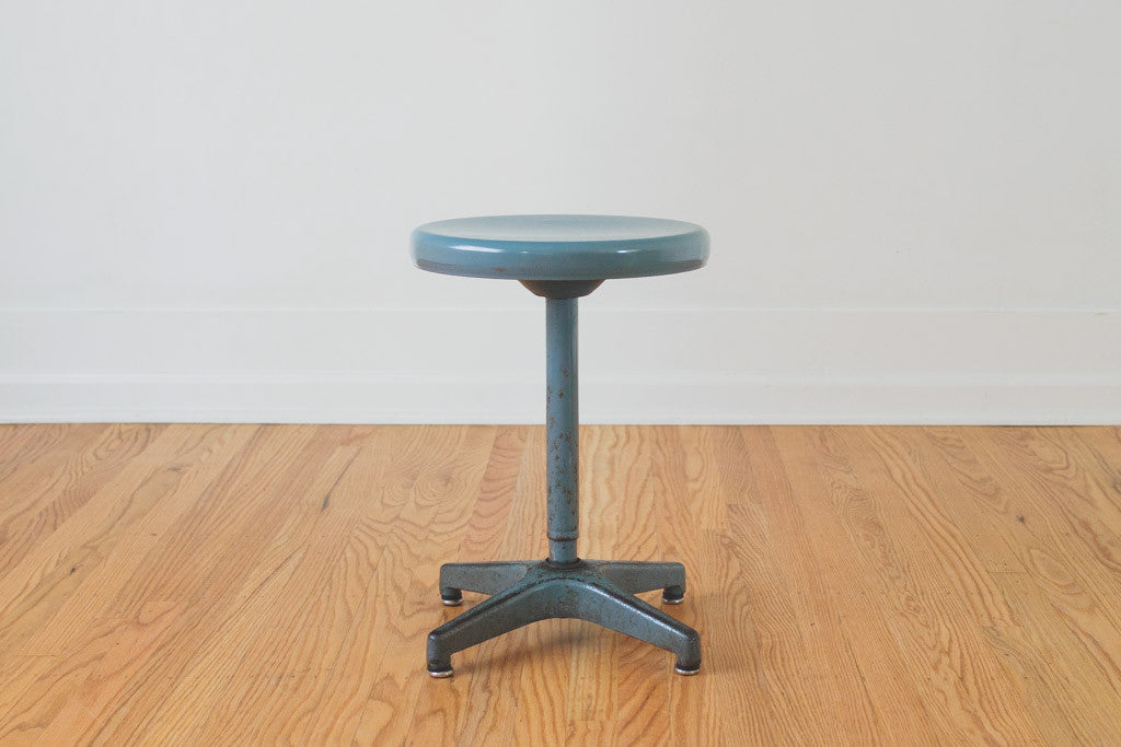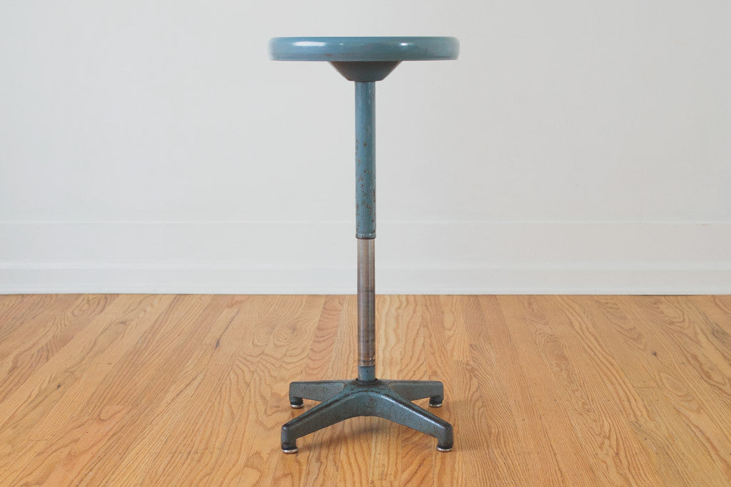 This vintage shop stool was manufactured by Adjustrite. It has a distressed painted steel base, pristine top and is adjustable in height. It's in good shape with age related wear. Please see pictures for detailed condition.
