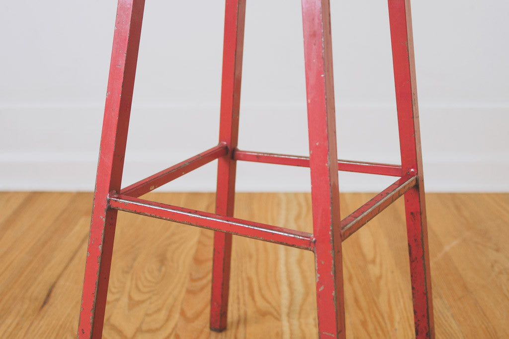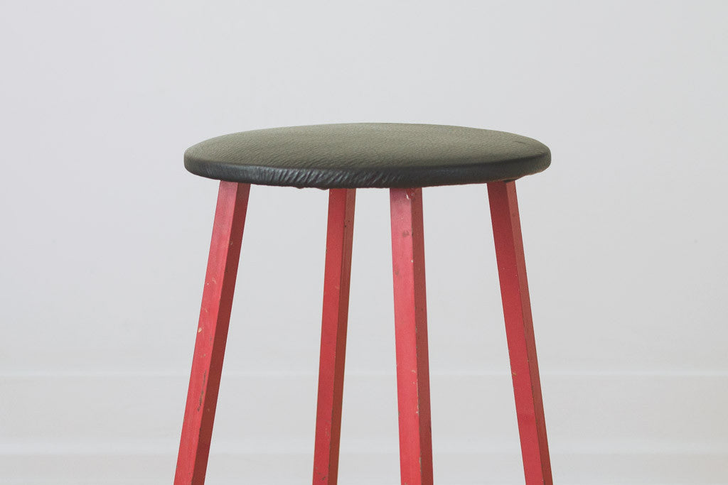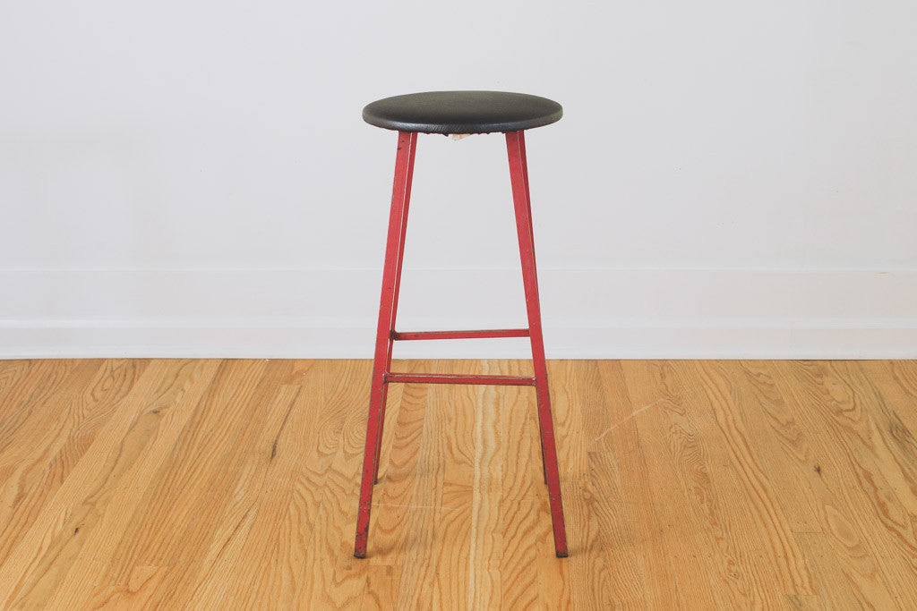 This vintage shop stool has a black leather seat on a distressed red steel base. It's sturdy and in good shape with natural age related wear. See pictures for detailed condition.