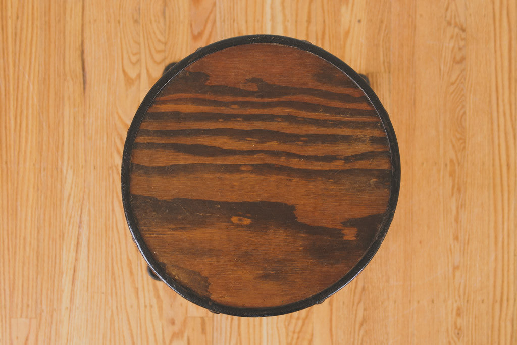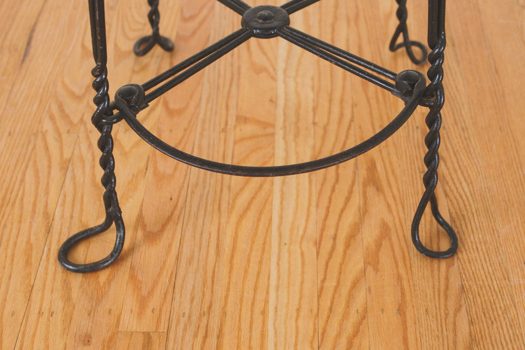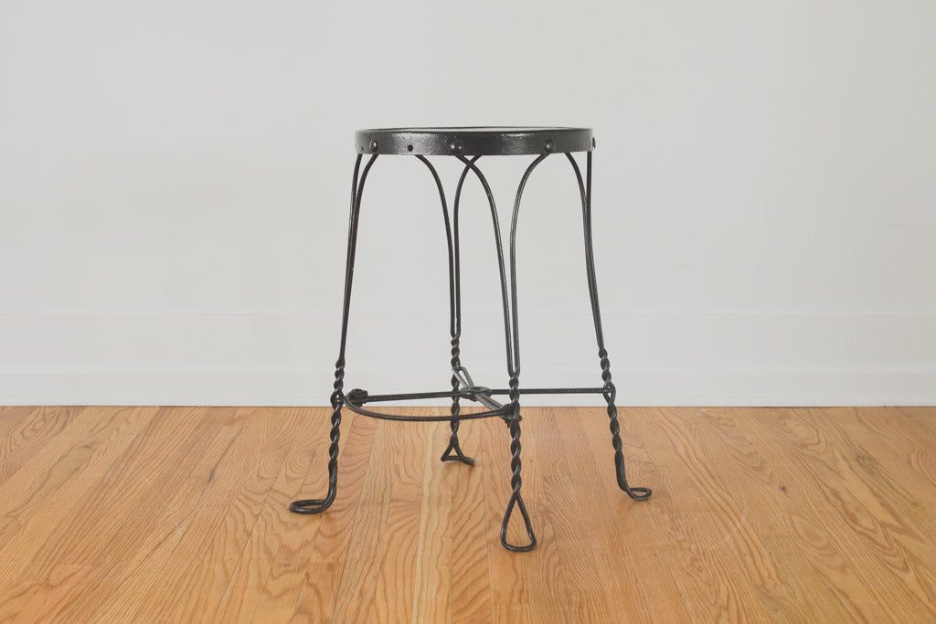 This vintage bar stool would be perfect at a drafting table or kitchen island. It could also be used as a plant stand or side table. It has a distressed black finish with a twisted iron base, comfortable foot rest and wood seat. It's in good shape with natural age related wear. Please see pictures for detailed condition.