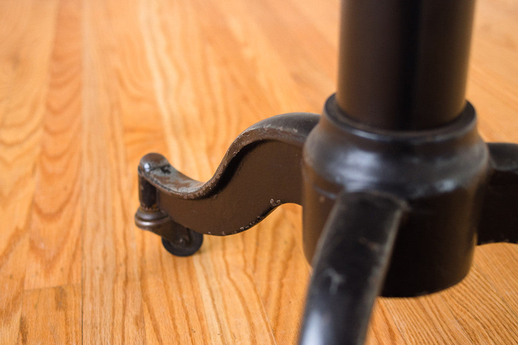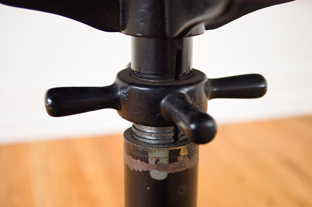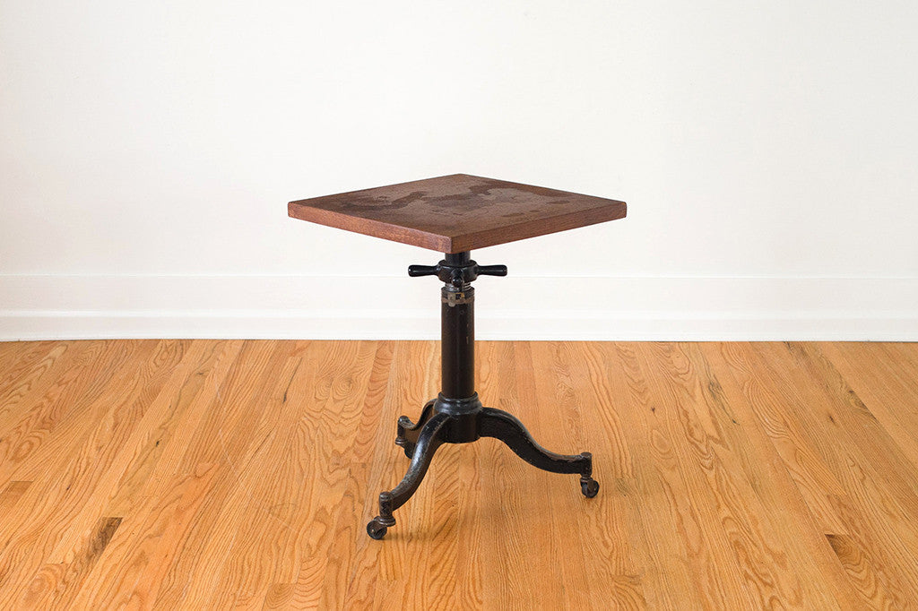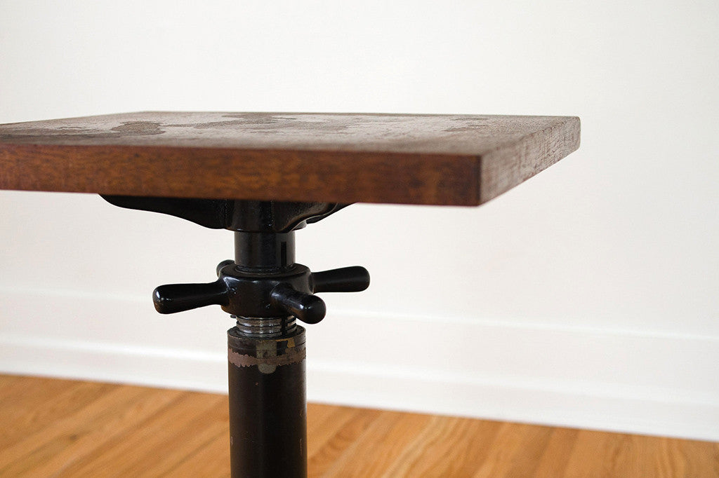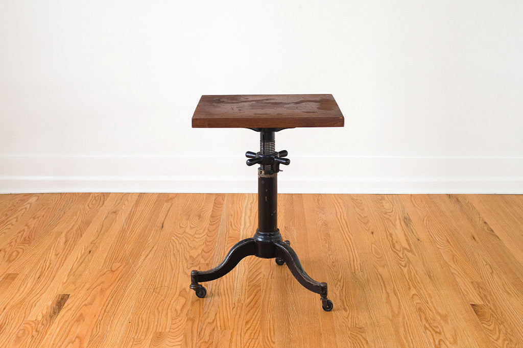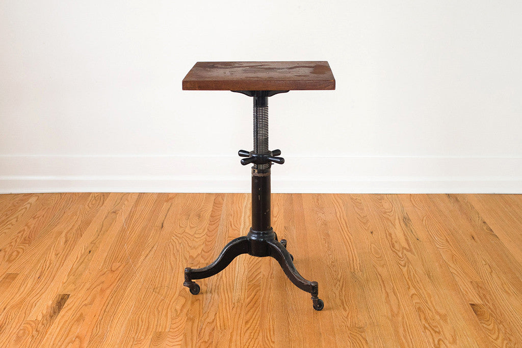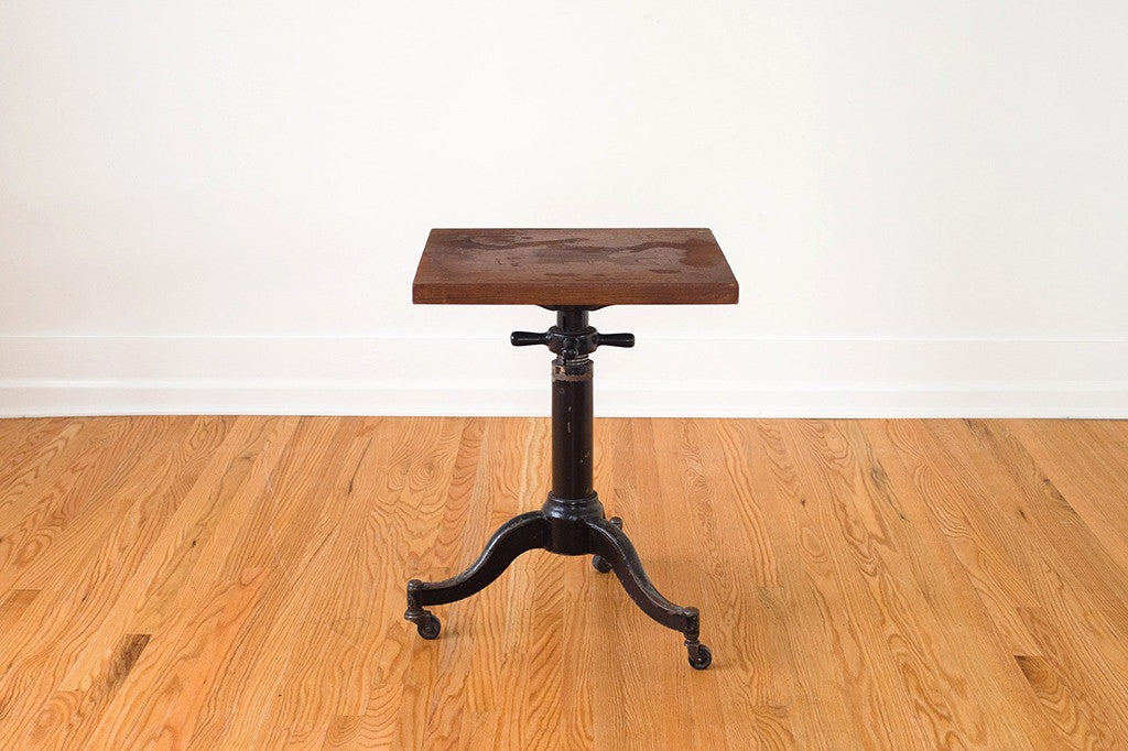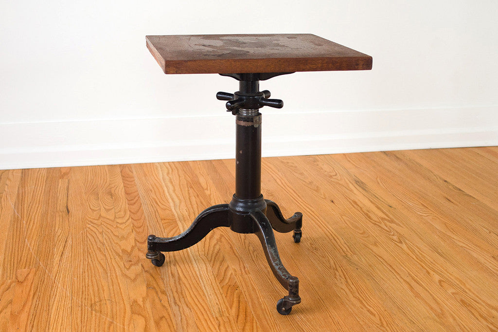 This vintage table has a heavy black iron base, a thick wood top and original casters. It's adjustable in height and would make a great side table or nightstand. This base would also pair well with a larger top to make it the perfect bistro or dining table. Please see pictures for detailed condition of this piece.