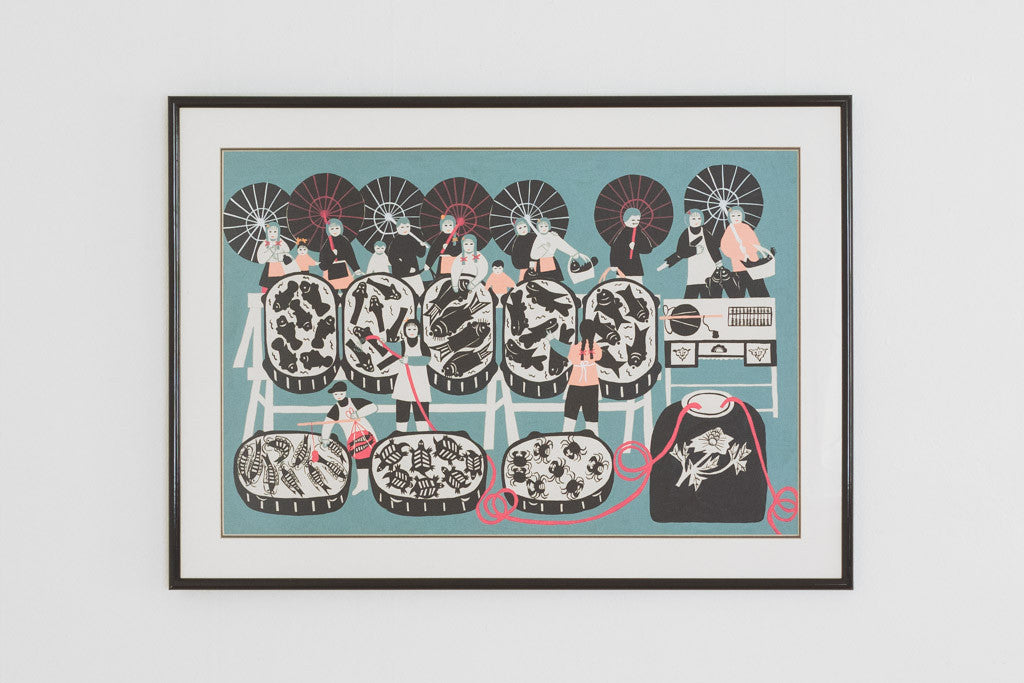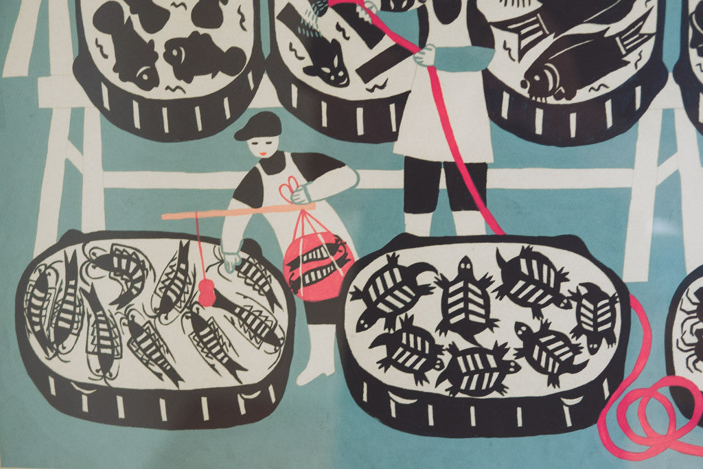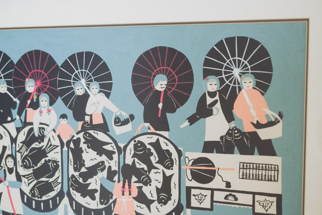 This vintage Japanese fish market print has a black frame with glass and is in good shape with age related wear. See pictures for detailed condition.