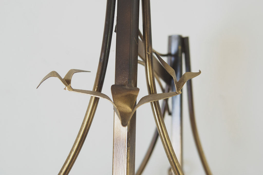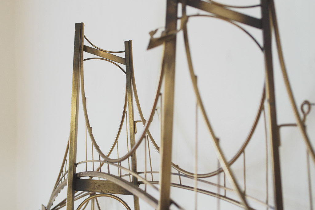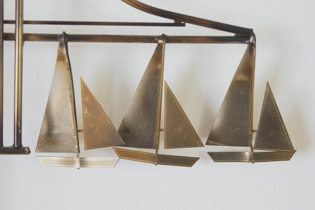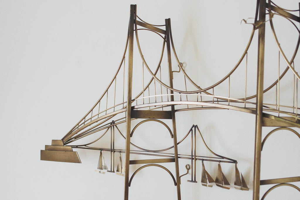 This vintage Jere Era bridge sculpture has brass frame with attached port and ships. It's in good shape with age related wear. Please see pictures for detailed condition.