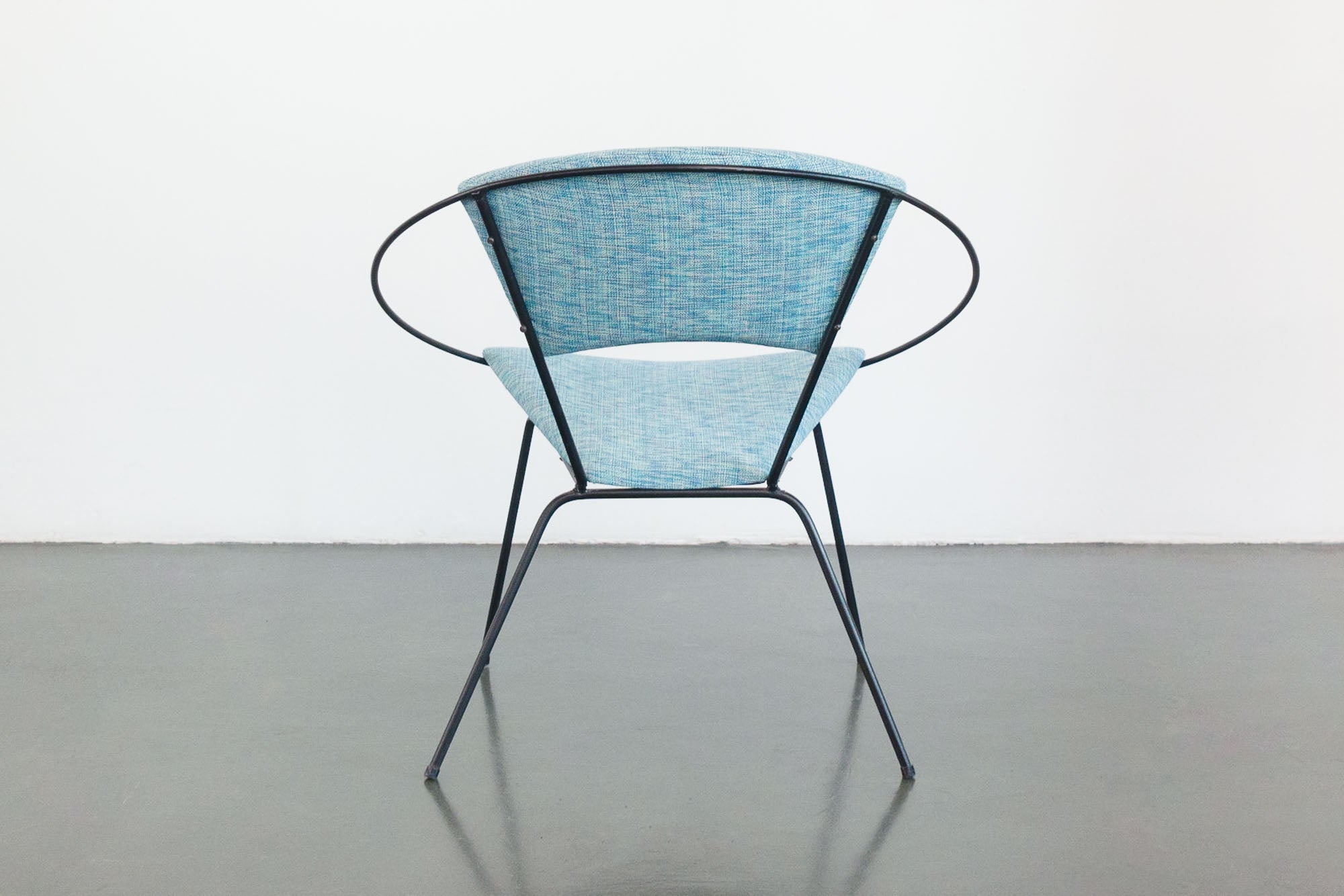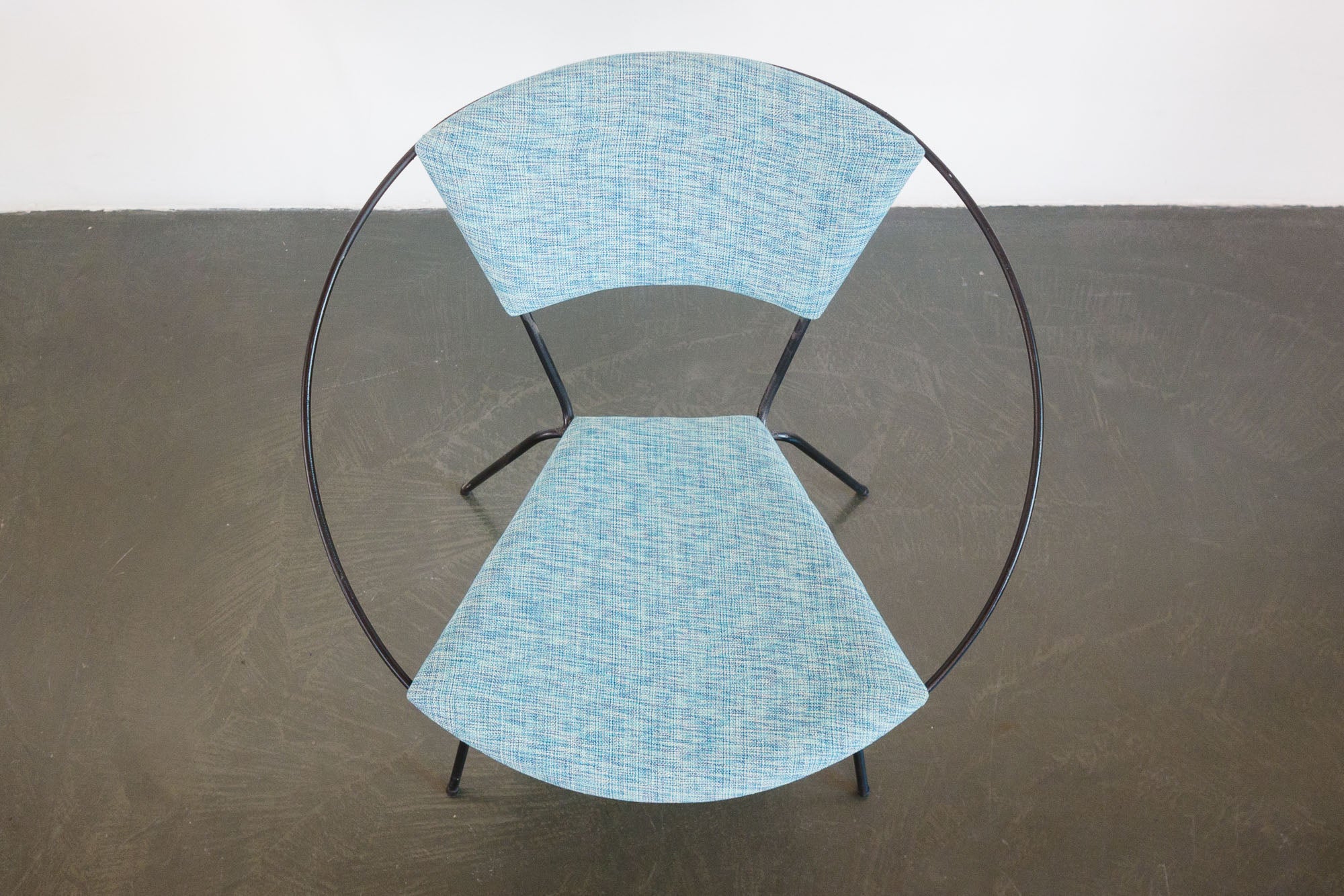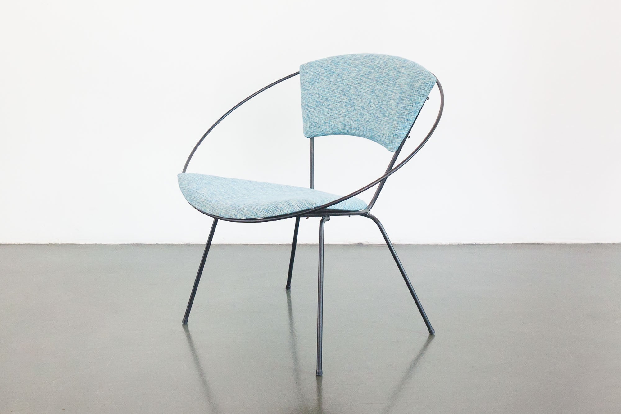 style: modern, side chair, lounge chair, circle, hoop chair material: iron frame, foam, upholstery age: vintage design: Joseph Cicchelli for Reilly-Wolff condition: good, age related wear - see pictures note: second chair available separately hs-418