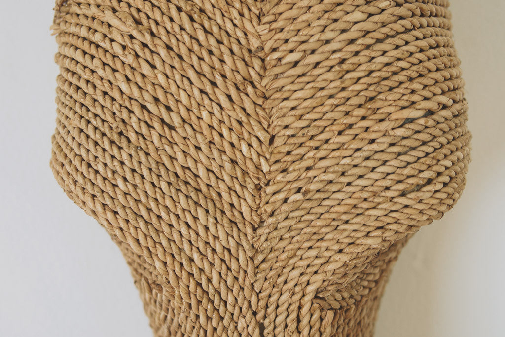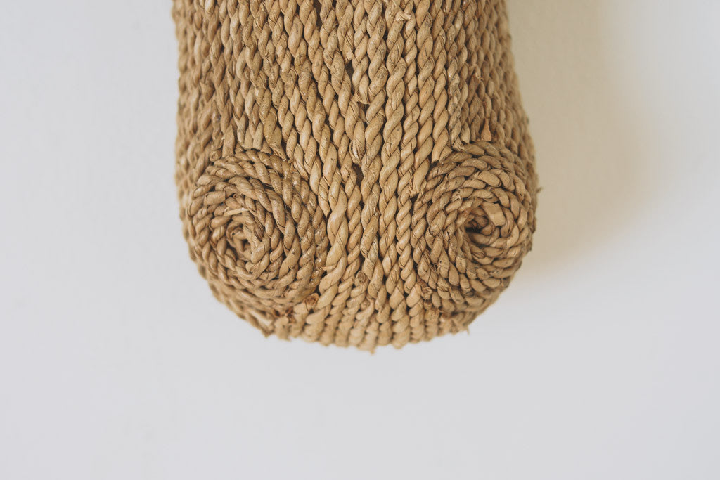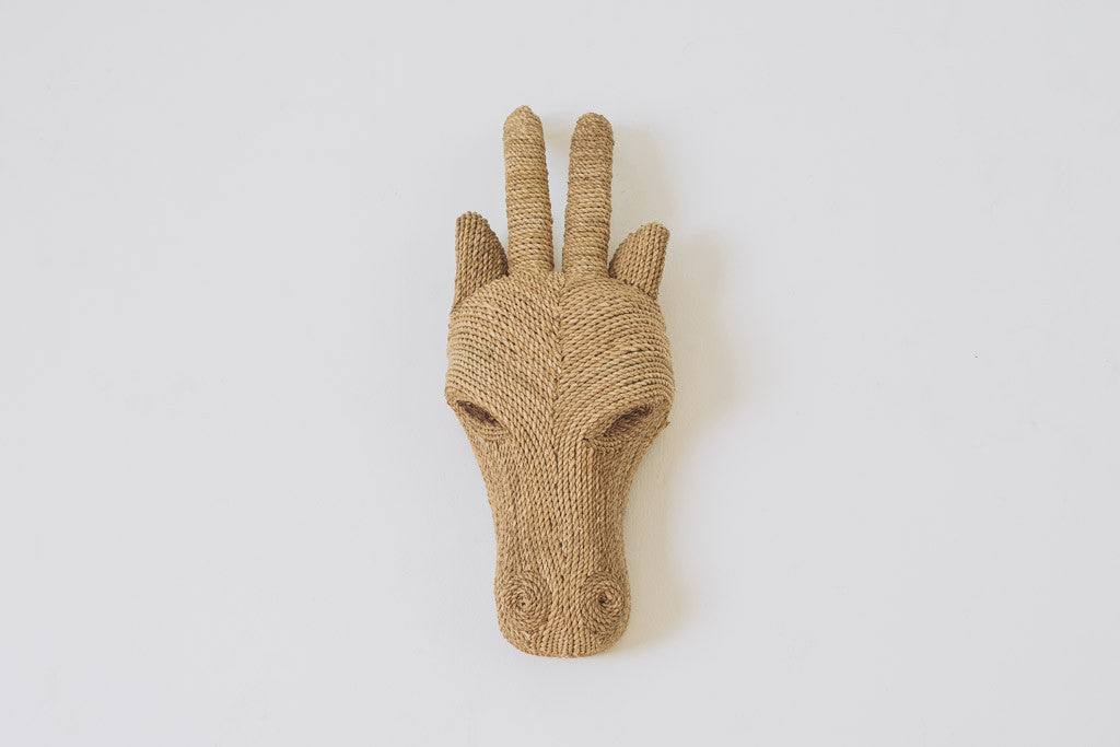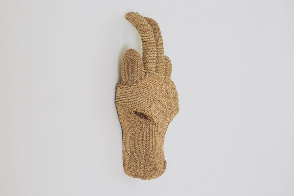 This vintage antelope mount is handcrafted with a jute rope exterior. It mounts on the wall like a traditional taxidermy piece. It's in great shape with age related wear.