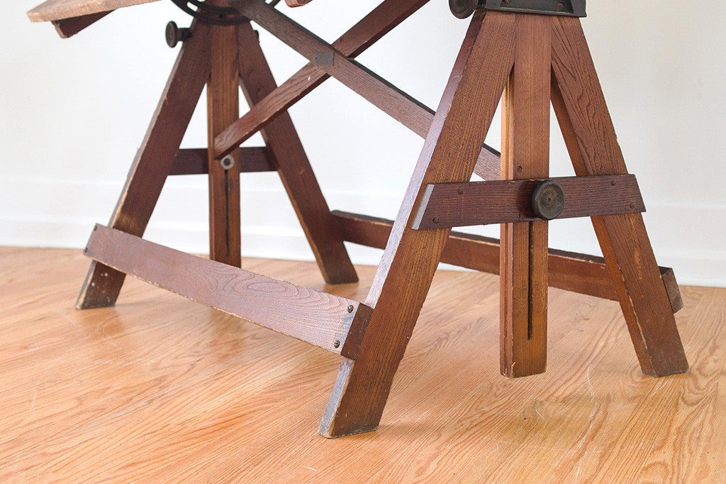 This vintage Keuffel & Esser draftsman's table is a larger size with a rich darker wood stain. It has easy to use cast iron hardware and is adjustable in height and pitch. The oak top and base on this piece have a nicely aged patina. Please see pictures for detailed condition of this piece.