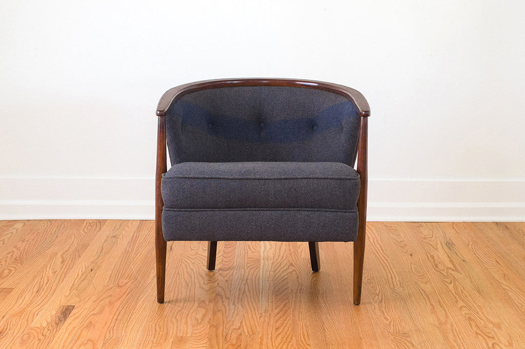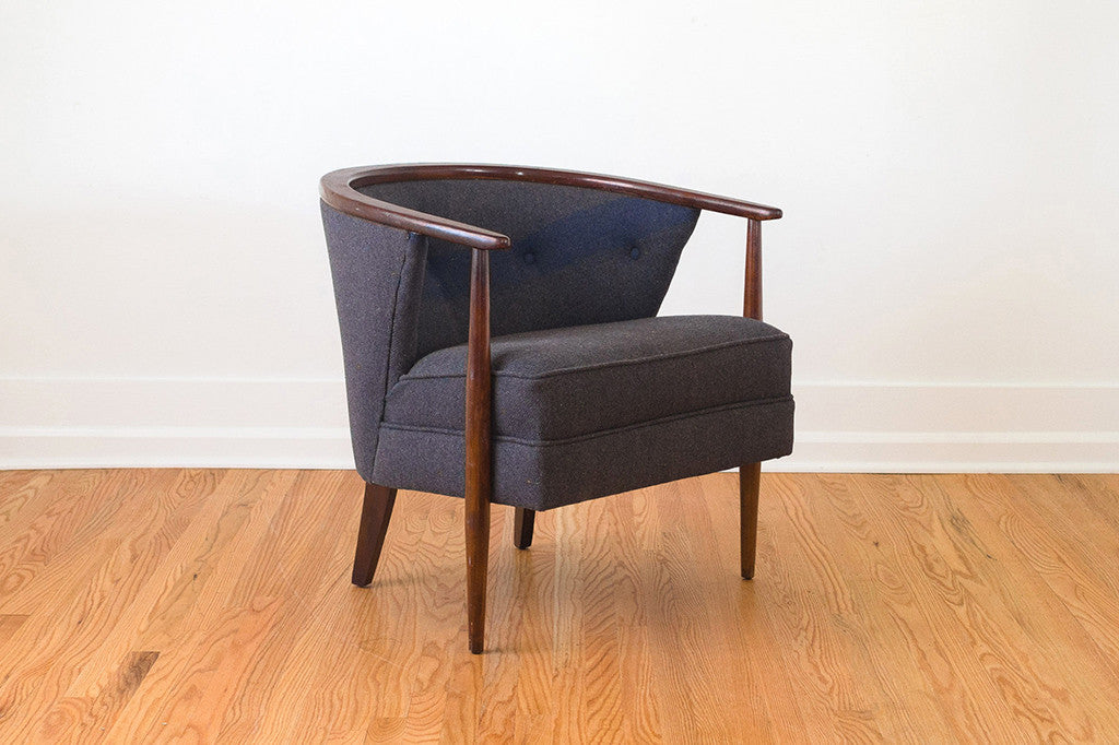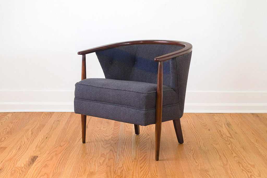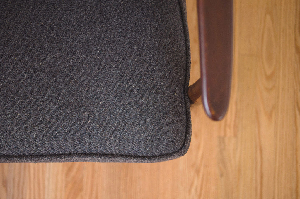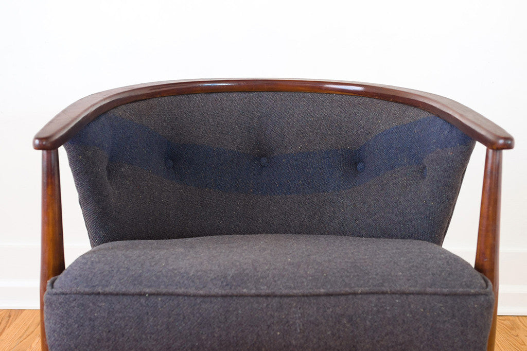This Mid Century kodawood chair was upholstered in a vintage gray blanket with a blue stripe across the back. It has a tufted backrest and has plain gray blanket fabric on the seat and back of the chair. This chair is in great overall shape. The wood frame shows some wear and there are a couple of pin sized holes in the seat from age related wear to the blanket that was used for upholstery. Please see pictures for detailed condition of this piece.