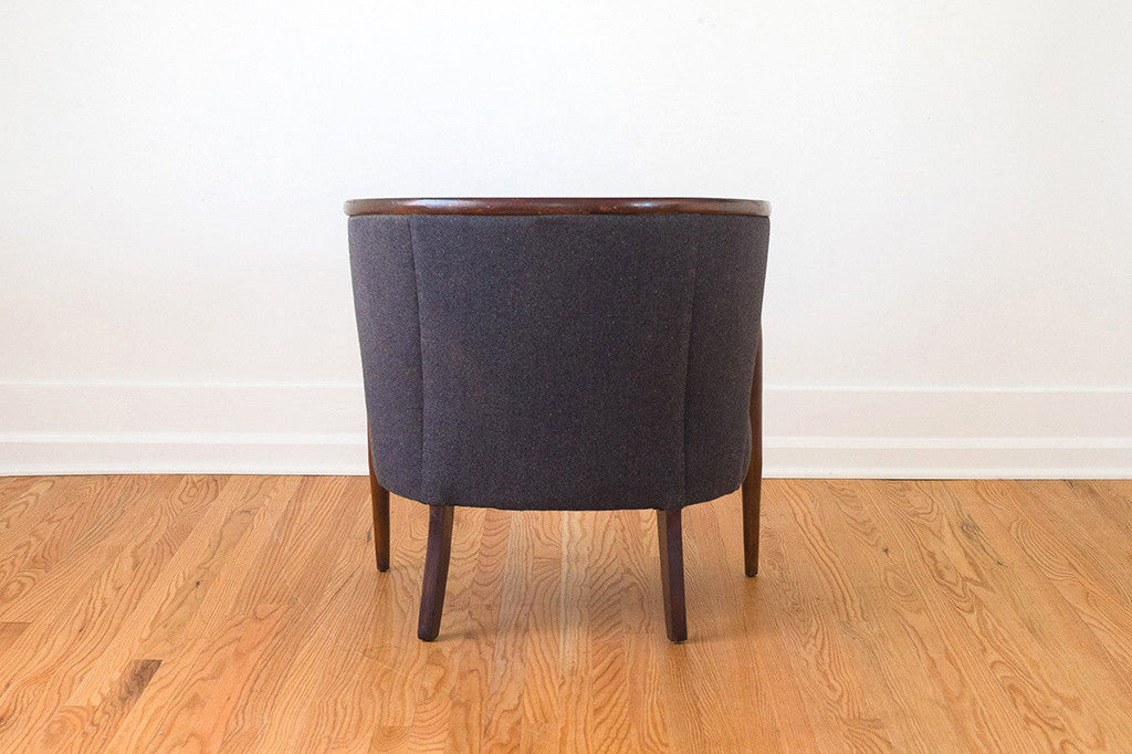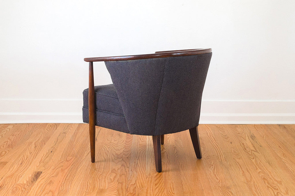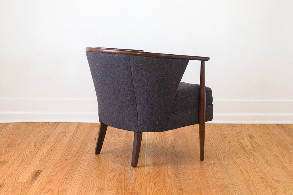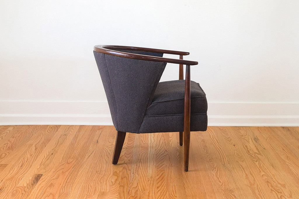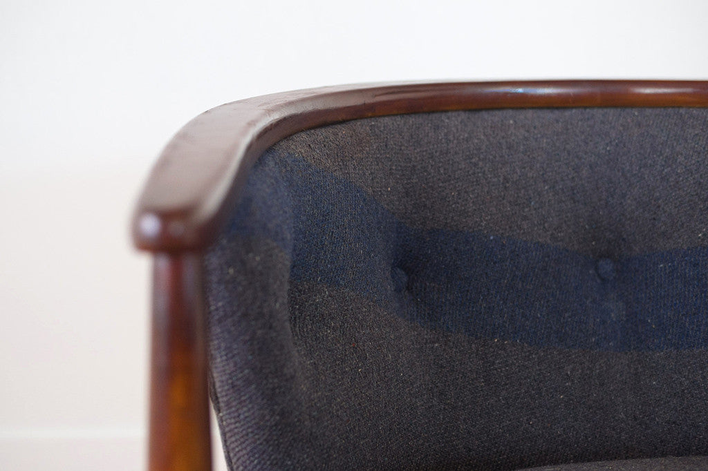 This Mid Century kodawood chair was upholstered in a vintage gray blanket with a blue stripe across the back. It has a tufted backrest and has plain gray blanket fabric on the seat and back of the chair. This chair is in great overall shape. The wood frame shows some wear and there are a couple of pin sized holes in the seat from age related wear to the blanket that was used for upholstery. Please see pictures for detailed condition of this piece.