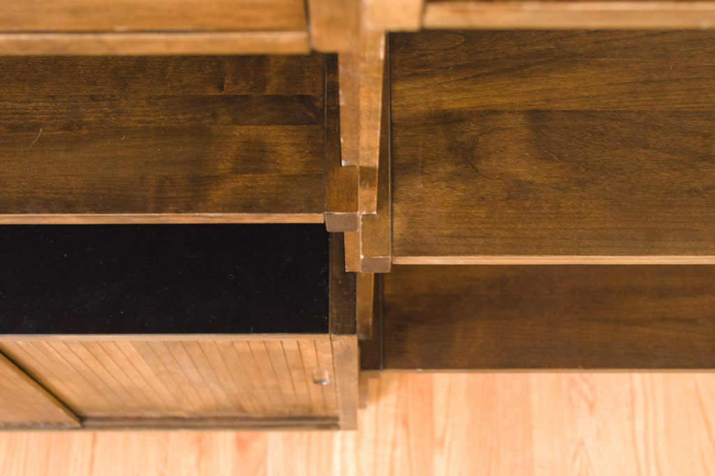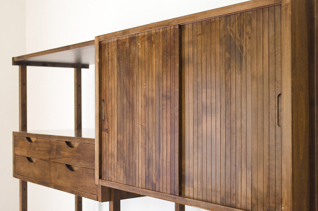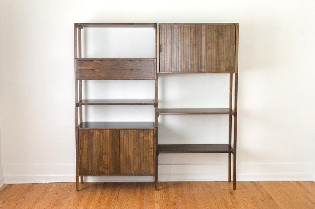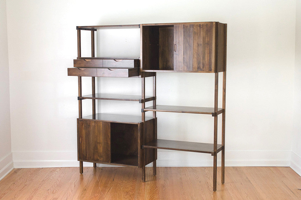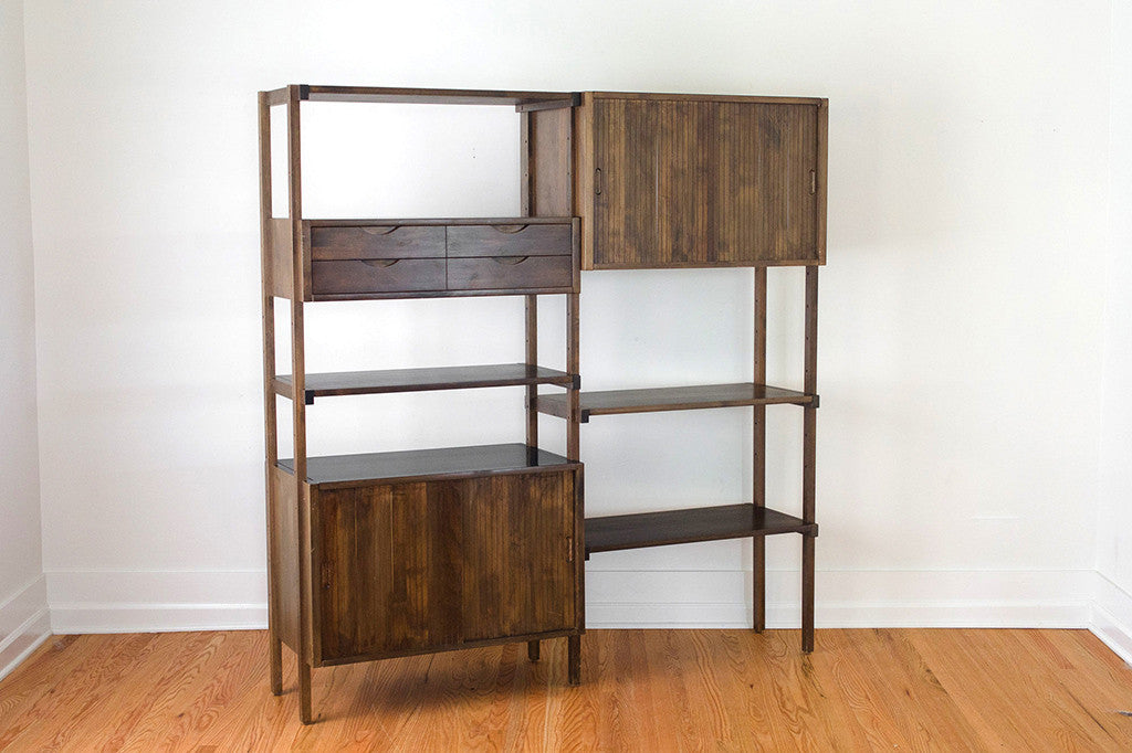 This Mid Century modular double shelving unit was manufactured by Kopenhavn. It comes with a three piece frame, four shelves, two cabinets with sliding doors (fits records really well) and one double drawer. This until can be arranged to suit your specific needs. This piece shows some light age related overall wear. Please see pictures for detailed condition of this piece.