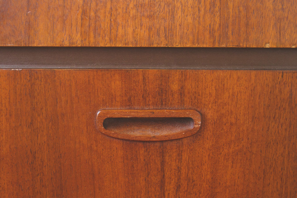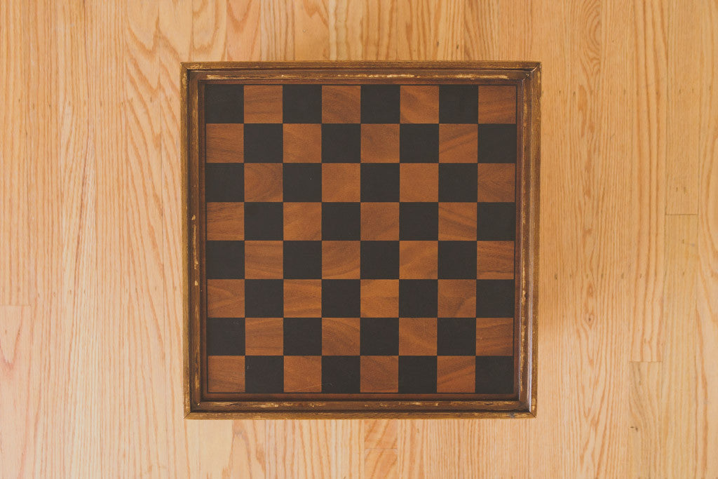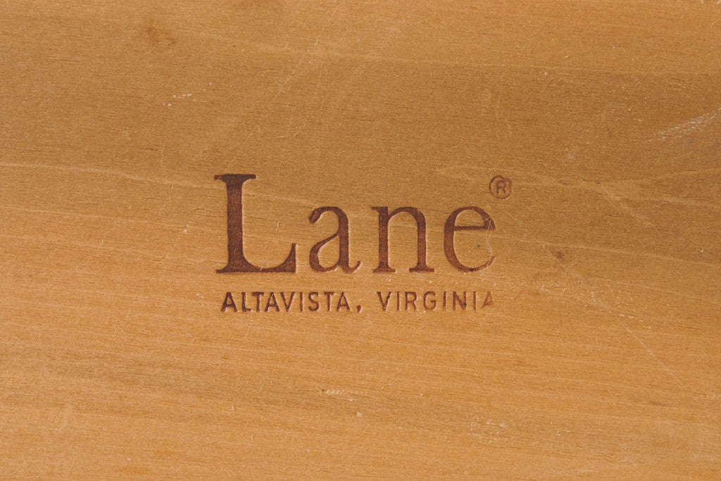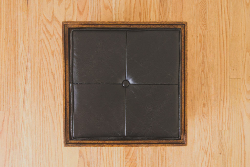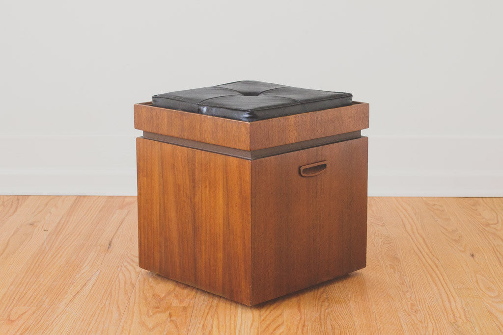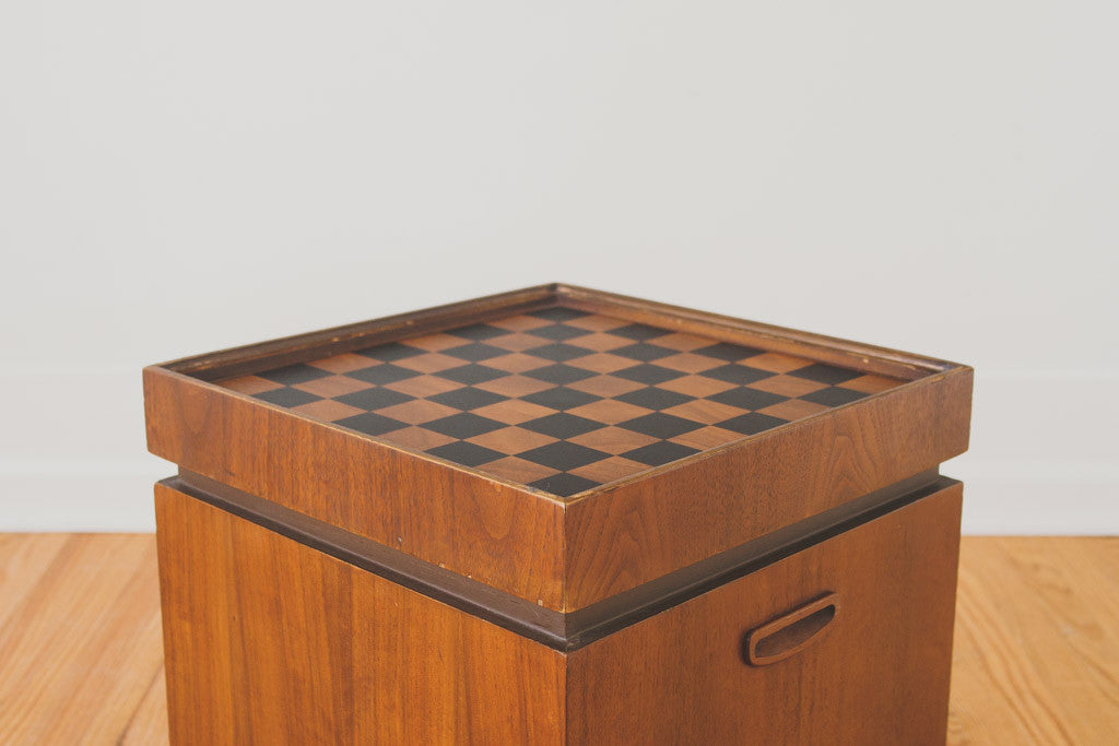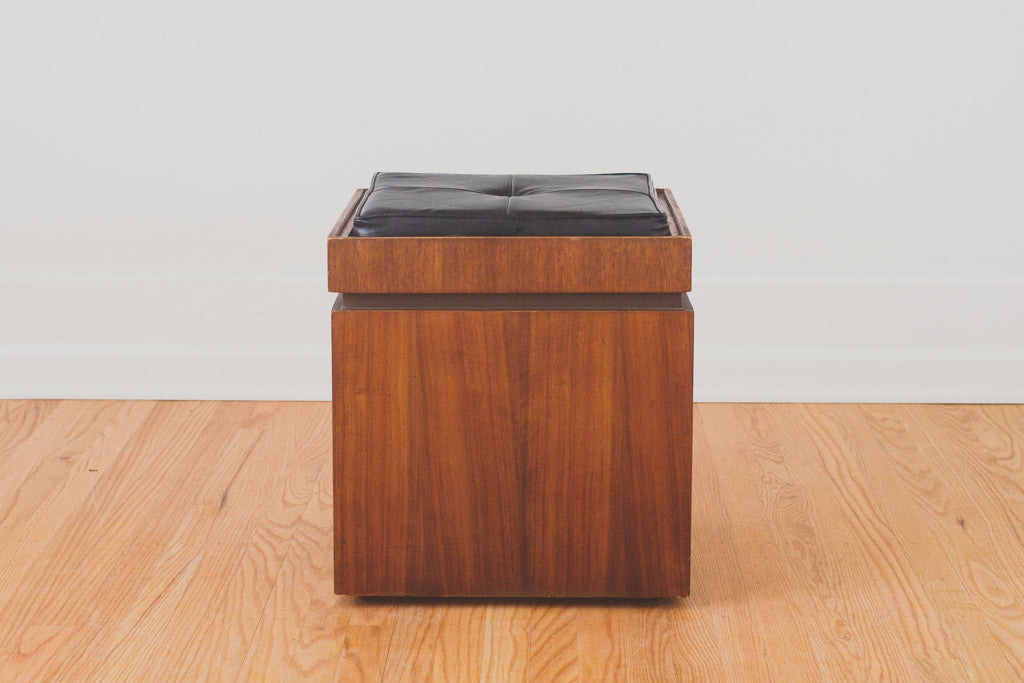 This vintage walnut storage stool was manufactured by Lane. It has casters and a reversible lid with a black leather cushion on one side and a chess or checker board on the other. It's in great shape with light age related wear. Please see pictures for detailed condition.