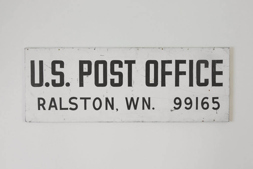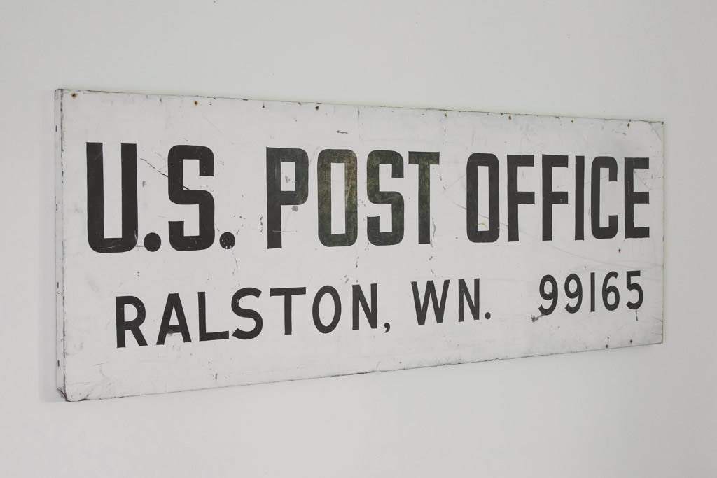 This hand-painted steel sign has distressed white paint and black lettering that reads, "U.S. Post Office Ralston, WN. 99165". It's interesting and rare to see WN as an abbreviation for Washington. It's in good shape with natural age related wear. Please see pictures for detailed condition.
