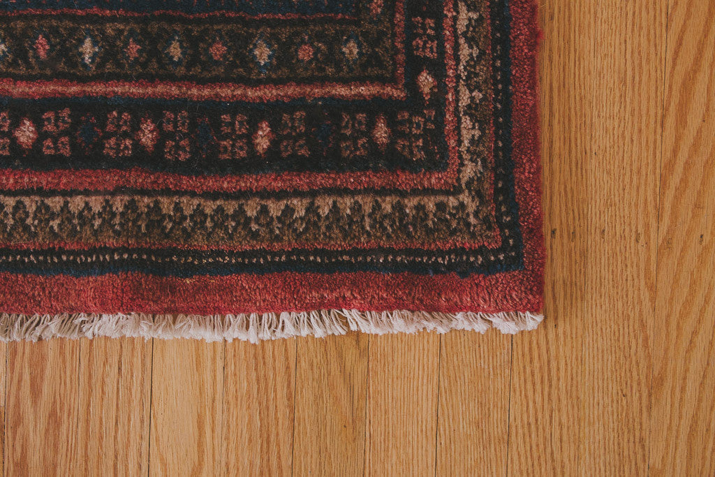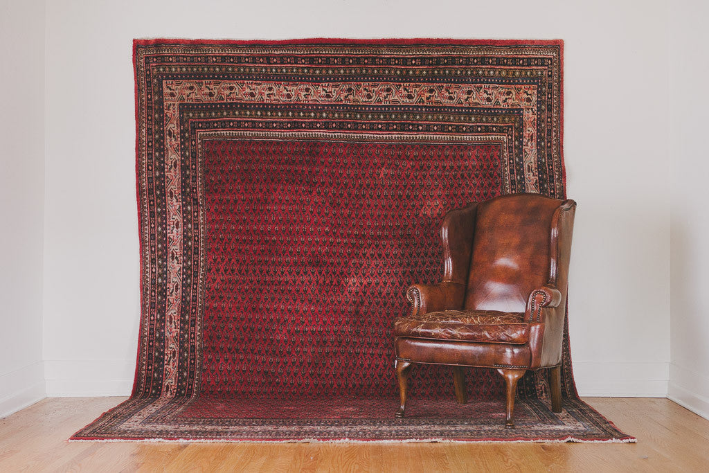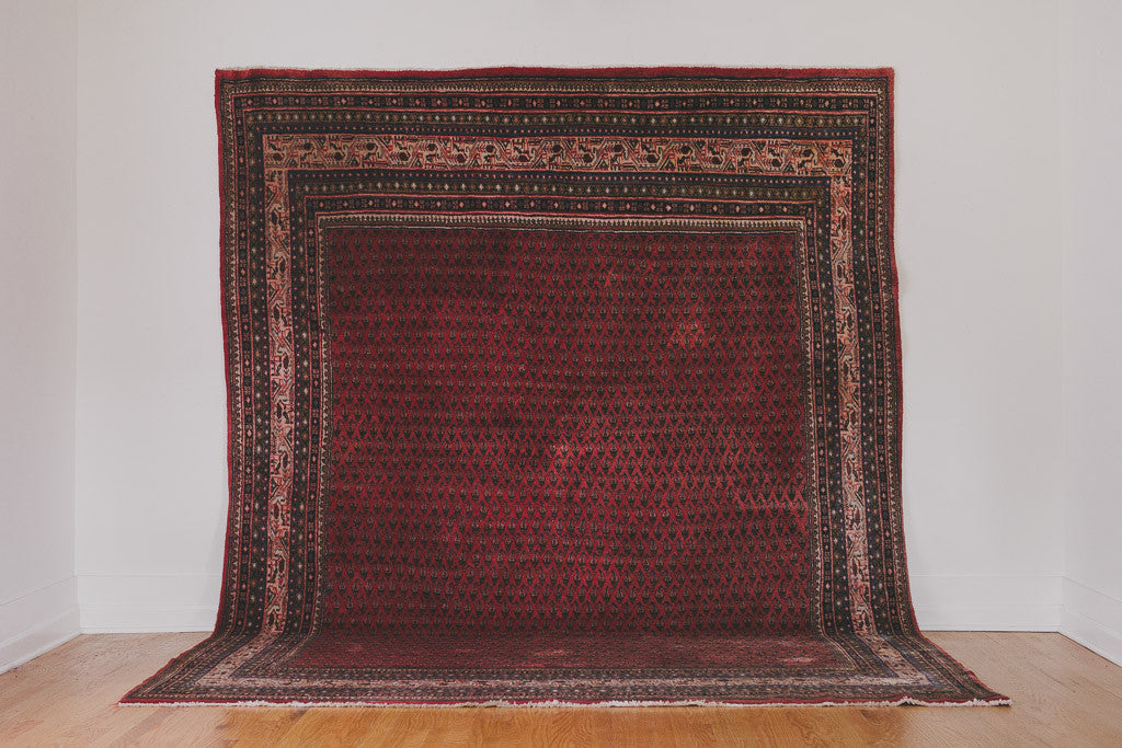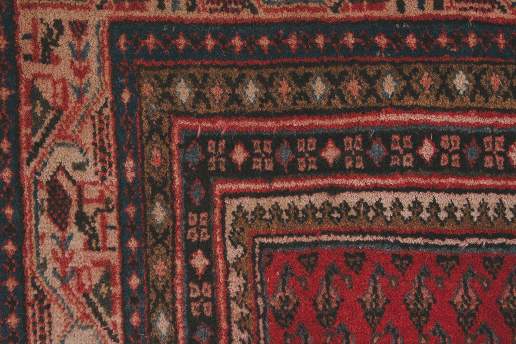 This large Persian handwoven rug has a red base with green, blue, tan and mustard accents. It's in great shape with light age related wear. Please see pictures for detailed condition.