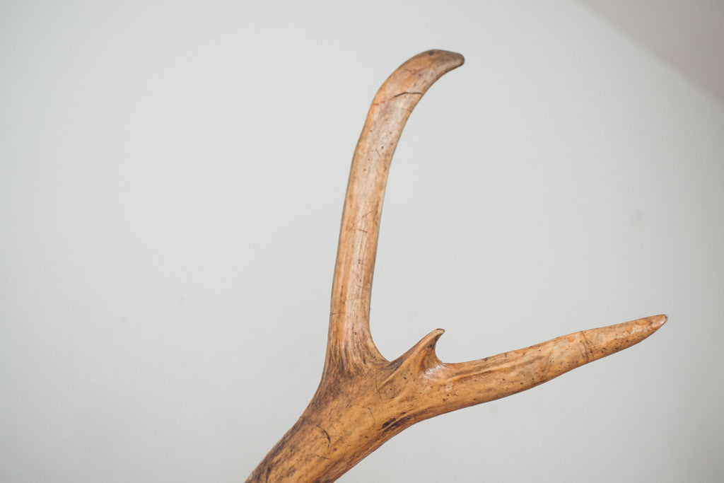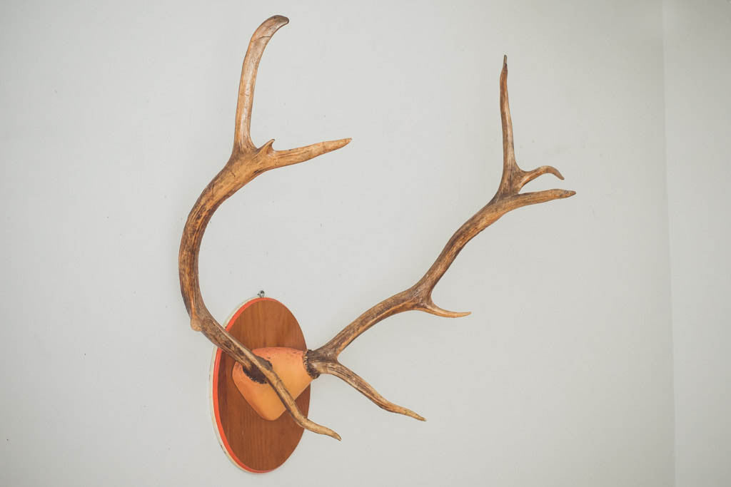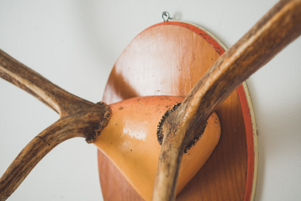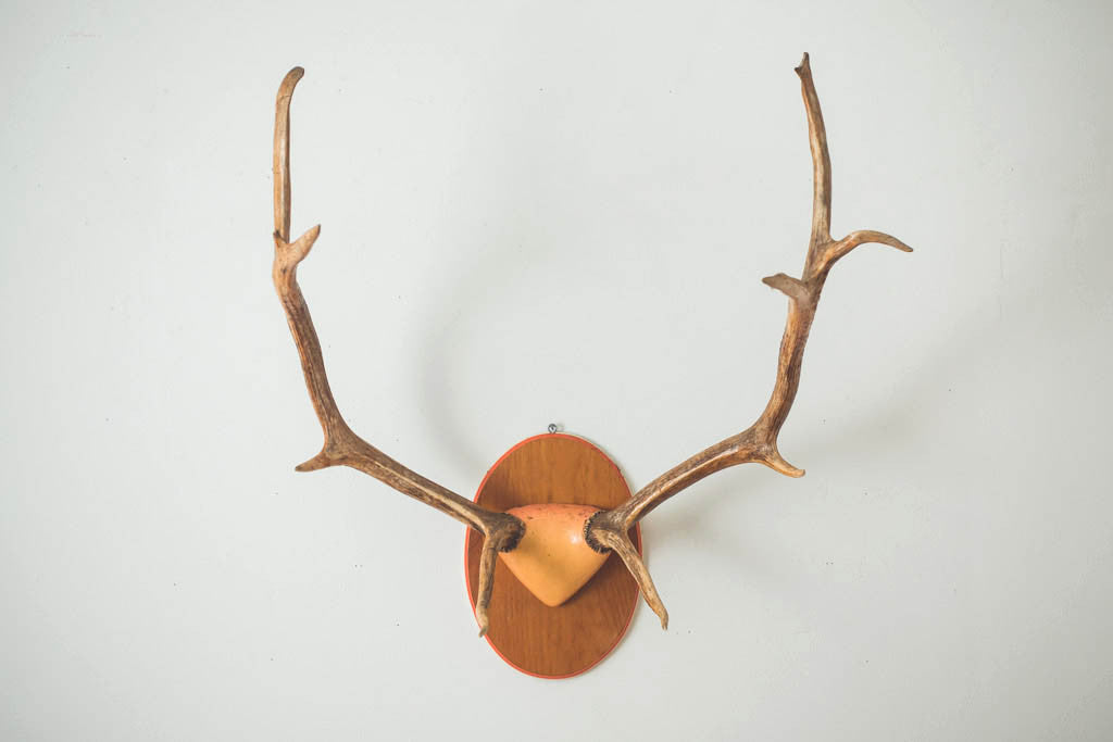 These large vintage elk antlers are mounted on a wood plaque with orange accents. They're in good shape with age related wear. See pictures for detailed condition.