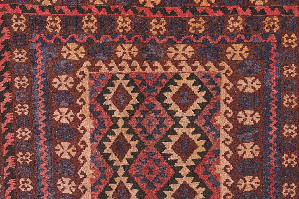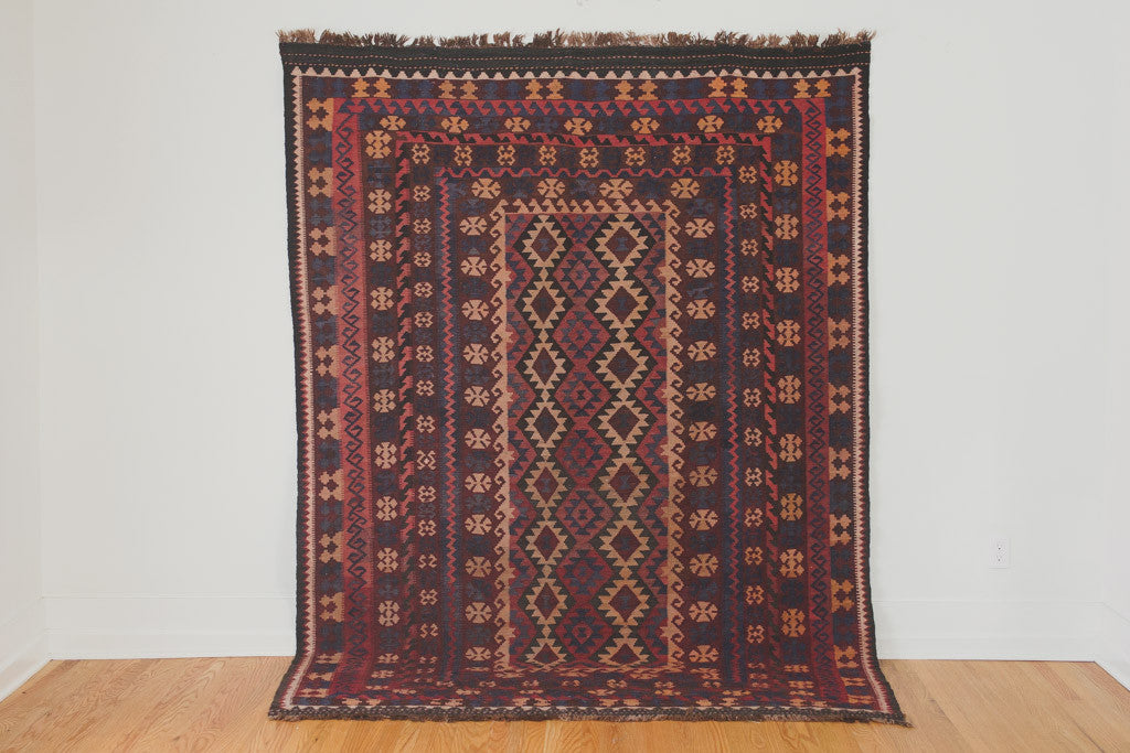 This vintage kilim handwoven rug has a burgundy base with navy, tan, red, brown and black accents and dark fringe. It's in good shape with age related wear. Please see pictures for detailed condition.