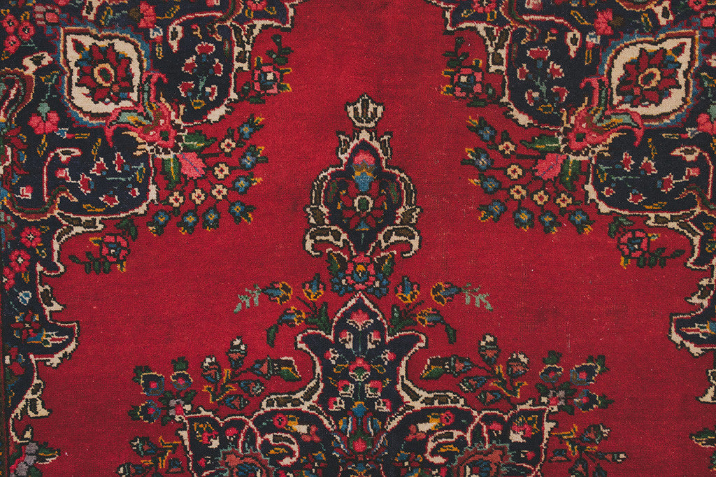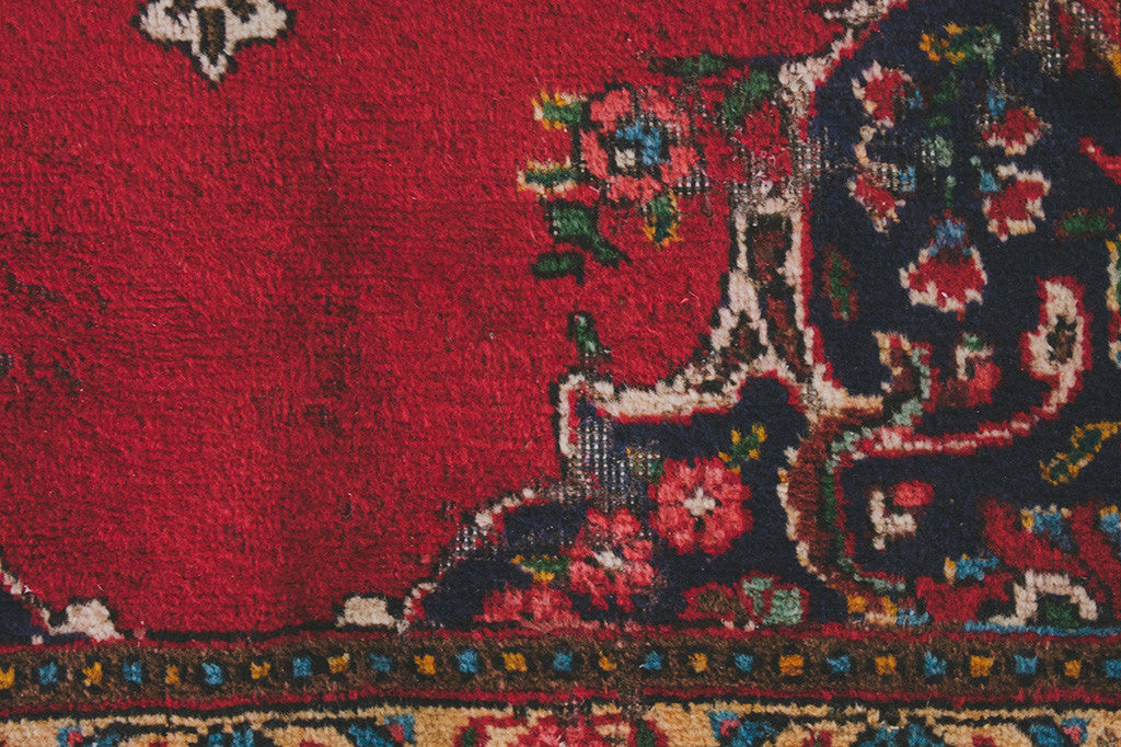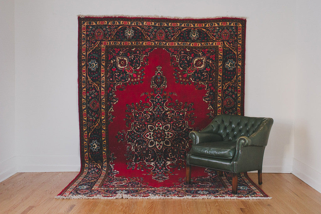This large vintage Persian handwoven rug has a bright red base with blue, mustard and green accents. It's in great shape with age related wear that is heavier in spots but without holes or tears. Please see pictures for detailed condition.