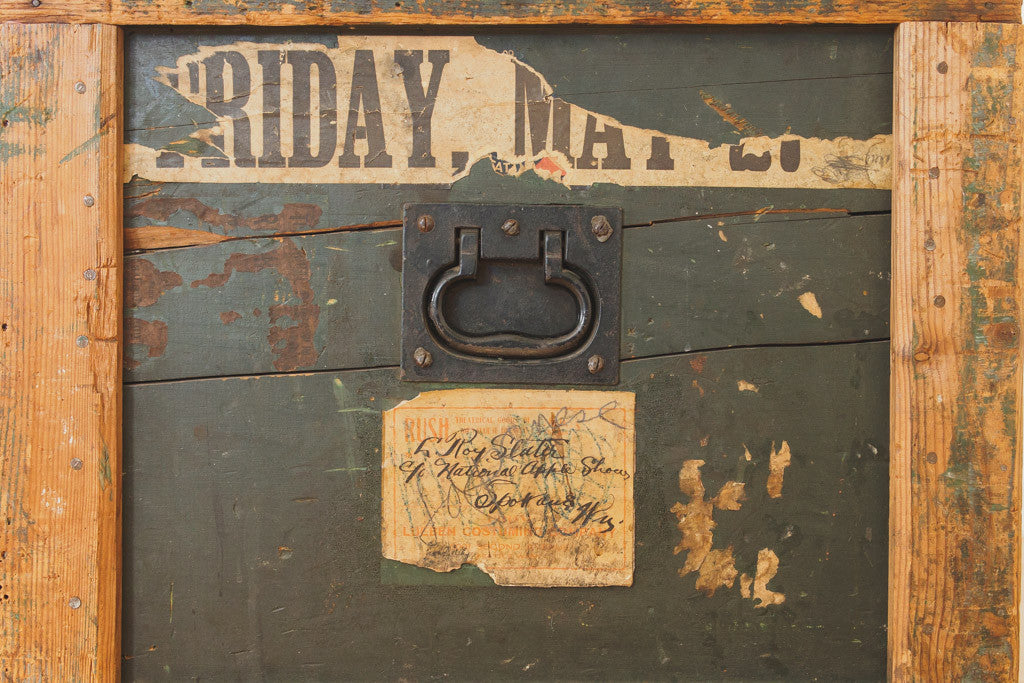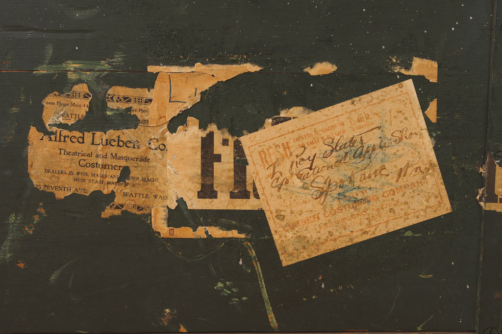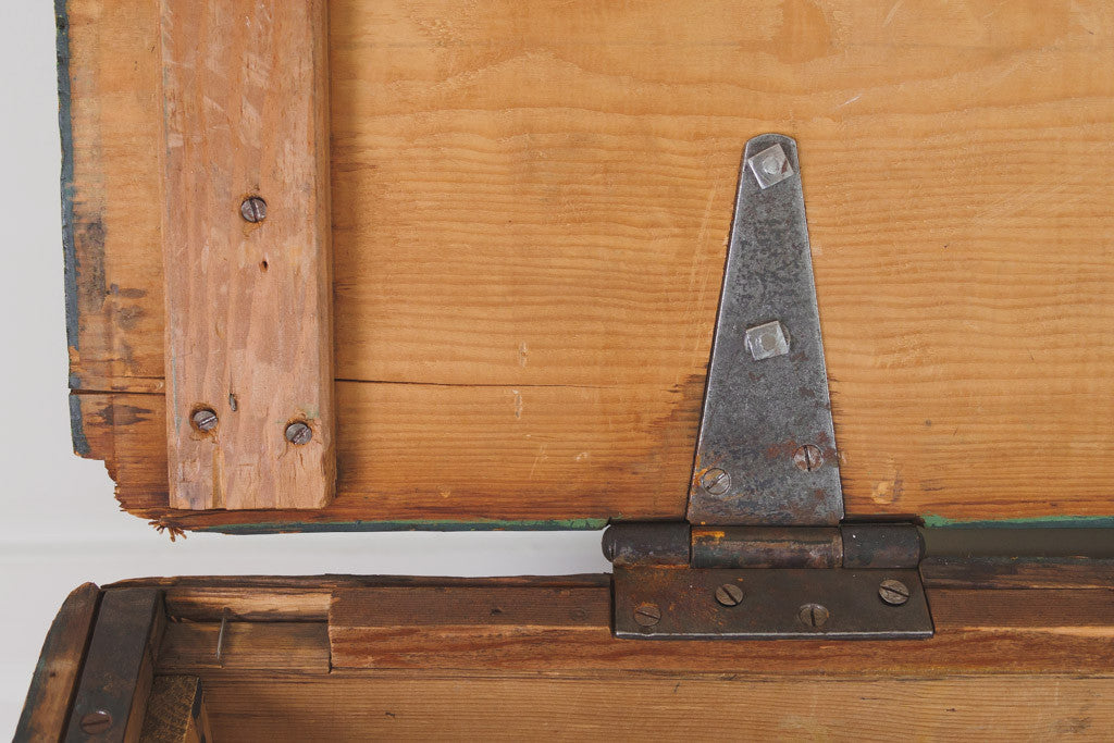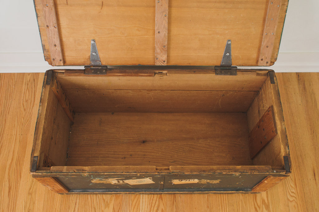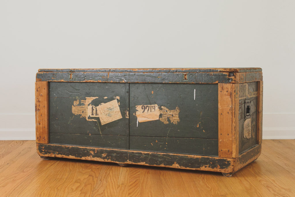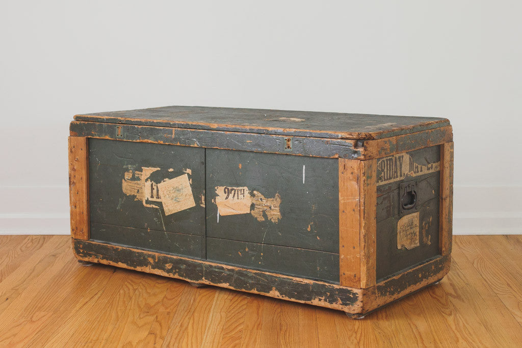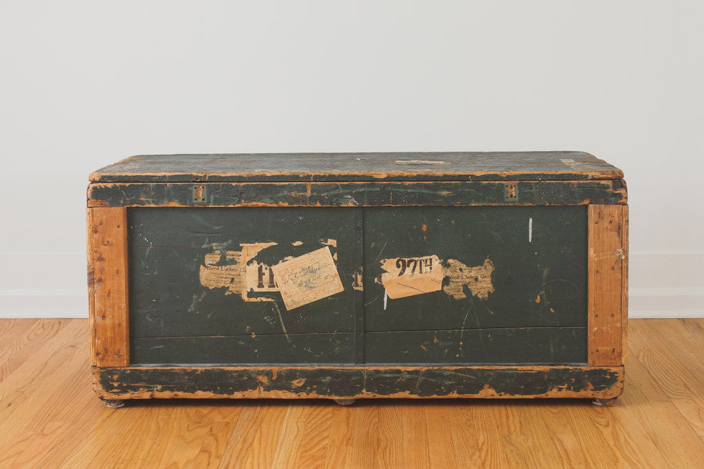 This large dark green painted wood trunk has a nicely distressed patina, paper labels, rustic metal handles and a generous amount of internal storage space. It's in good shape with age related wear and would make a great bench or larger coffee table. Please see pictures for detailed condition.