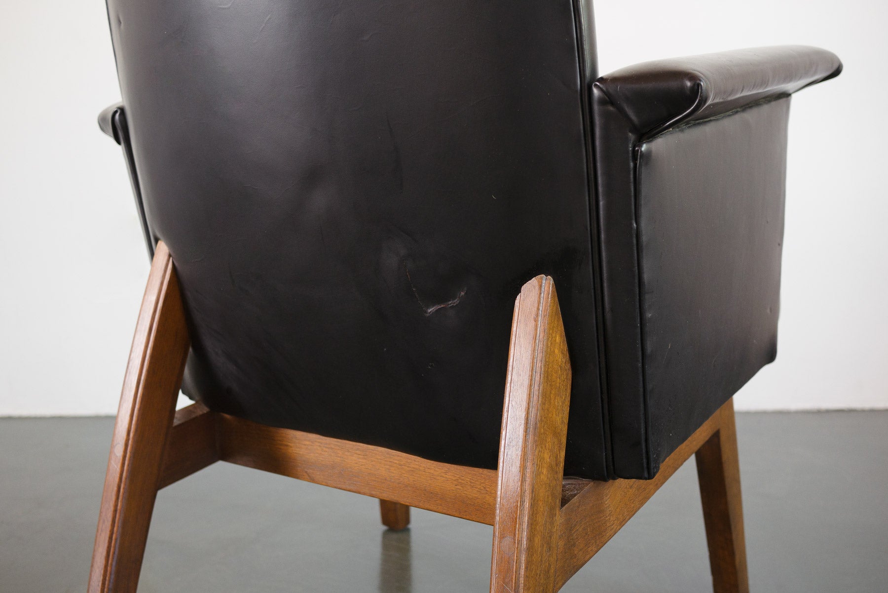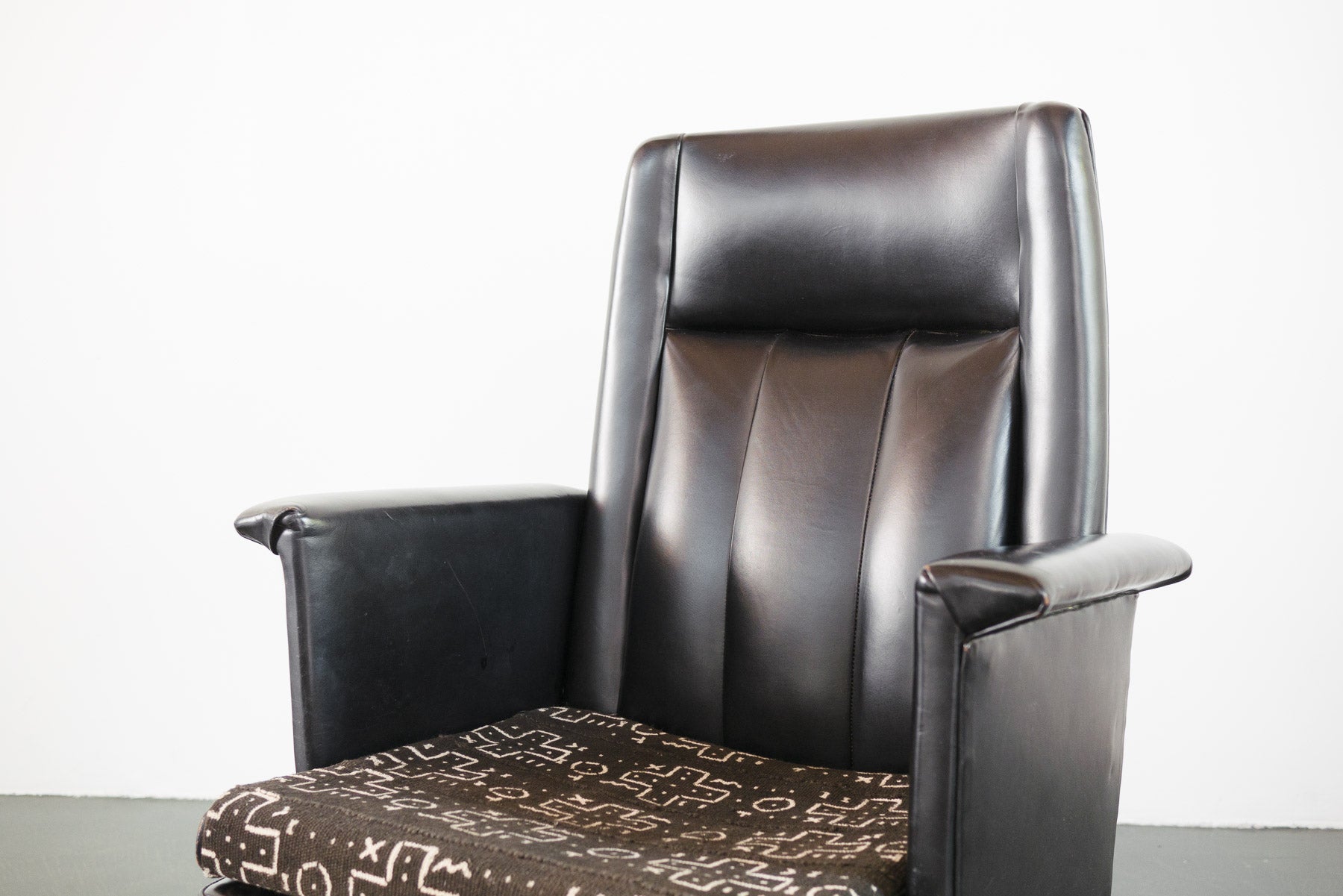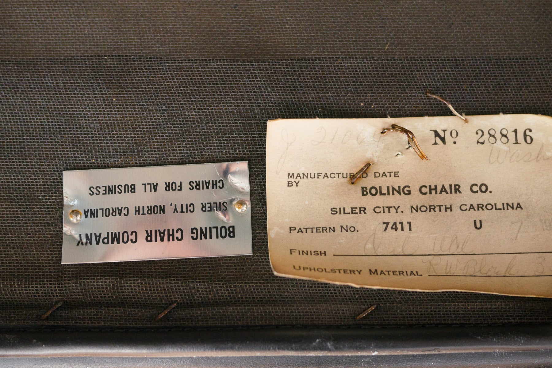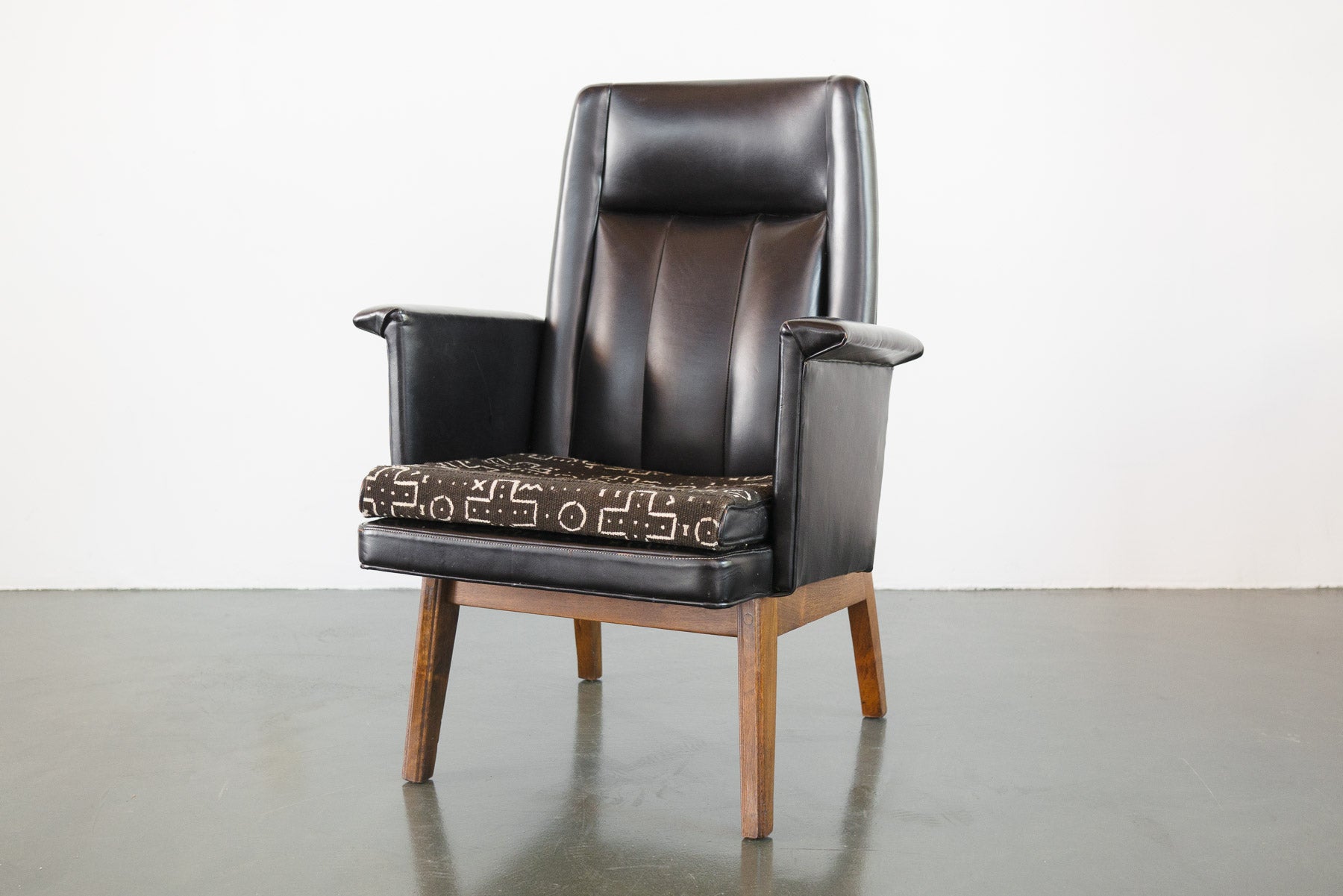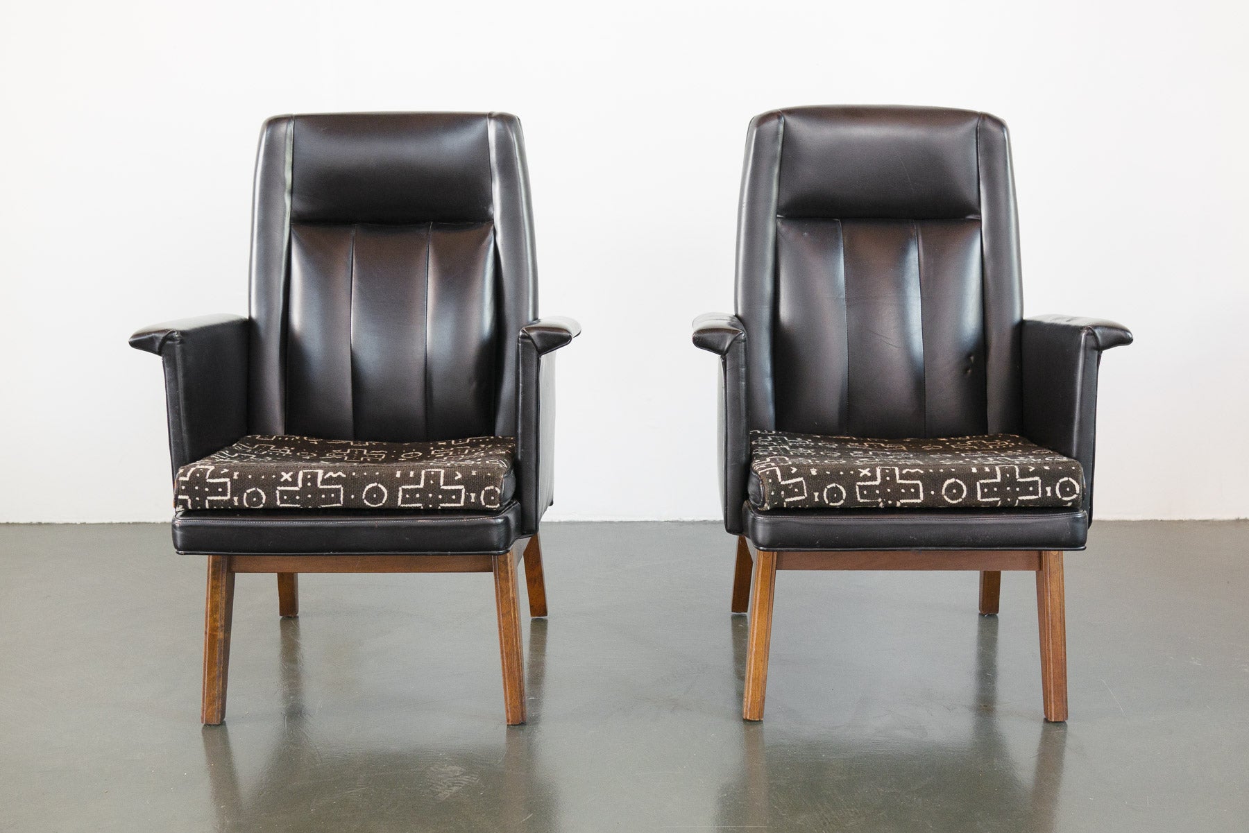 style: pair, modern, high back, arm chairs material: leather (black), mud cloth, wood (walnut) age: vintage, Mid Century, 1968 brand: Boling Chair Company, North Carolina condition: good, age related wear/repair - see pictures other: priced as a pair