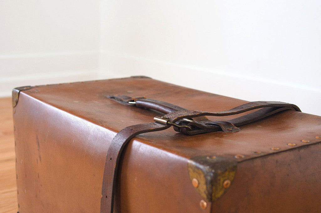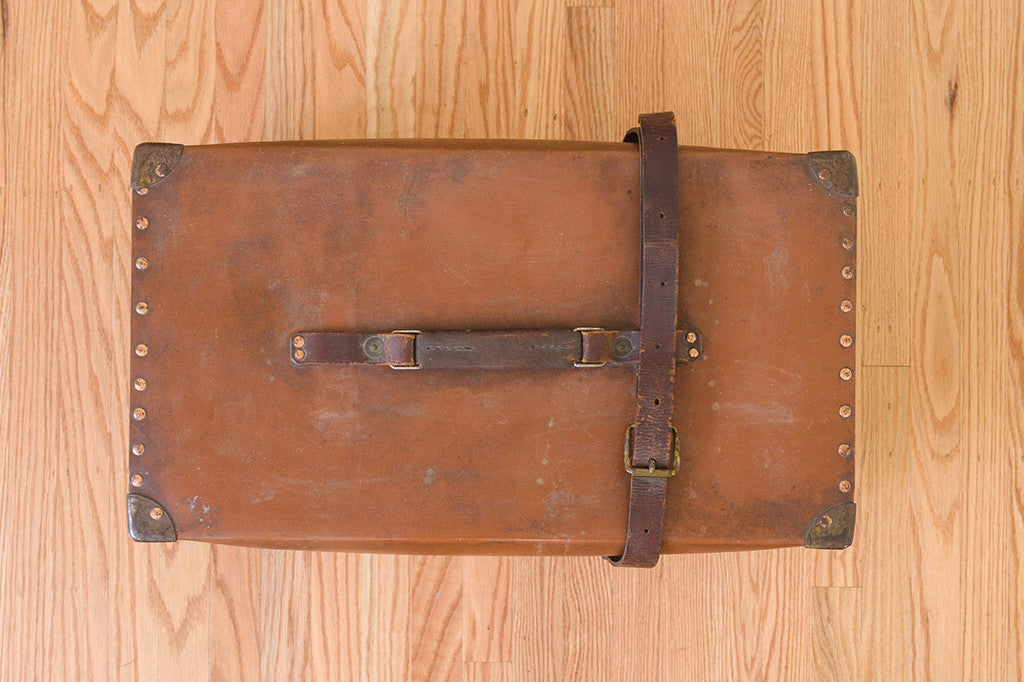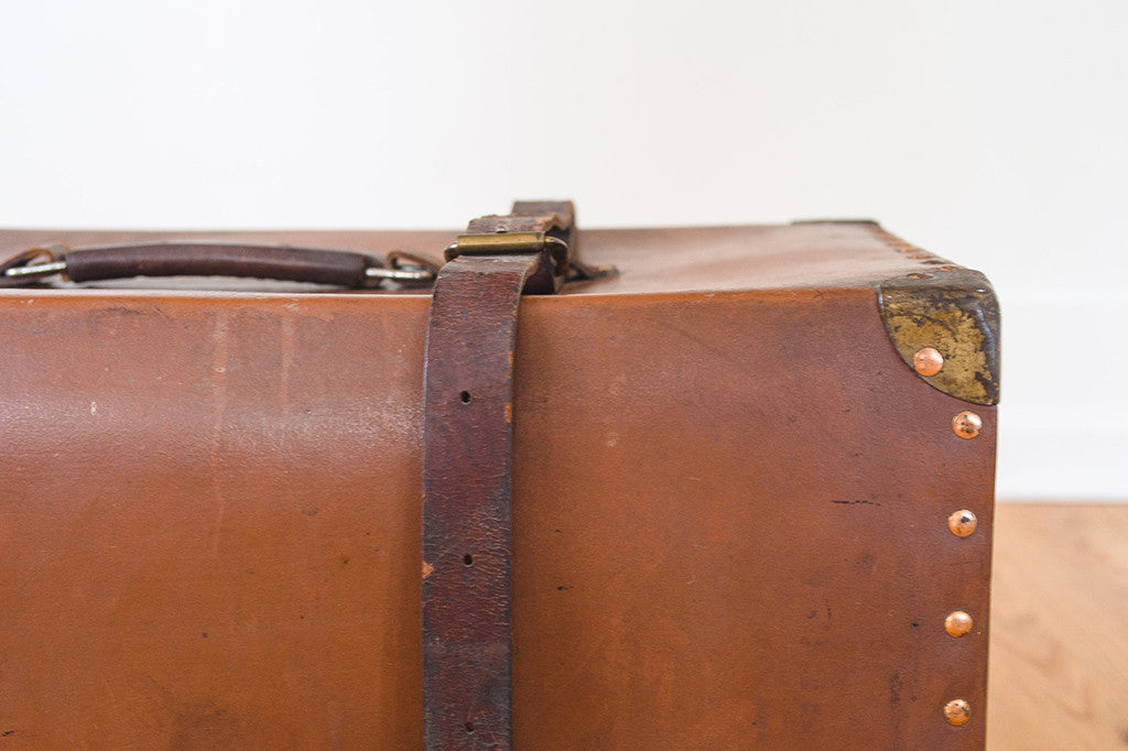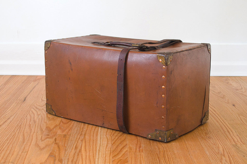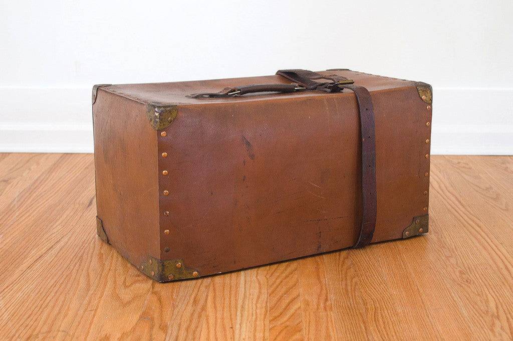 This vintage trunk is covered in leather with a darker leather strap and handle. It would be a nice little side table next to a club chair, as an ottoman or used for extra storage of any type. It has age related wear and great patina. Please see pictures for detailed condition of this piece.