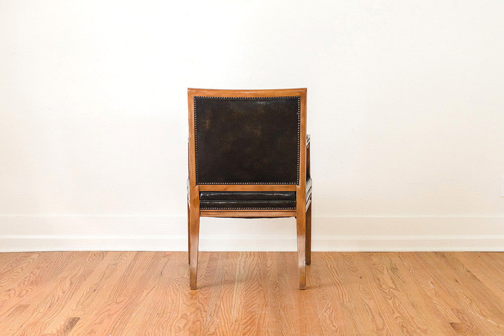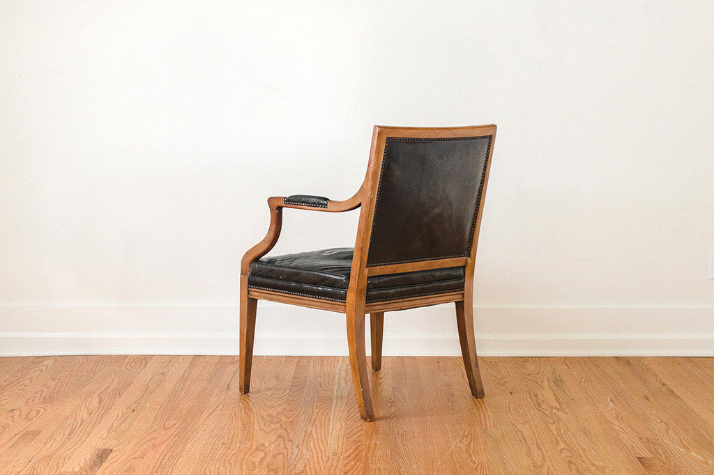 These vintage chairs are upholstered in black leather. They have a wood frame, brass nailhead accents and an attached seat cushion. They're in great overall shape with some light age related wear. Please see pictures for detailed condition of these pieces.