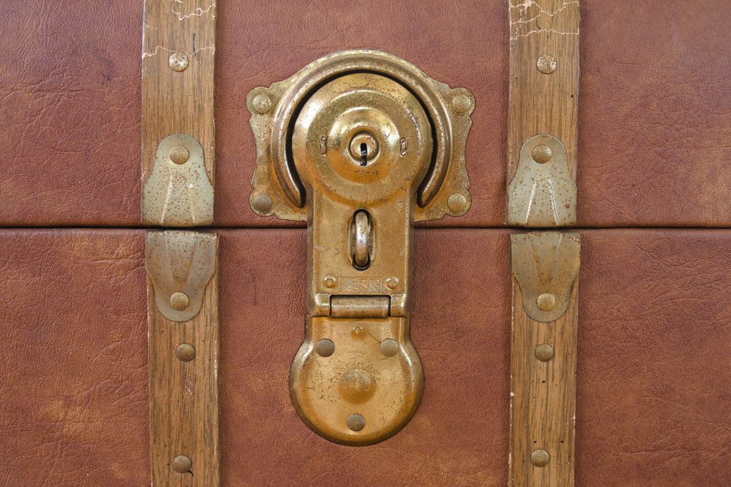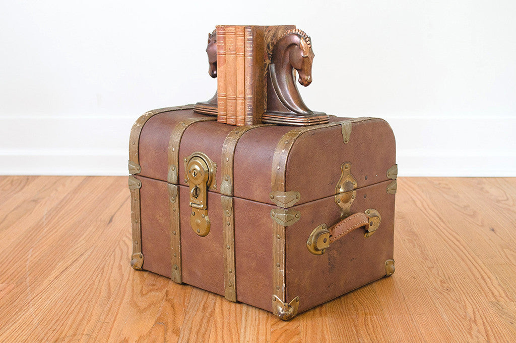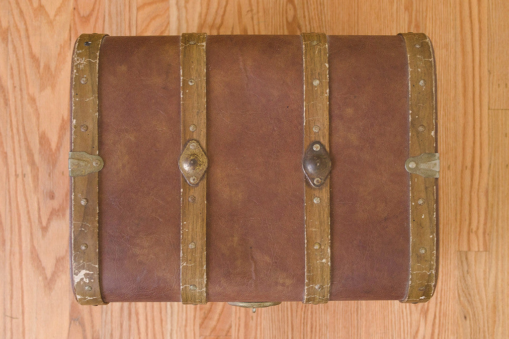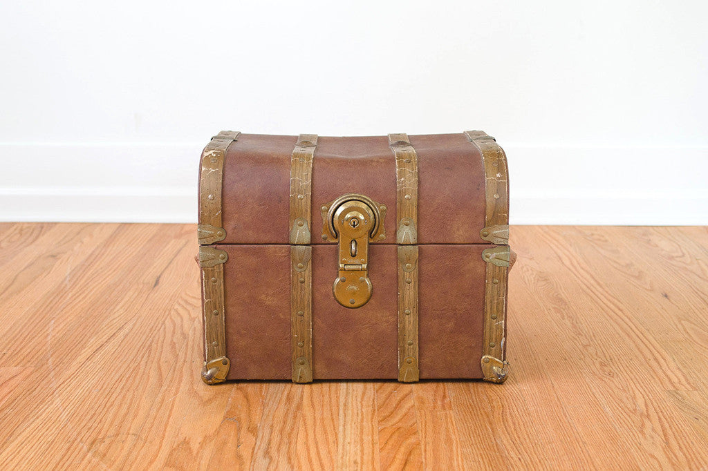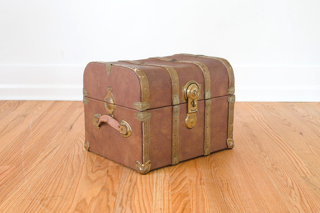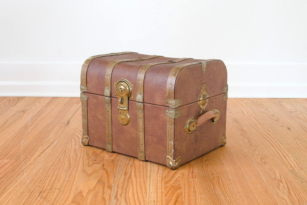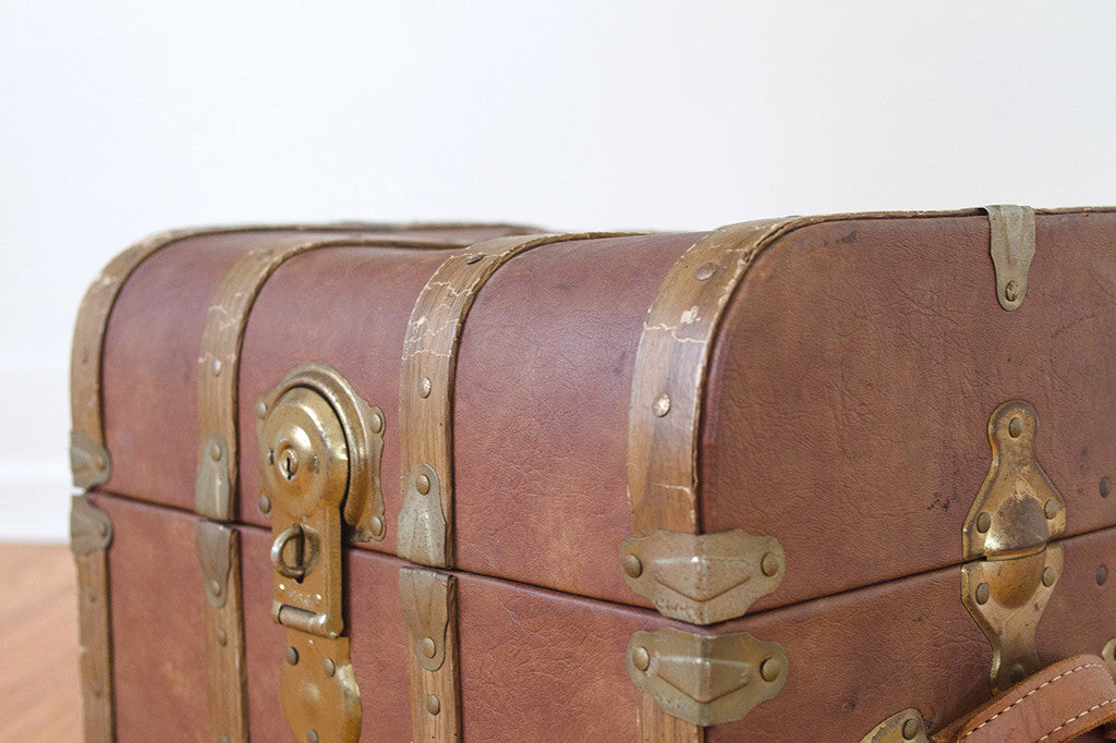 This vintage trunk is in remarkable shape. It's covered in leather with tweed lining and brass accents. It would be a nice little side table next to a club chair, used as an ottoman or for extra storage of any type. It has a key so if you're storing treasure it can be locked. Please see pictures for detailed condition of this piece.