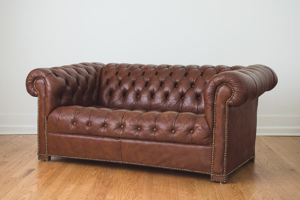 This vintage brown leather chesterfield sofa was made by Classic Upholstery in Hickory, North Carolina. It has a fully tufted attached seat and nailhead trim. It was polished, conditioned and is in good shape with age related distressing and wear. See pictures for detailed condition.