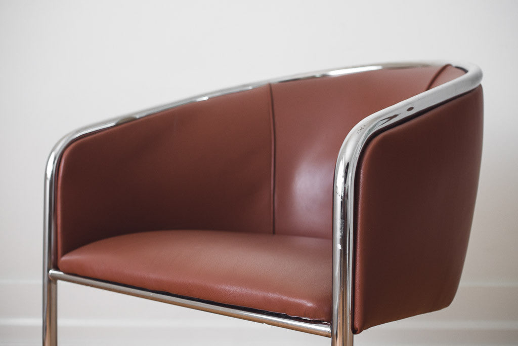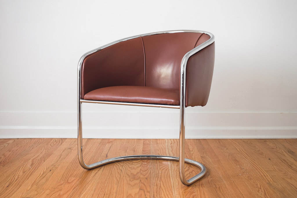 This vintage chrome barrel back cantilevered chair has new brown leather upholstery. It's in great shape with age related wear. See pictures for detailed condition.