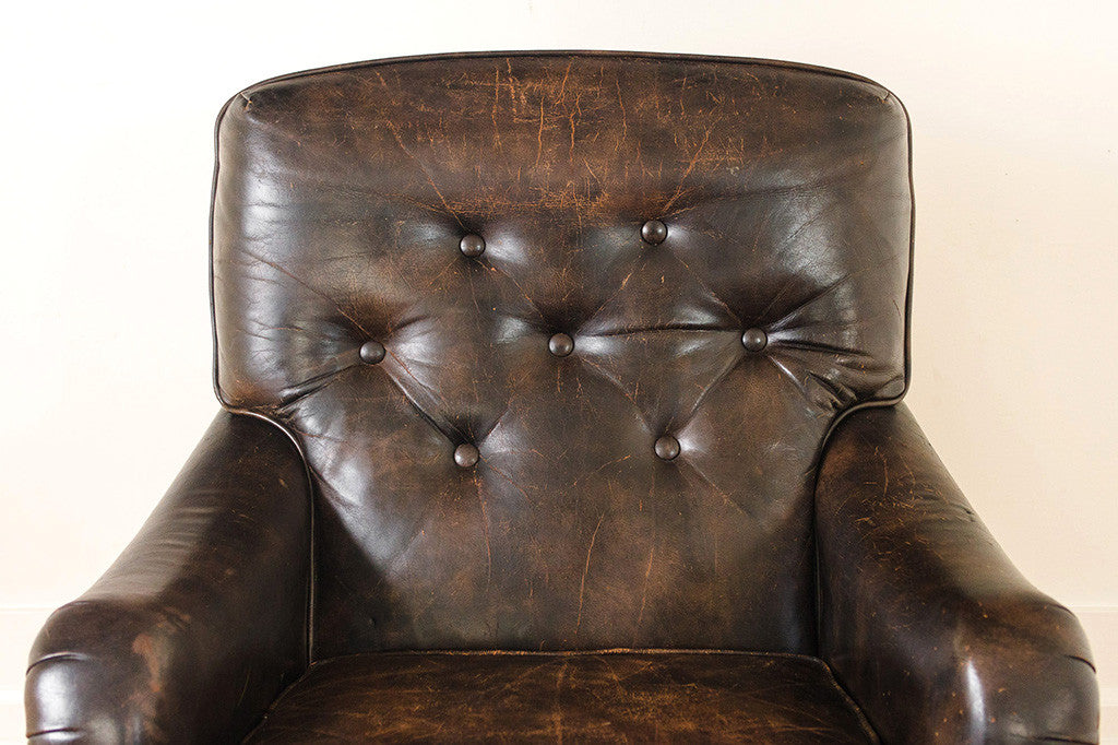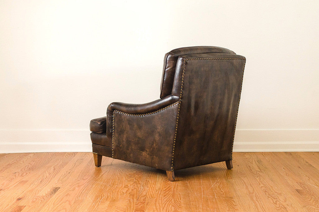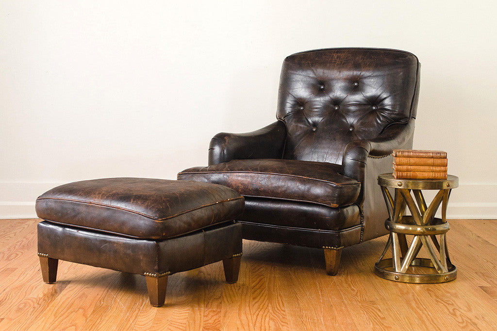 This handsome vintage club chair and ottoman set was manufactured by Schafer brothers. It has distressed brown leather upholstery, brass nailhead trim and wood legs. This chair is in great overall shape with natural age related wear. Please see pictures for detailed condition of these pieces.