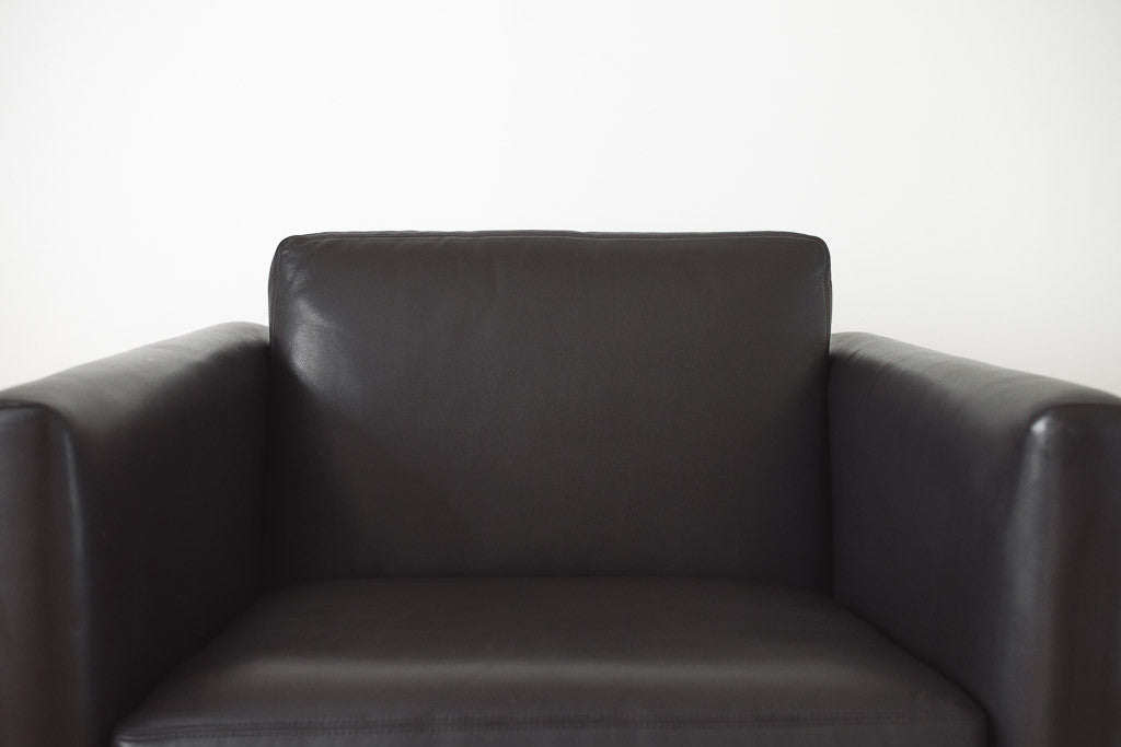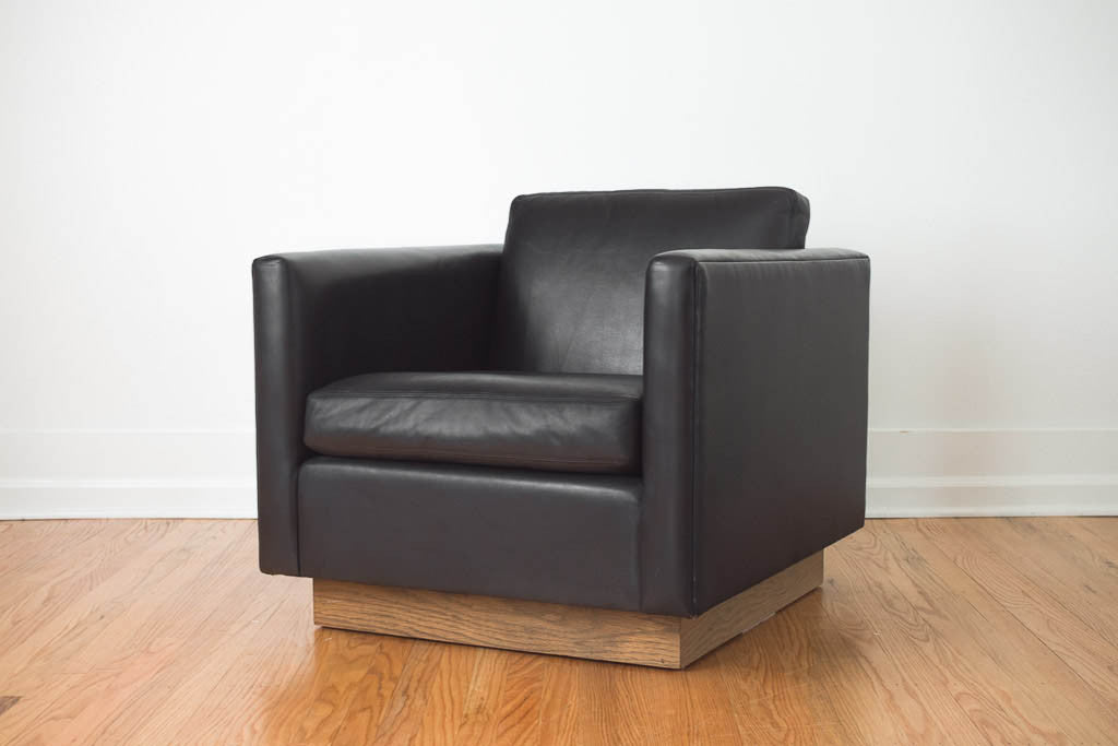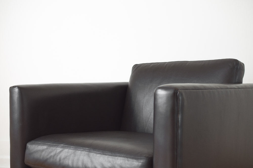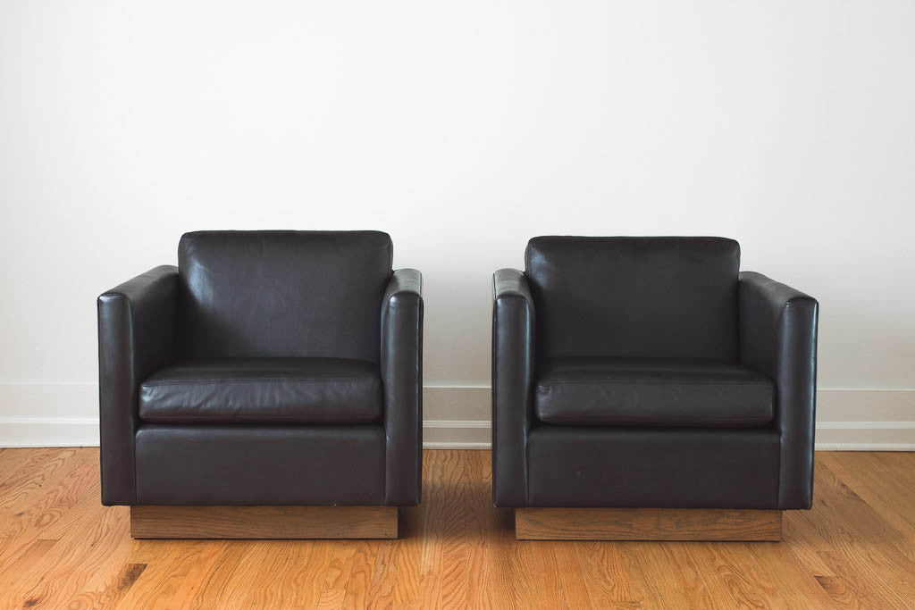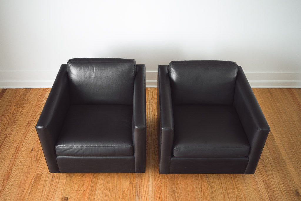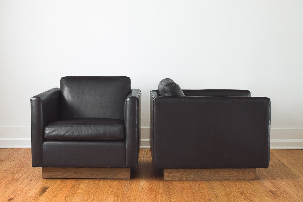 This pair of vintage grey leather club chairs were made in Seattle by Del-Teet. They were polished, conditioned and are in good shape with age related wear. See pictures for detailed condition. Price is for the set.