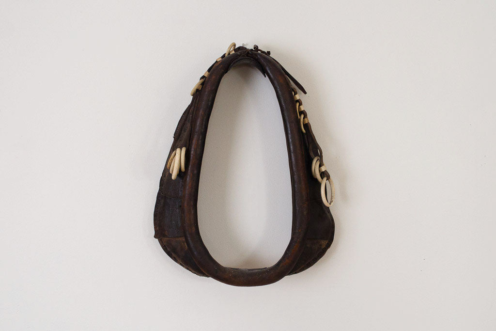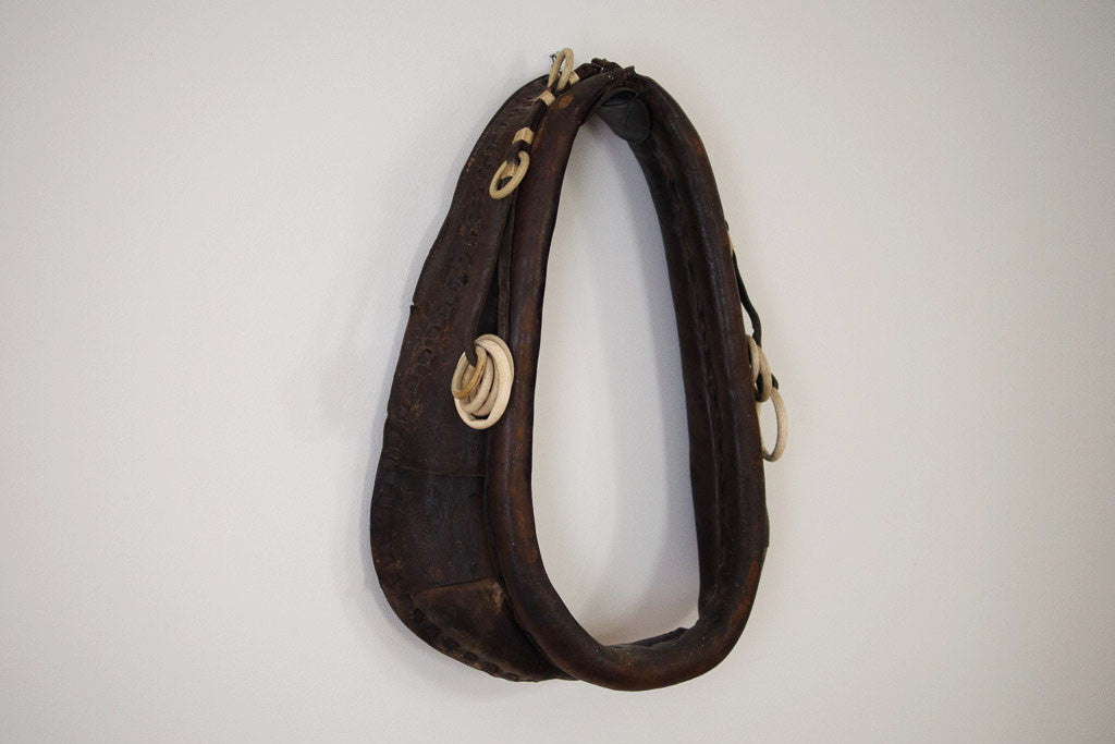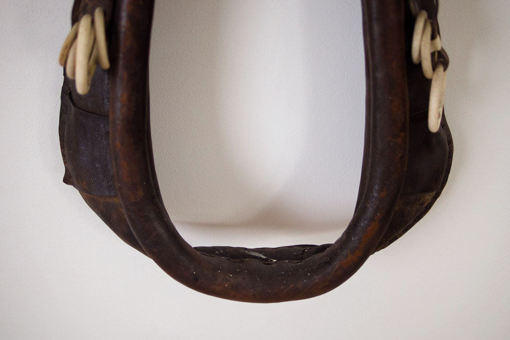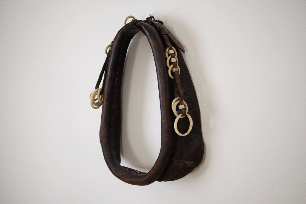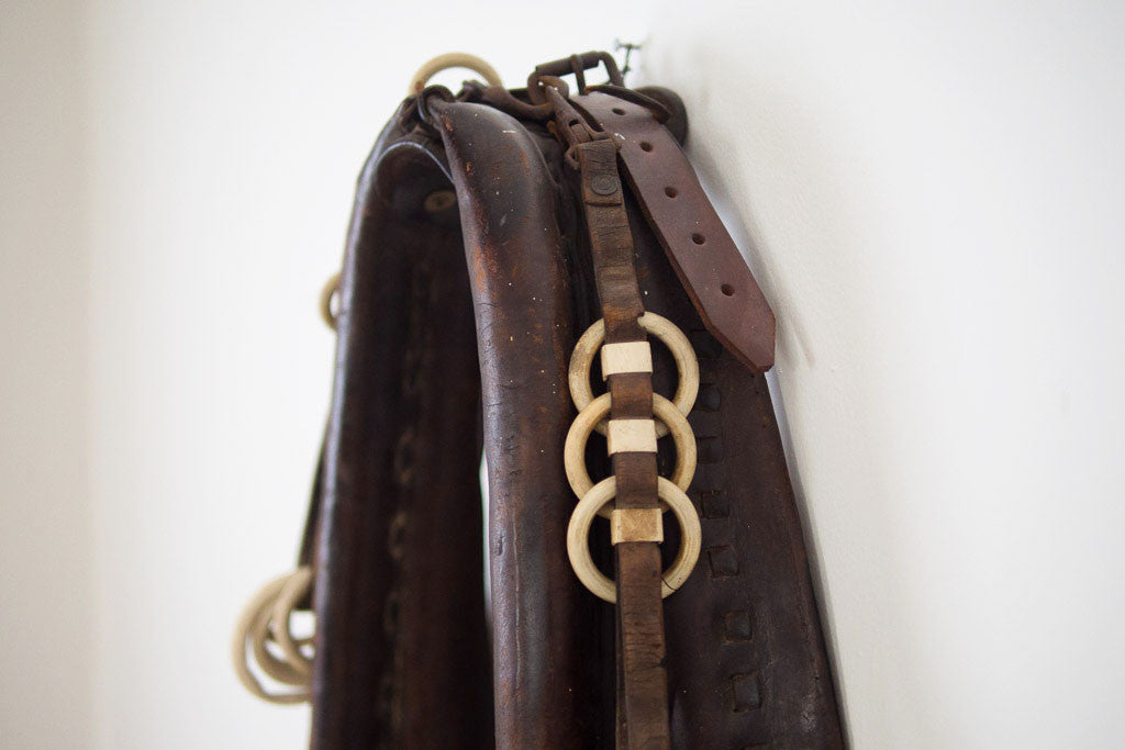 The distressed leather on this antique horse harness has a perfectly aged patina. It has great leather straps and cream rings that are most likely Bakelite. Leather this good needs to be displayed and appreciated. This piece is from our personal collection, we had it hanging in our bedroom.