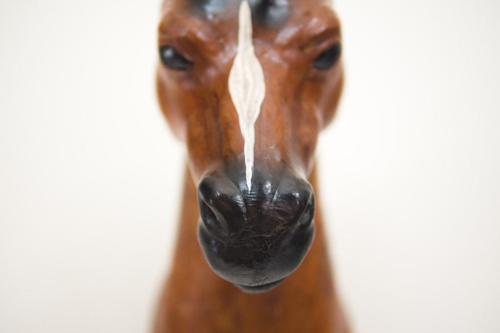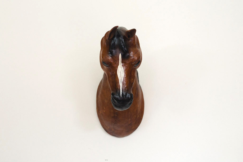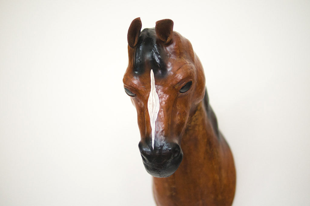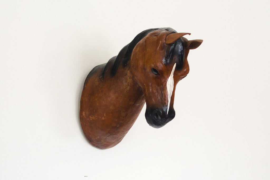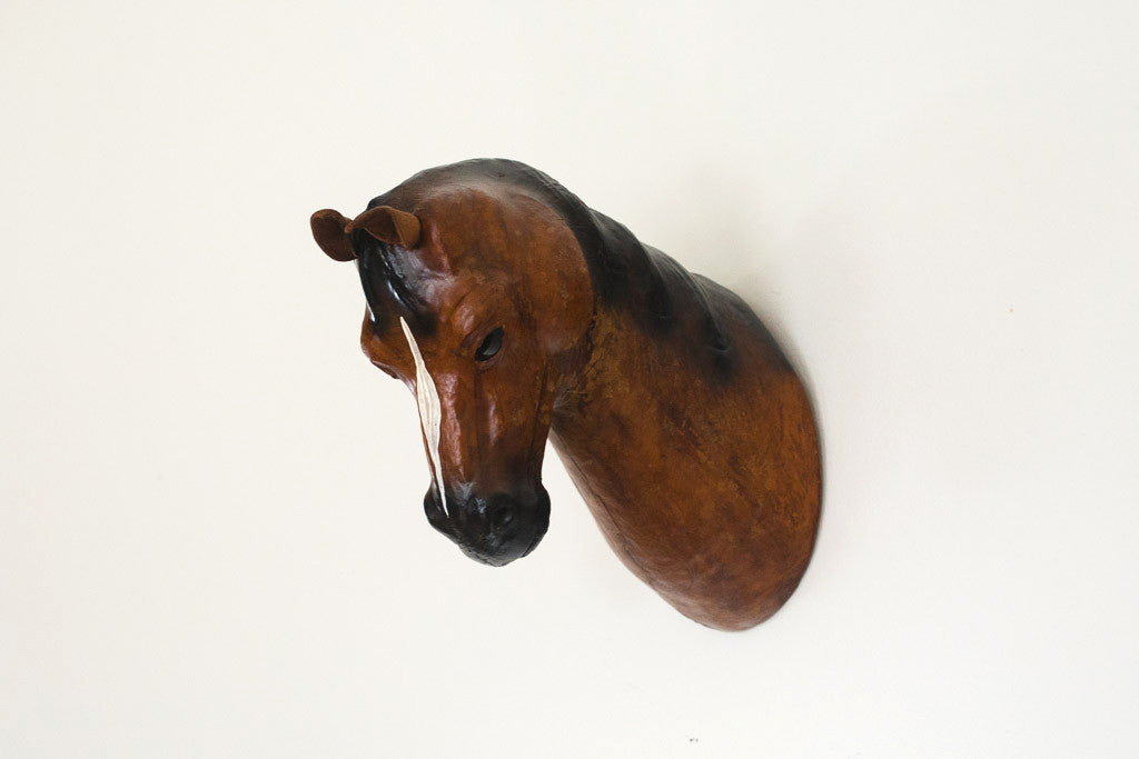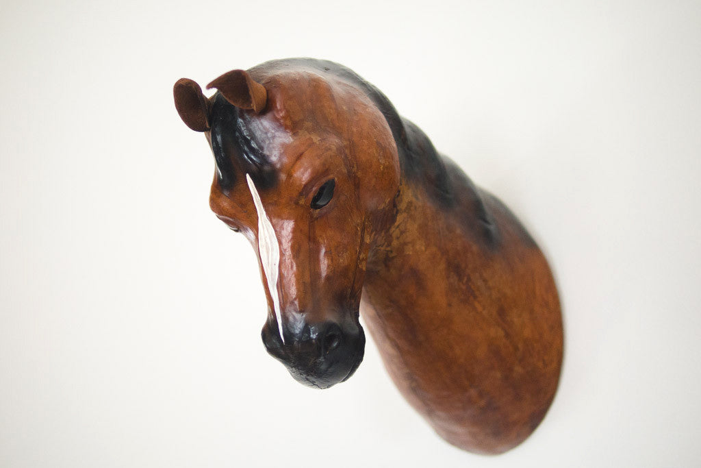 This vintage horse head was hand made and hand painted. It was crafted from a thick leather. It mounts on the wall like a traditional taxidermy piece.