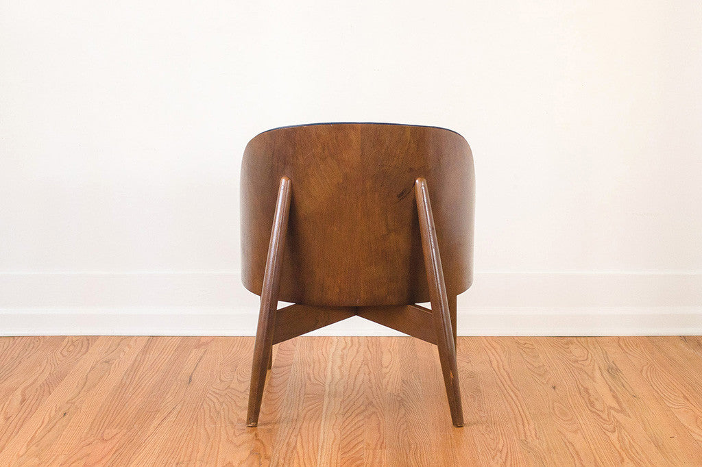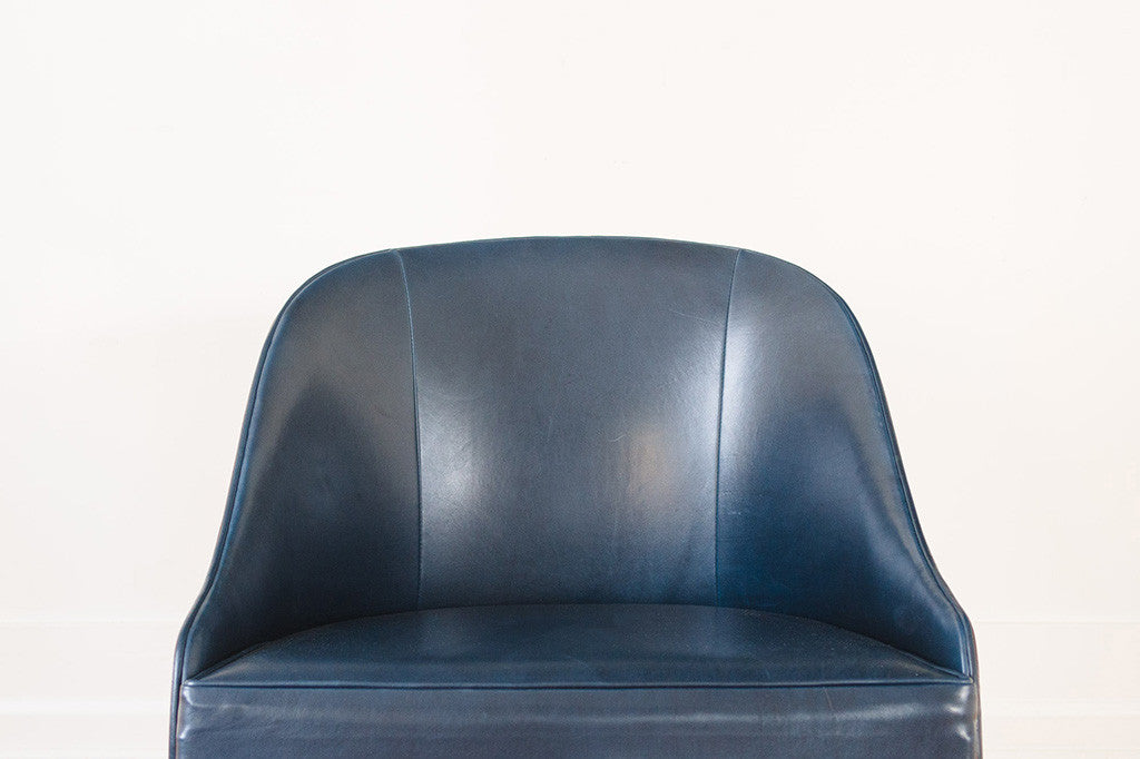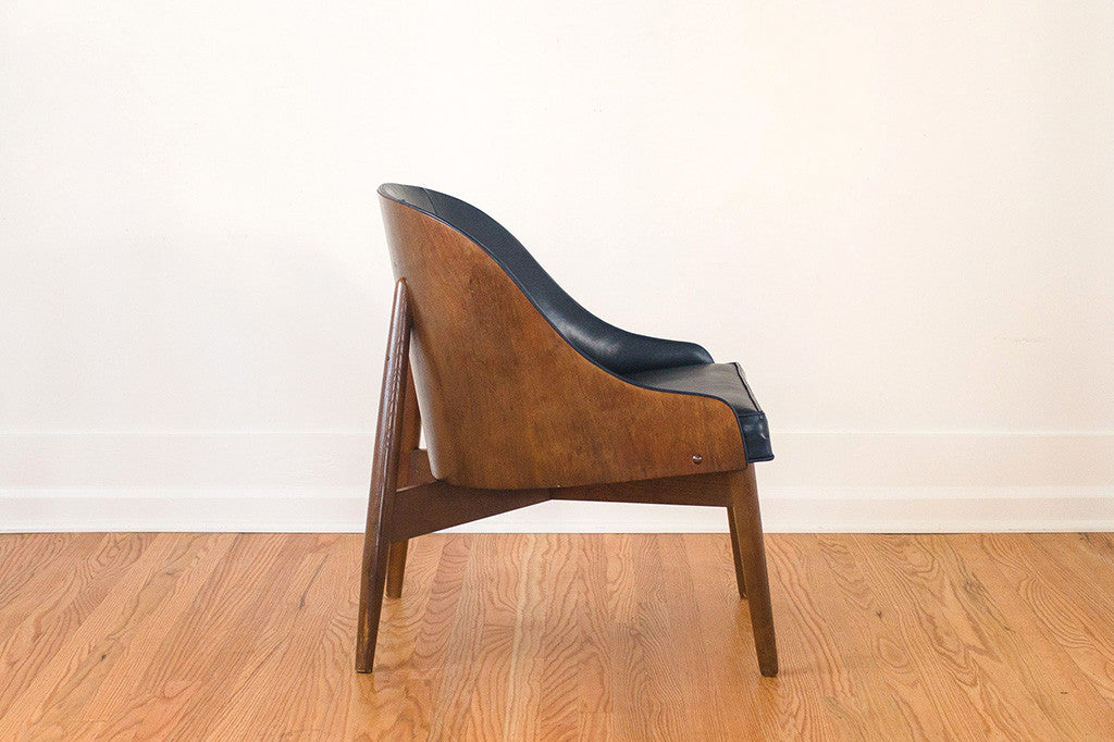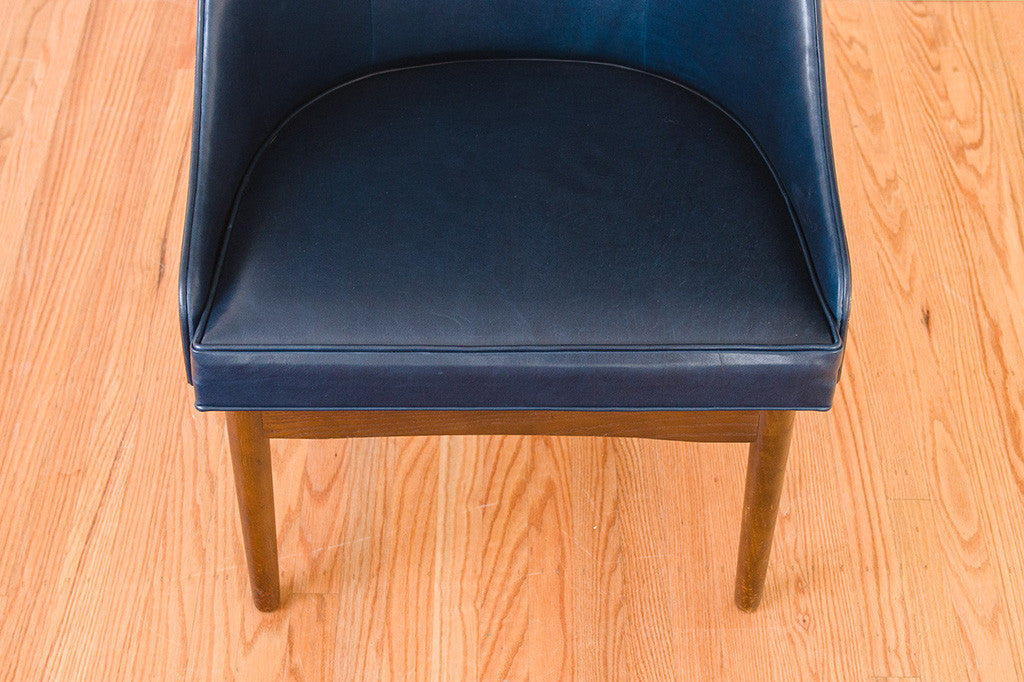 This vintage Kodawood chair has a handsome wood frame and new navy waxed leather upholstery. It's substantial without a having large footprint and deserves to be used somewhere it can be seen from all angles. It's in excellent shape with light wear to the frame. Please see pictures for detailed condition of this piece.