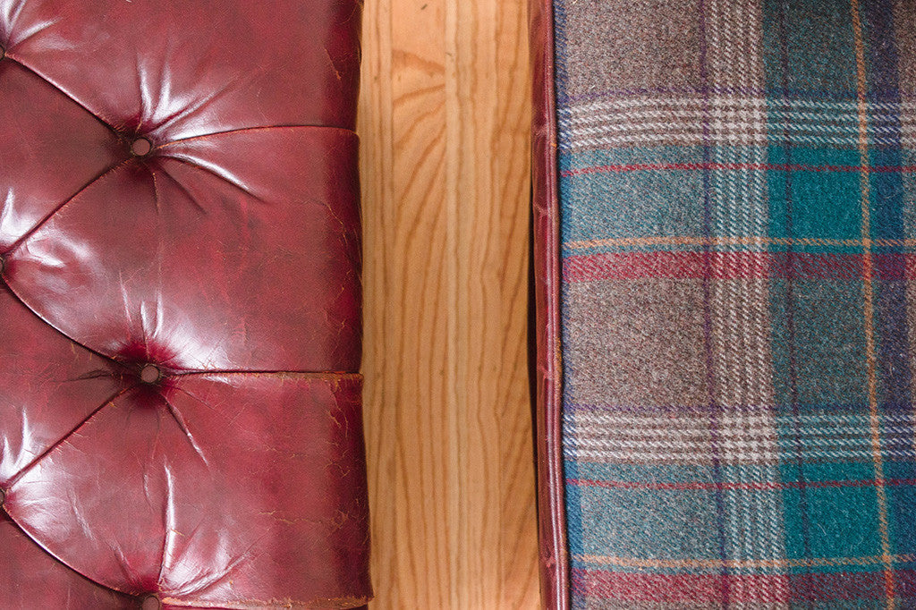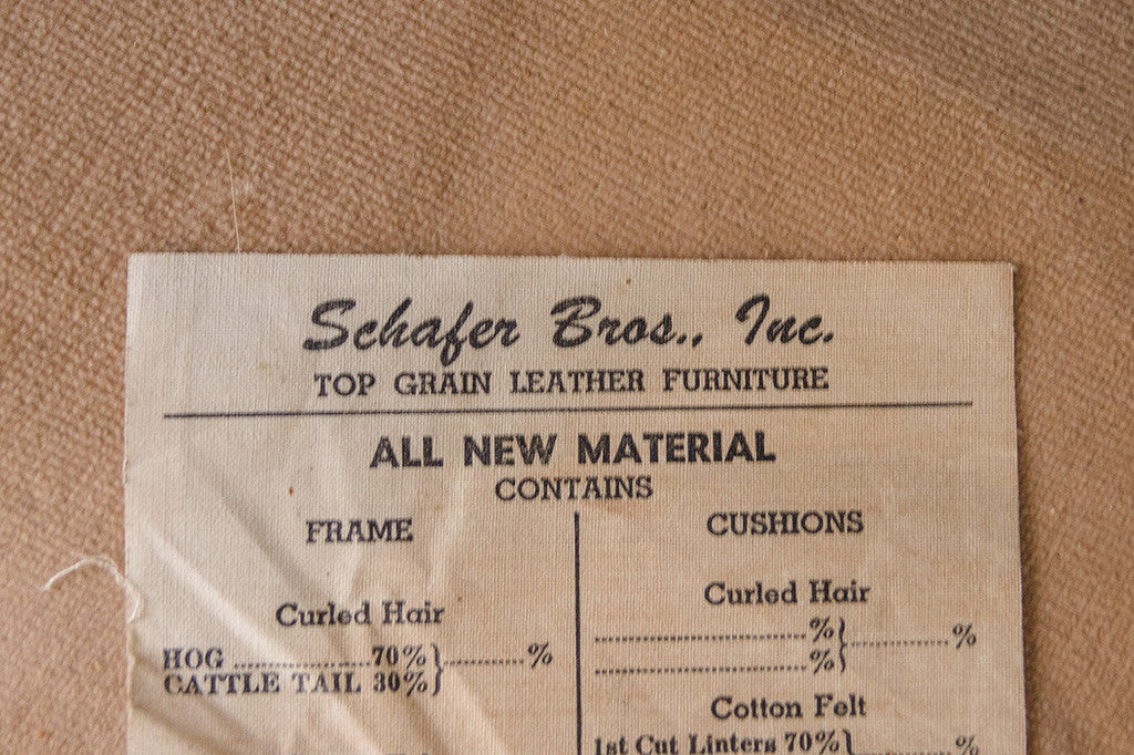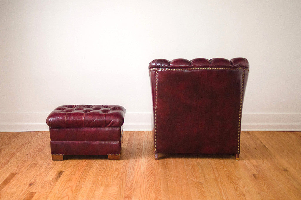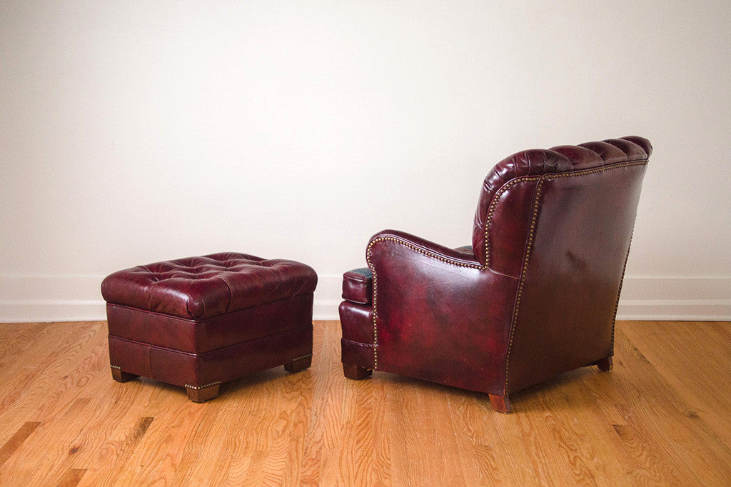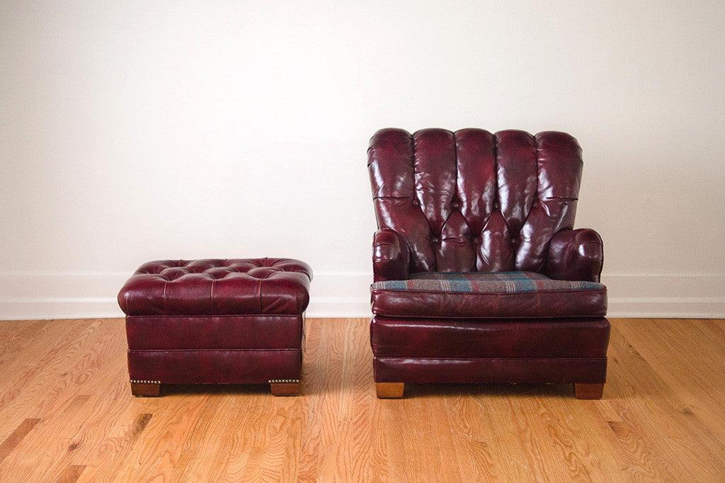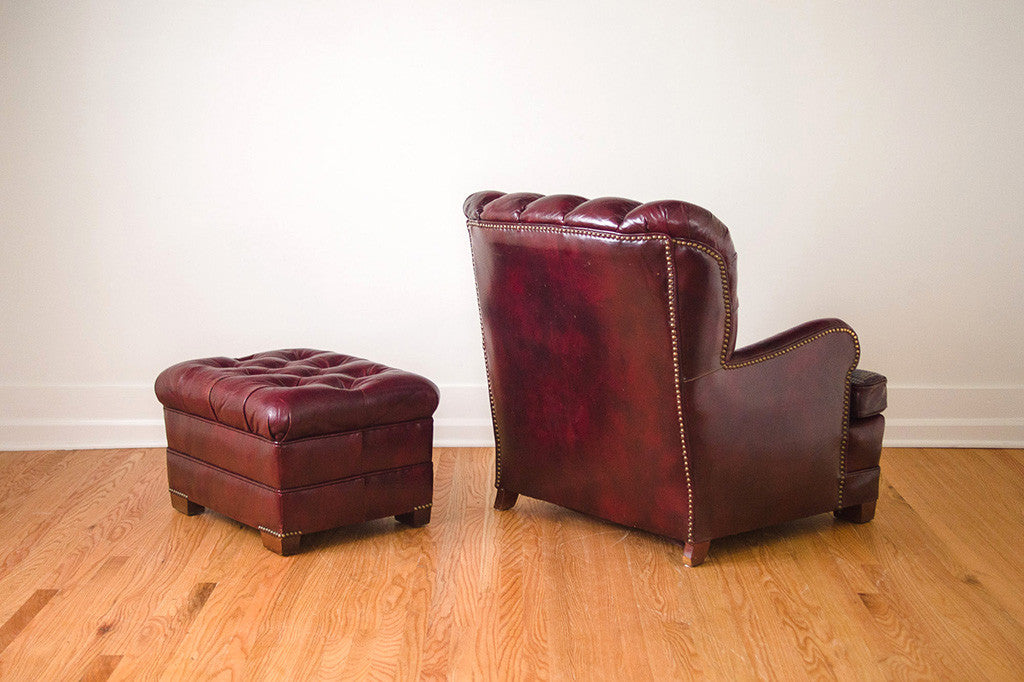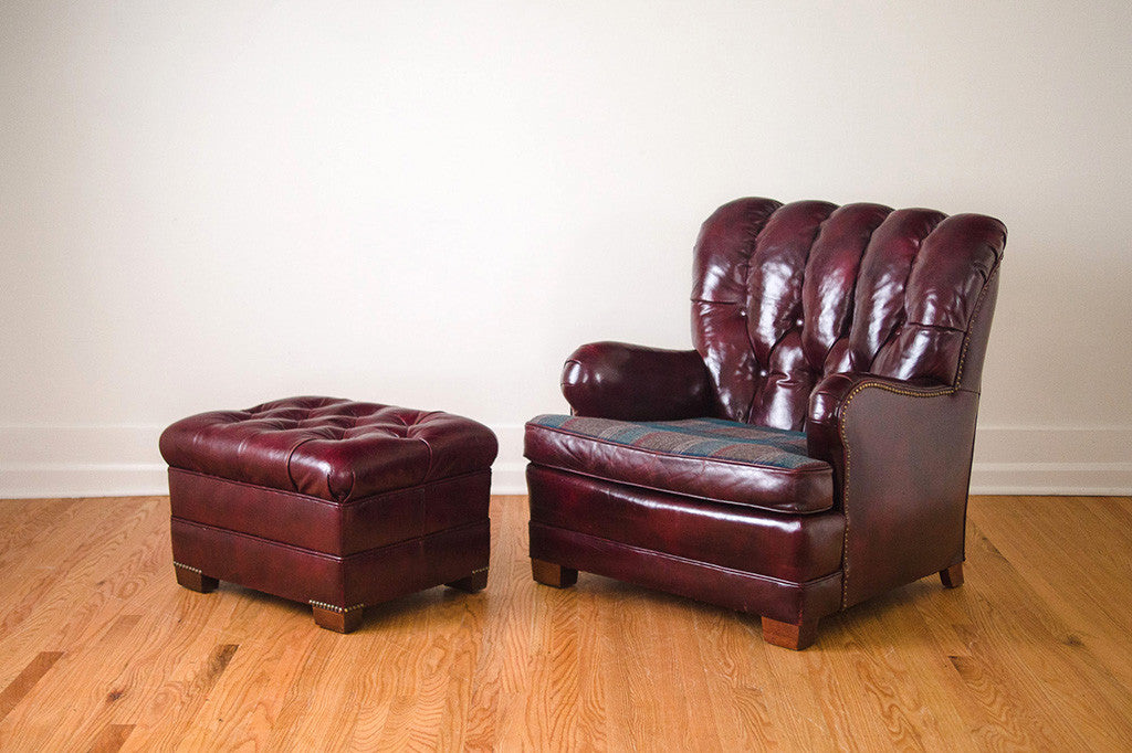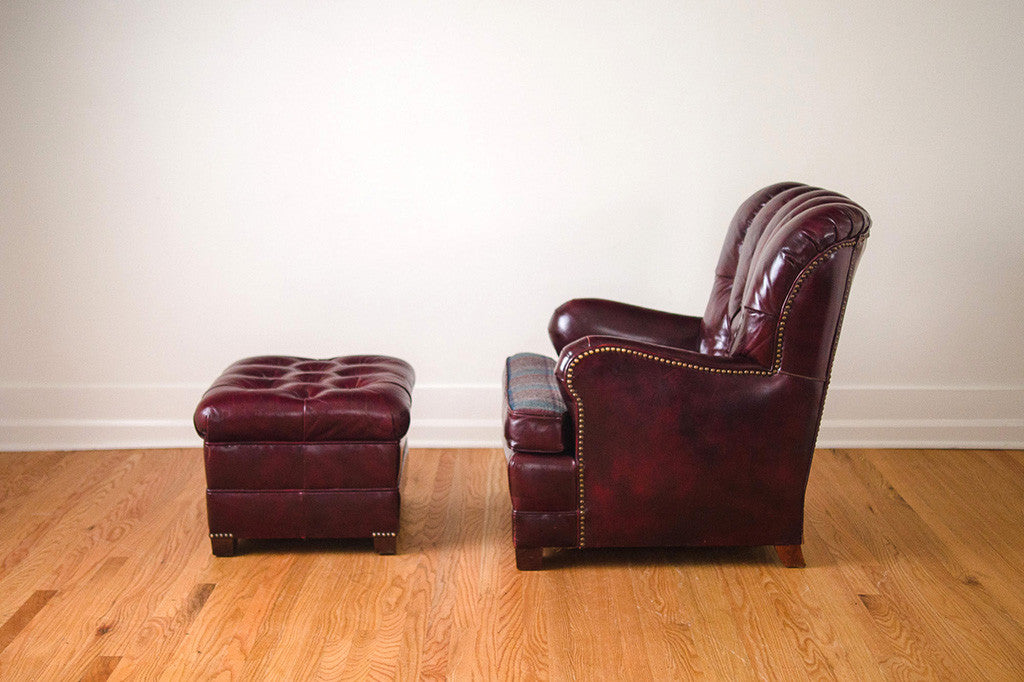 This handsome vintage club chair set was manufactured by Schafer Brothers. It has burgundy leather upholstery, brass nailhead trim and wood legs. The back rest and ottoman are tufted. The seat cushion has a new foam insert and was recently upholstered in a vintage Pendleton® wool blanket. This chair is in amazing shape with some light overall distressing. Please see pictures for detailed condition of these pieces.