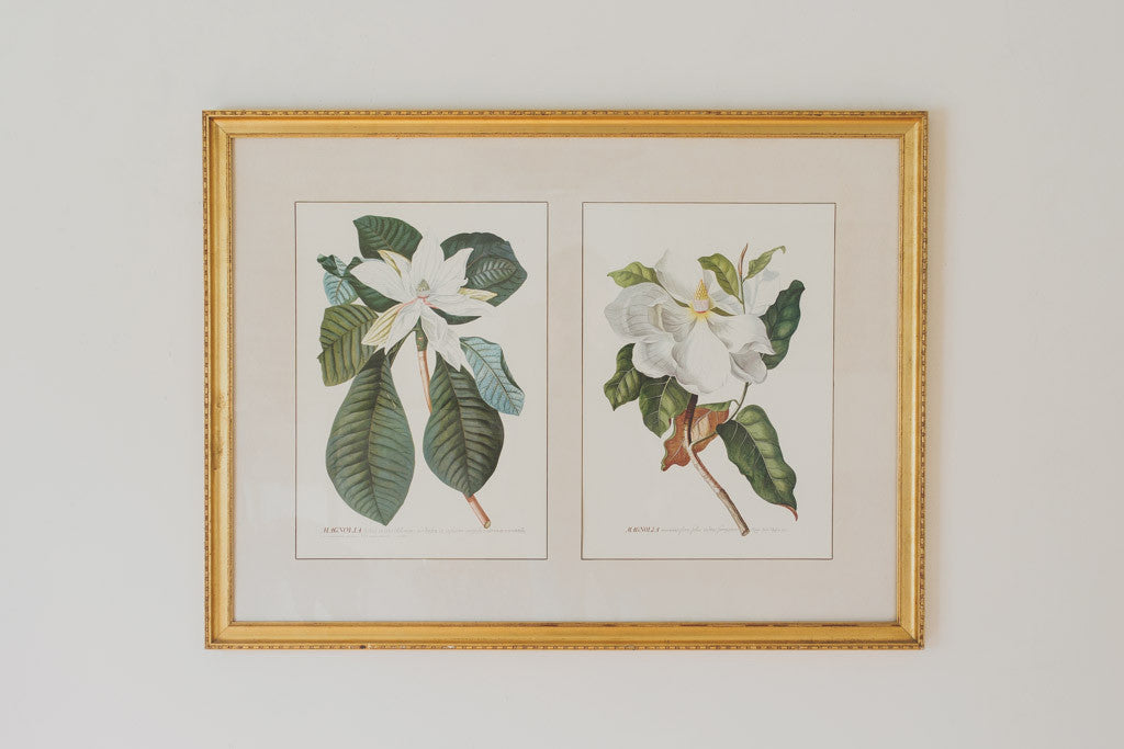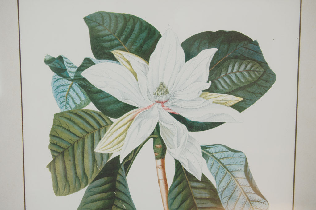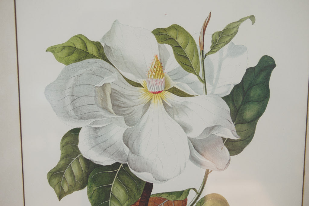 This large vintage botanical print has a gold frame and glass front, it shows two white magnolias with their latin classifications. It's in good overall shape and the frame has some age related wear. Please see pictures for detailed condition.