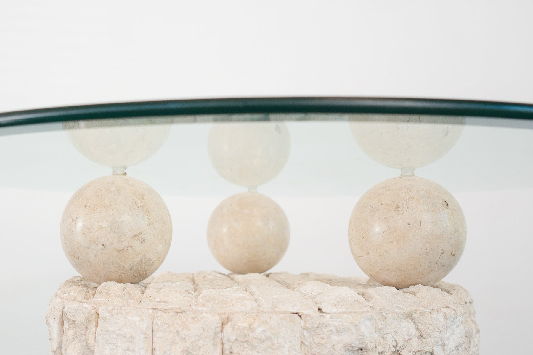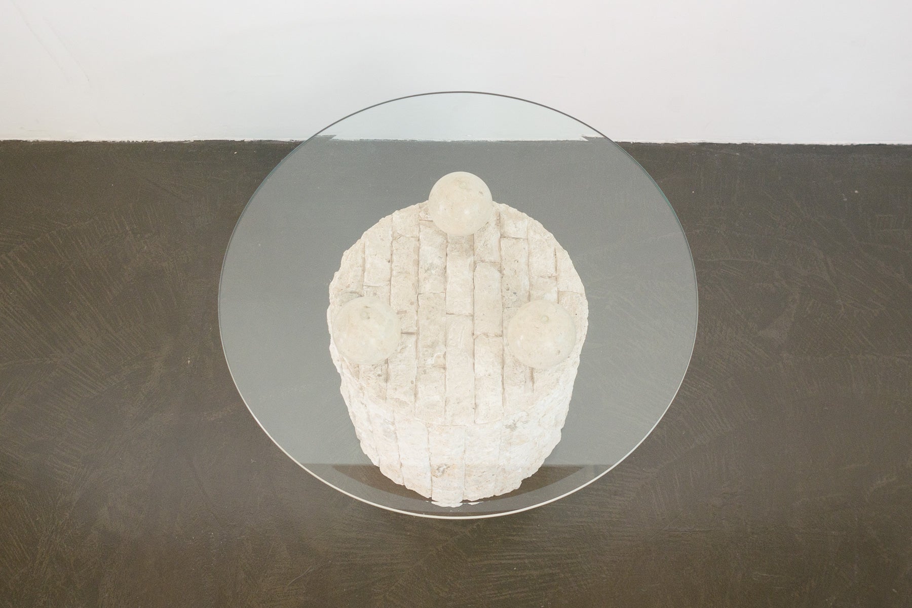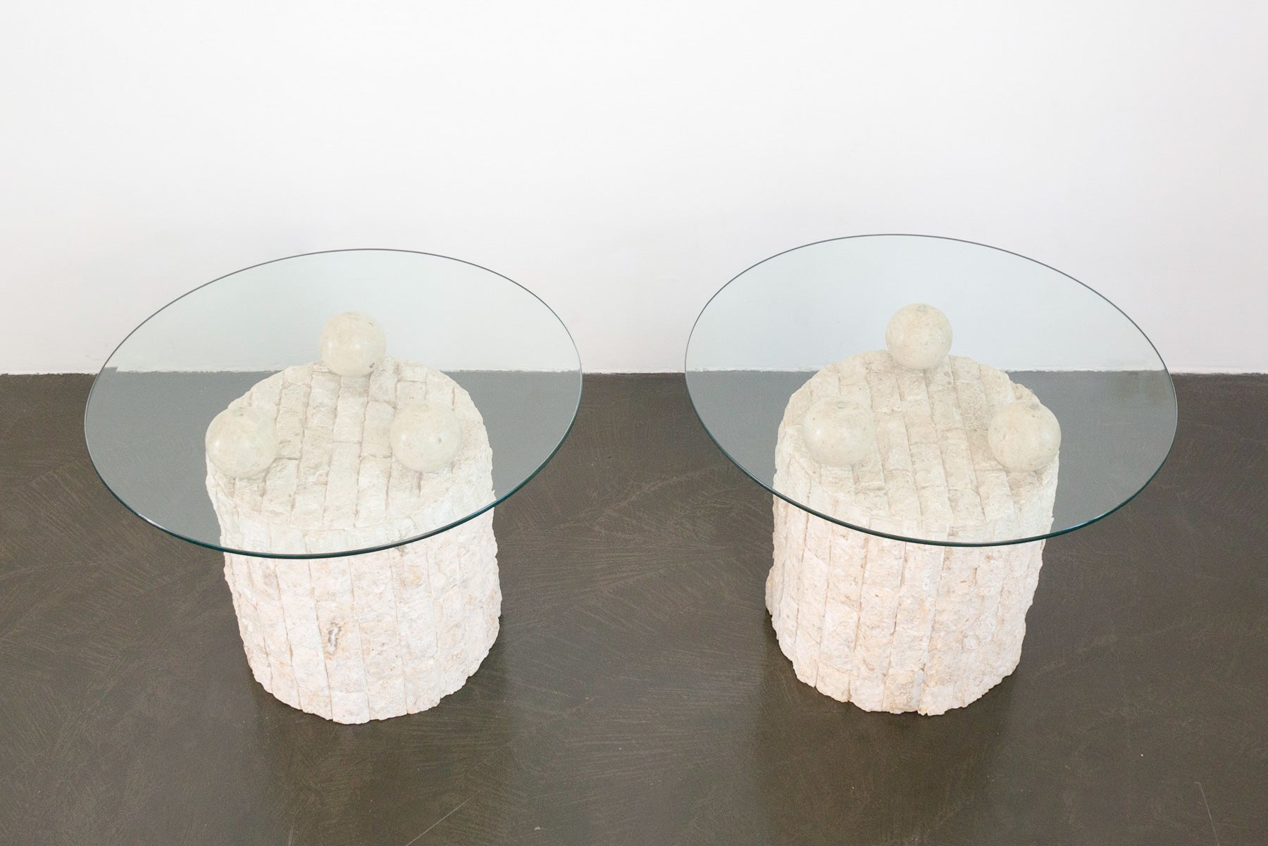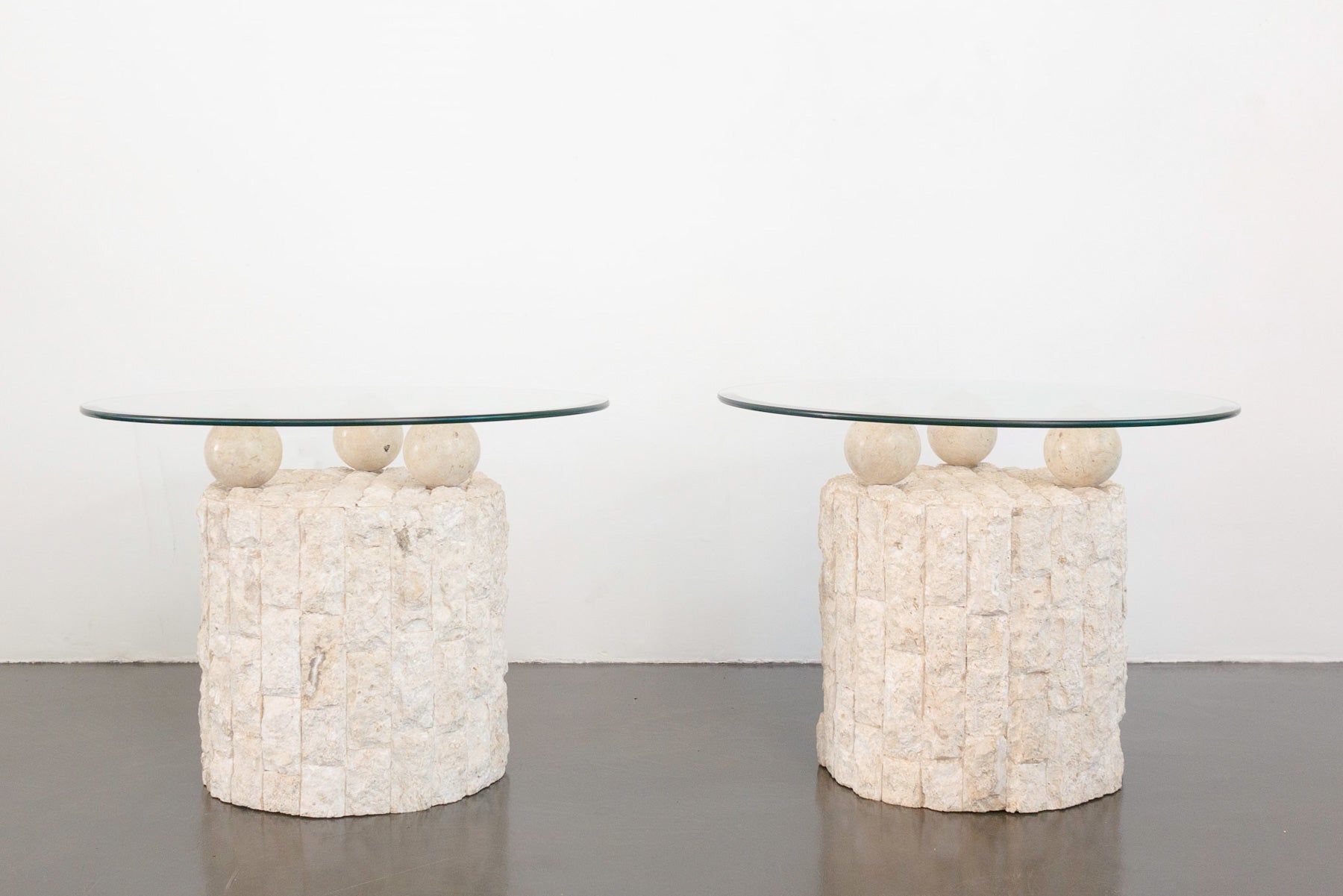 style: pair, modern, display, side table, end table material: stone (mactan and pastor), glass brand: Magnussen Ponte age: vintage condition: good, age related wear - see pictures other: priced as a pair