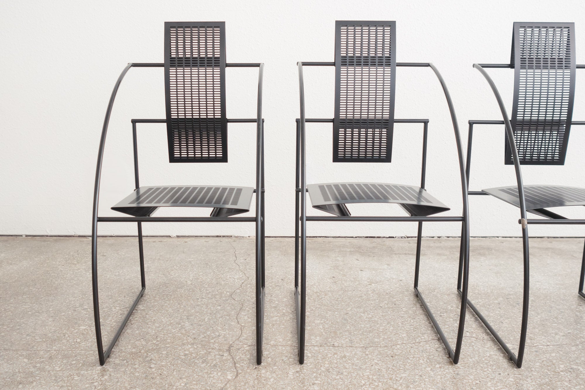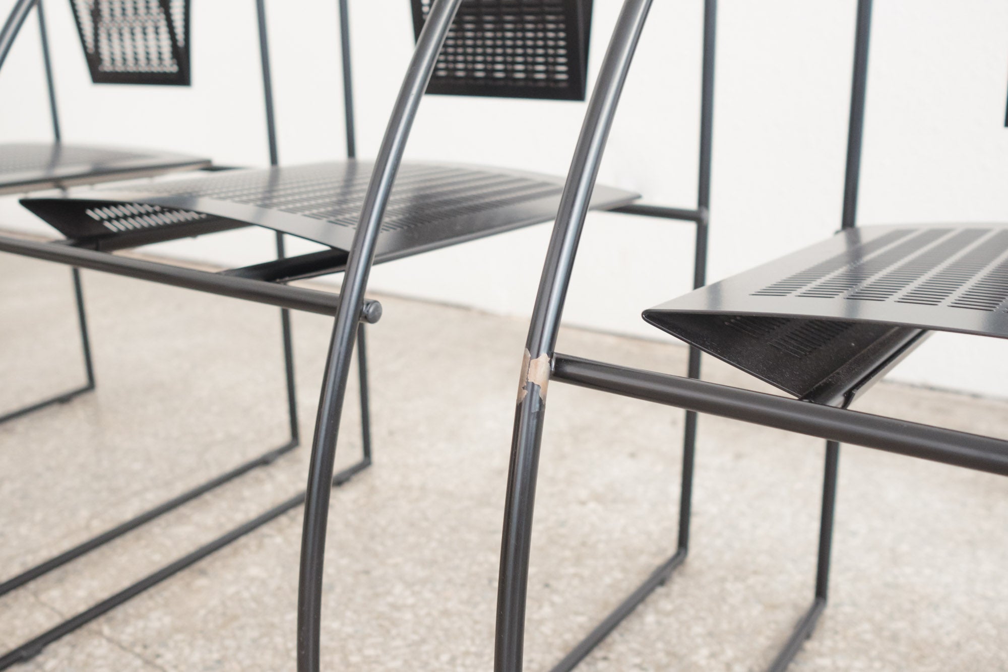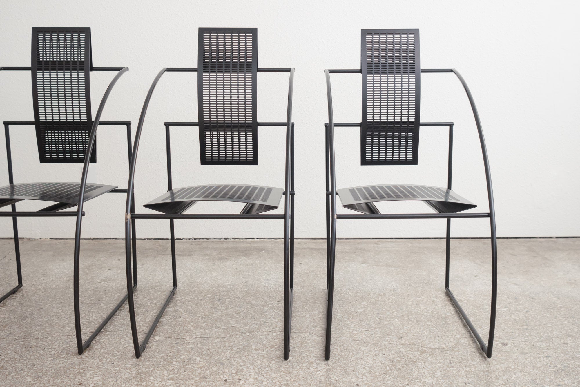 style: Mid Century, Modern, Quinta, dining, occasion, set of 4, chairs material: enameled steel brand: Alias Design designer: Mario Botta age: vintage, mid-80s condition: good, age related wear - see pictures